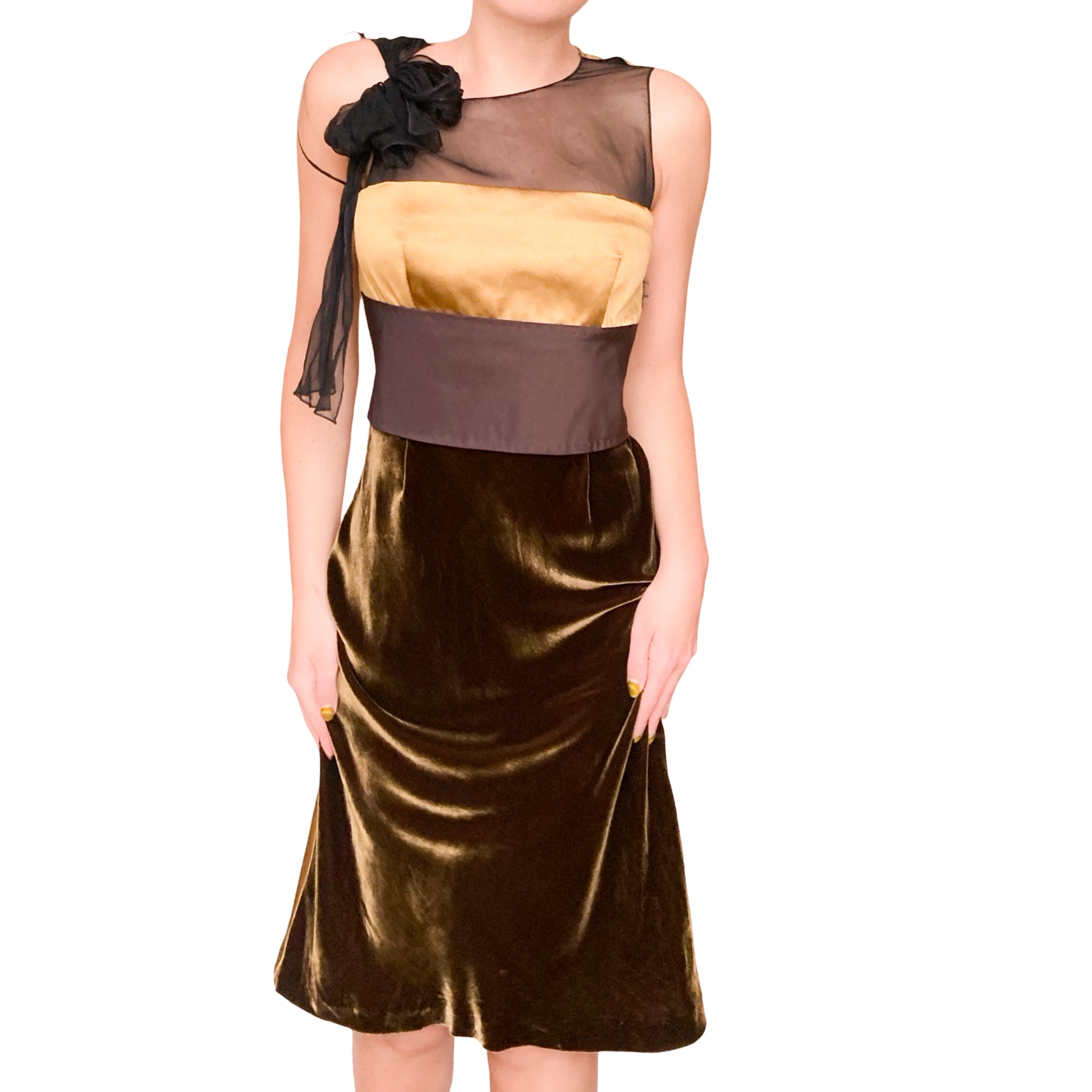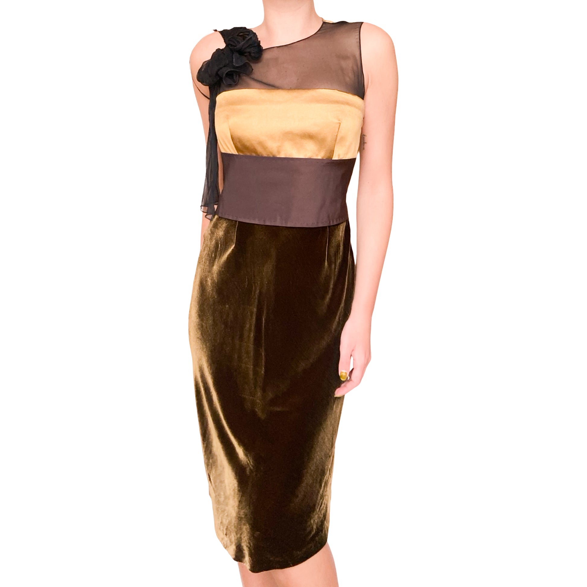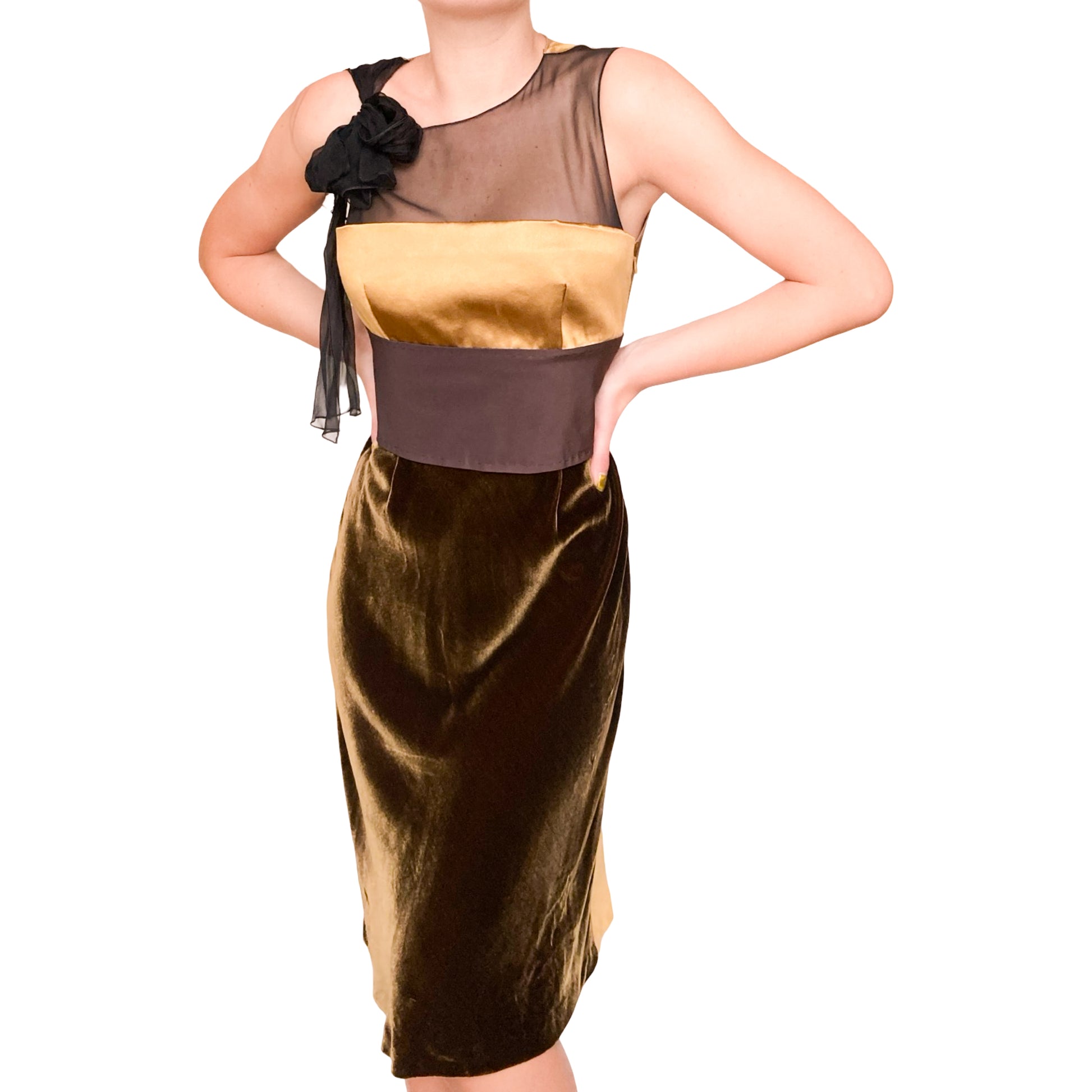 Super chic vintage Alberta Ferretti dress featuring a stunning blend of silk velvet and sheer details. This unique piece has a striking color-block design, accented by a delicate transparent shoulder detail and a back zipper closure. The back of this dress features liquid gold silk with a striking brown stripe along the spine, creating a captivating contrast. It's sooo hot ! An elegant nod to timeless Italian style.