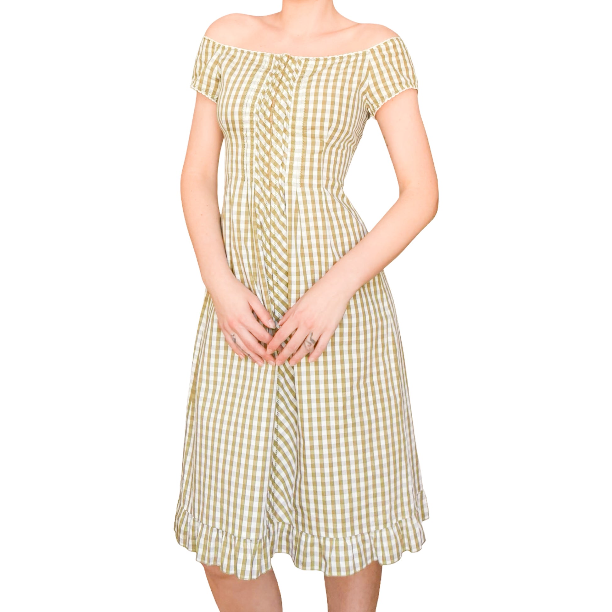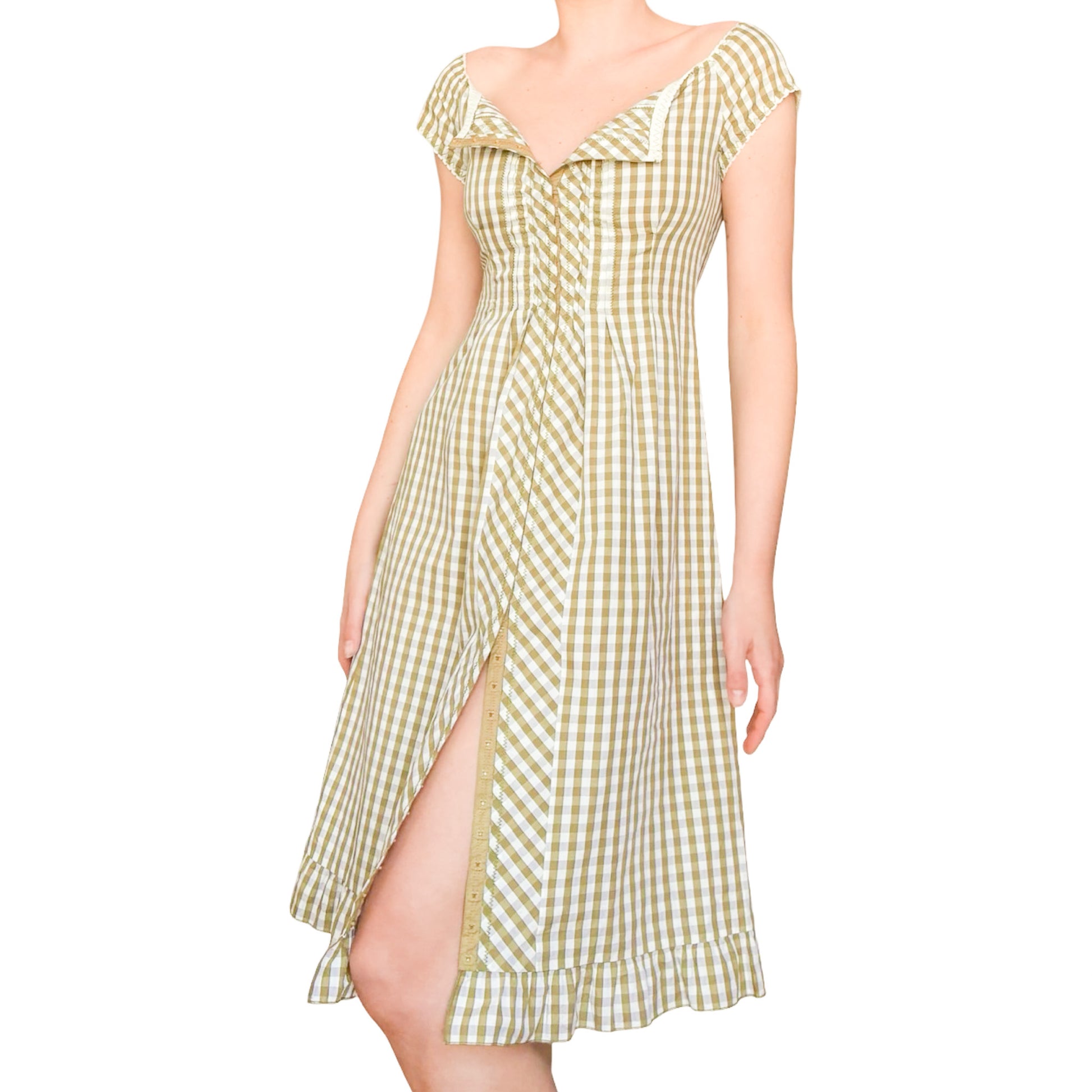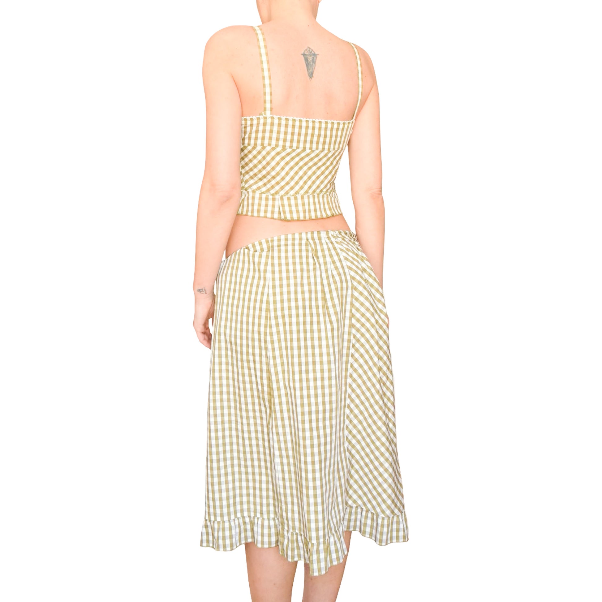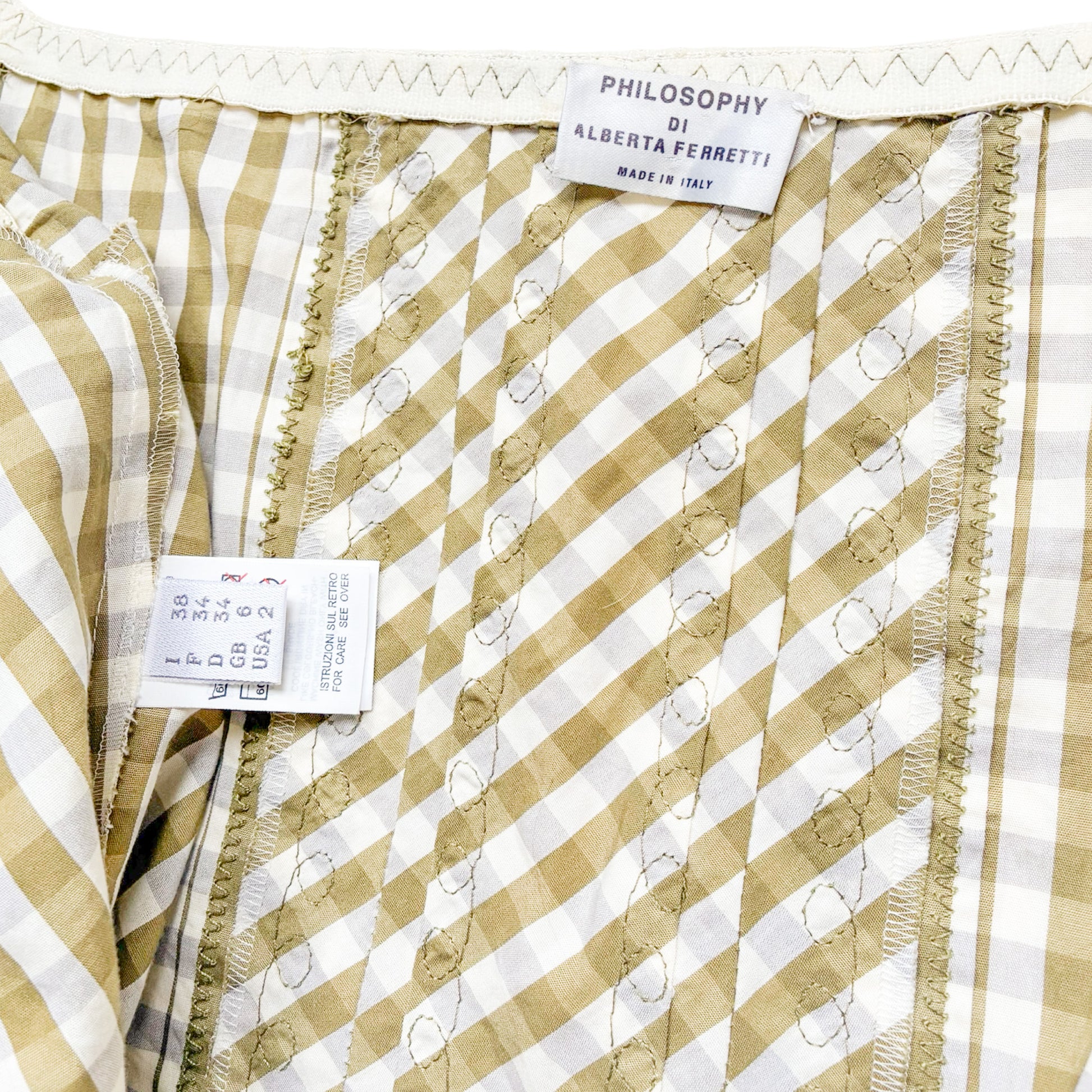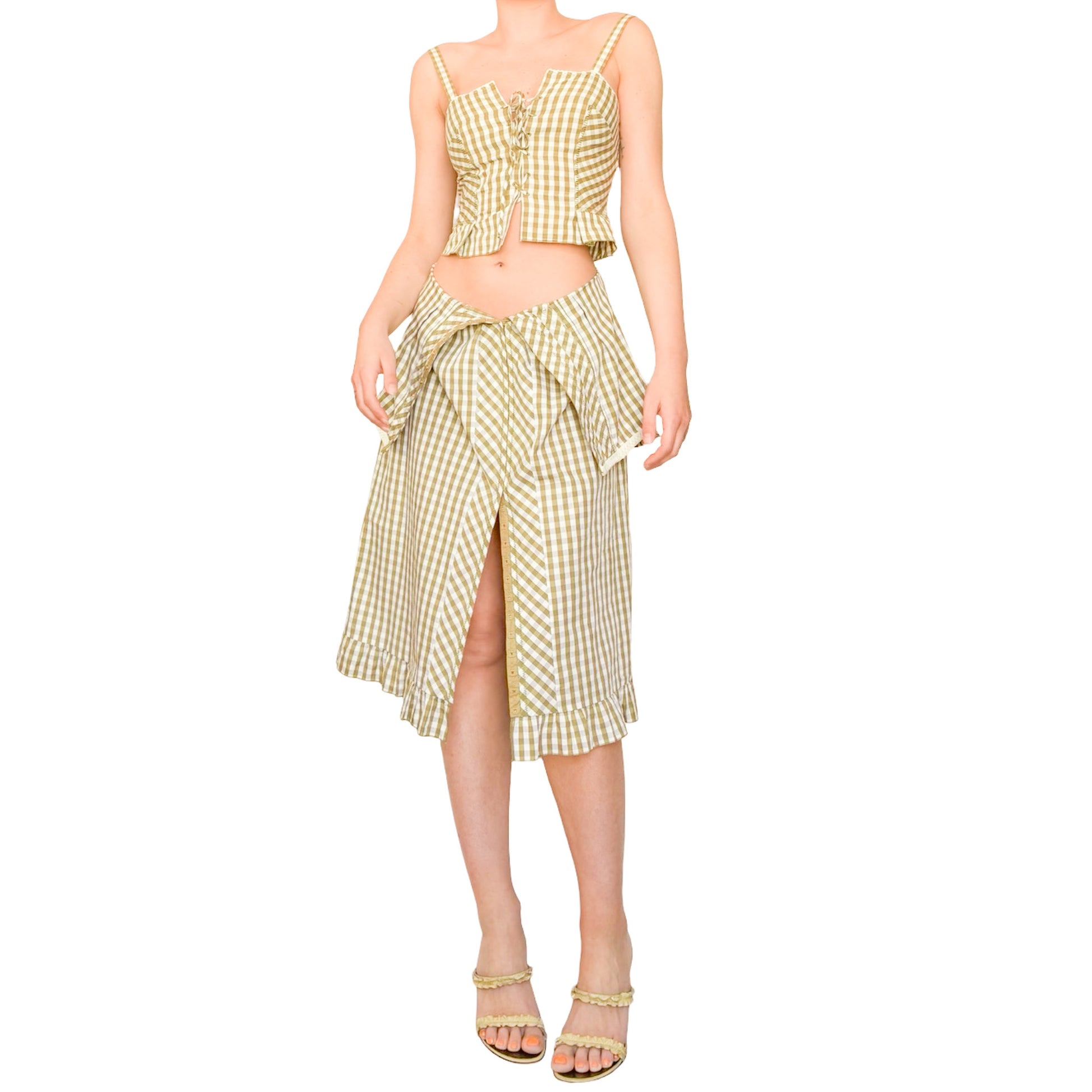 Seen on the Spring 2000 runway, this gingham dress by Philosophy di Alberta Ferretti is a true modular piece. Fully fastened from neckline to hem with hidden closures, it can be worn open or closed to play with neckline depth or leg slit. The elasticated sleeves allow for both on-shoulder and off-shoulder styling, while soft ruffles at the edges add a poetic finish. Pair it with the matching bustier also available in the shop, underneath as a layered set, or style the dress as a voluminous midi skirt for an unexpected two-piece twist.