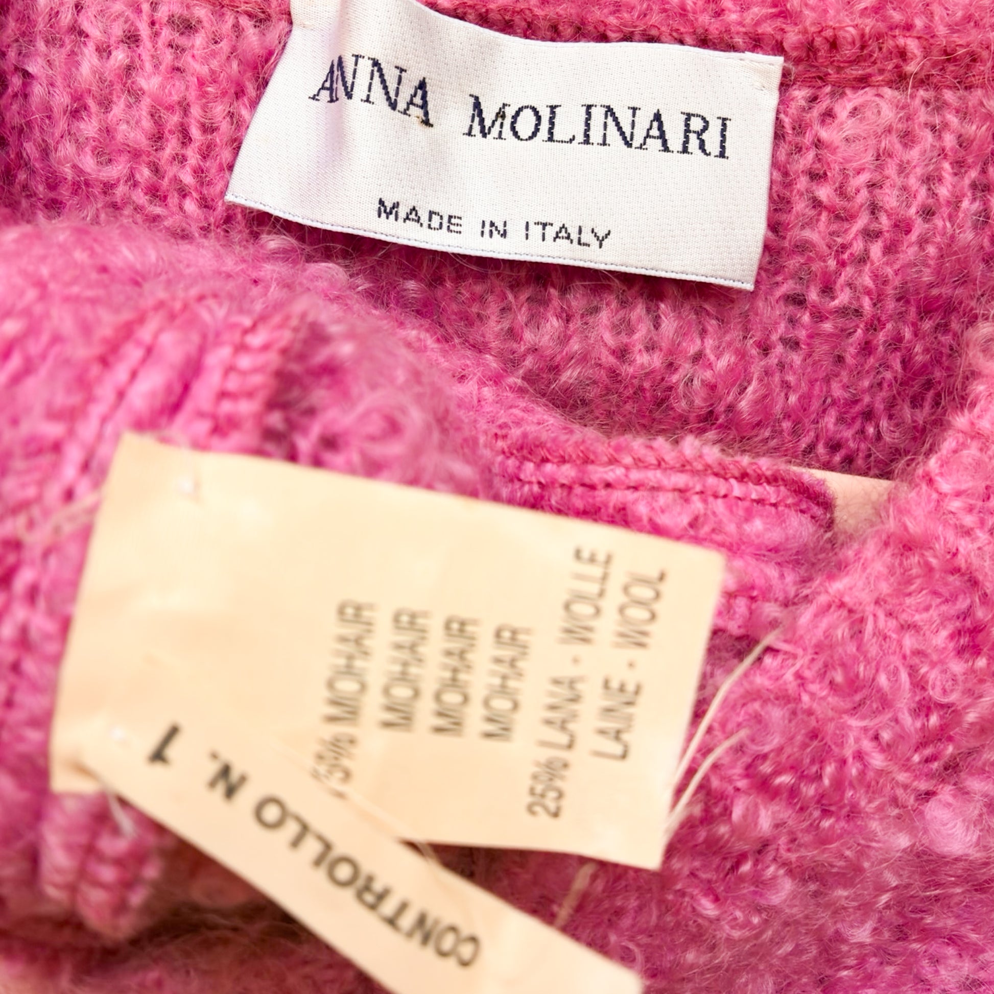 Maxi sweater or dress in vibrant pink mohair blend, knitted with a soft fuzzy texture. Features a V neckline, long flared sleeves and a slightly A-line silhouette that can be worn loose or belted for shape. Iconic 1990s Anna Molinari ( Blumarine designer & founder ) piece, documented on the Fall 1996 runway. (not itchy)