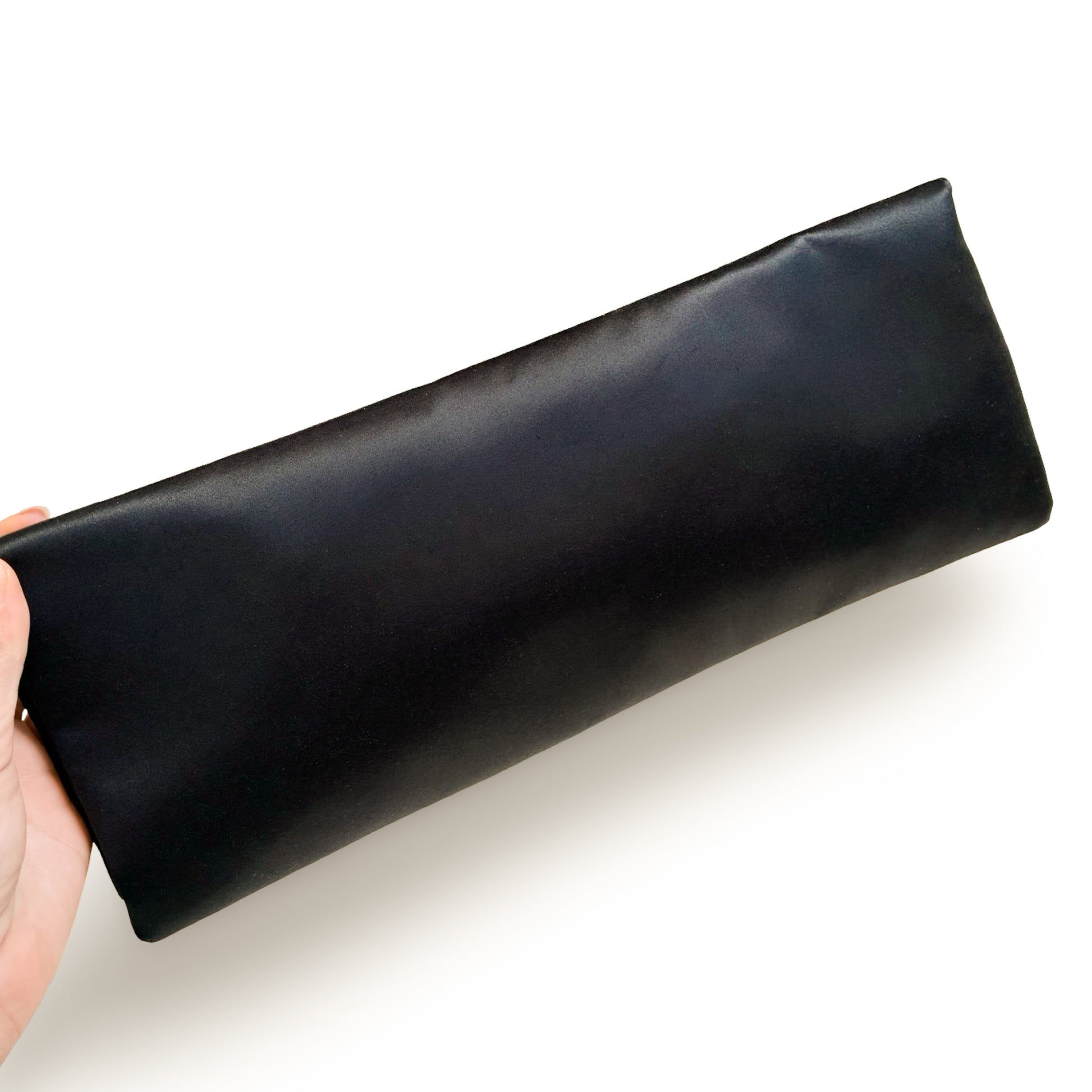 Archival pochette from Blumarine’s Spring 2000 runway, crafted in lustrous black satin and detailed with embroidered oriental floral and cloud appliqués in shades of red, cream, and blue. The elongated rectangular silhouette is so elegant. A rare collector’s piece directly tied to the runway aesthetic of the early 2000s, blending delicate craftsmanship with a bold statement finish.