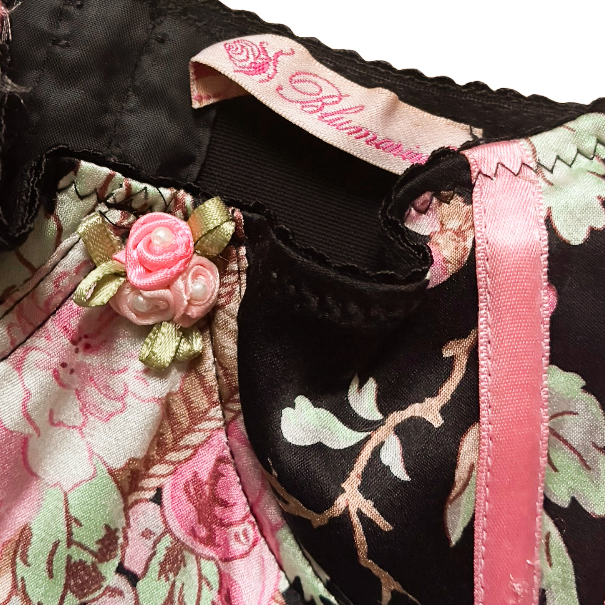 This exquisite Blumarine corset from the early 2000s is crafted from lustrous black silk satin featuring a romantic print of soft pink roses and golden musical instruments. The structured, boned bodice is accented by contrasting pink ribbon trimmings and delicate halter straps, creating a refined "lingerie-as-outerwear" silhouette with an elegant sweetheart neckline. Super stretchy & flattering. Extremely rare ! 3 ranges of fasteners.