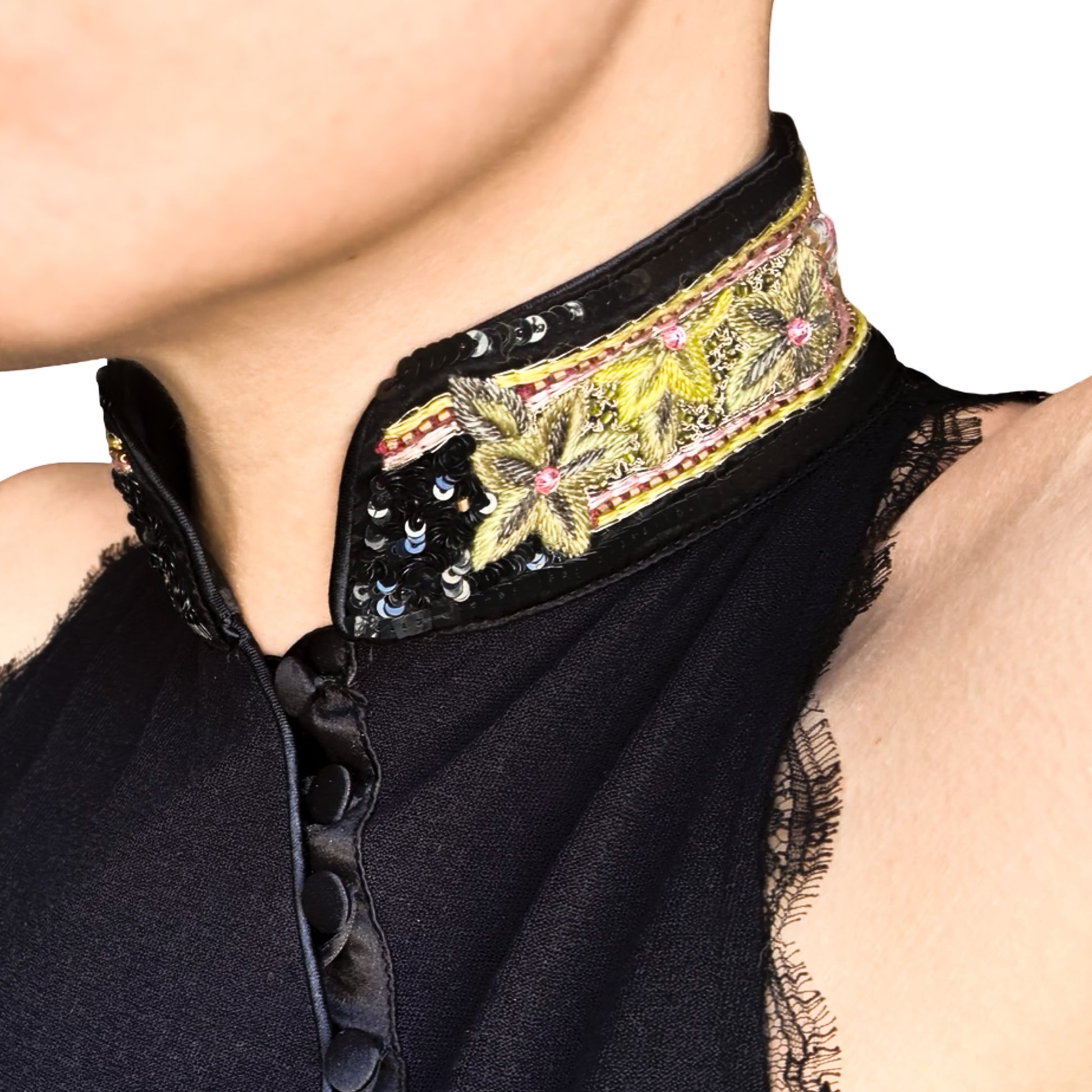 This ultra-rare archival piece features an exquisite hand-embroidered mandarin collar adorned with sequins and an asymmetrical satin button placket. Crafted from a luxurious, high-stretch silk-blend knit, the top balances a sleek silhouette with a breathtaking open back covered in delicate sheer lace. While the pink version graced the Spring 2003 runway, this black edition is an exceptionally scarce find, becoming nearly impossible to source after years of curated collecting.