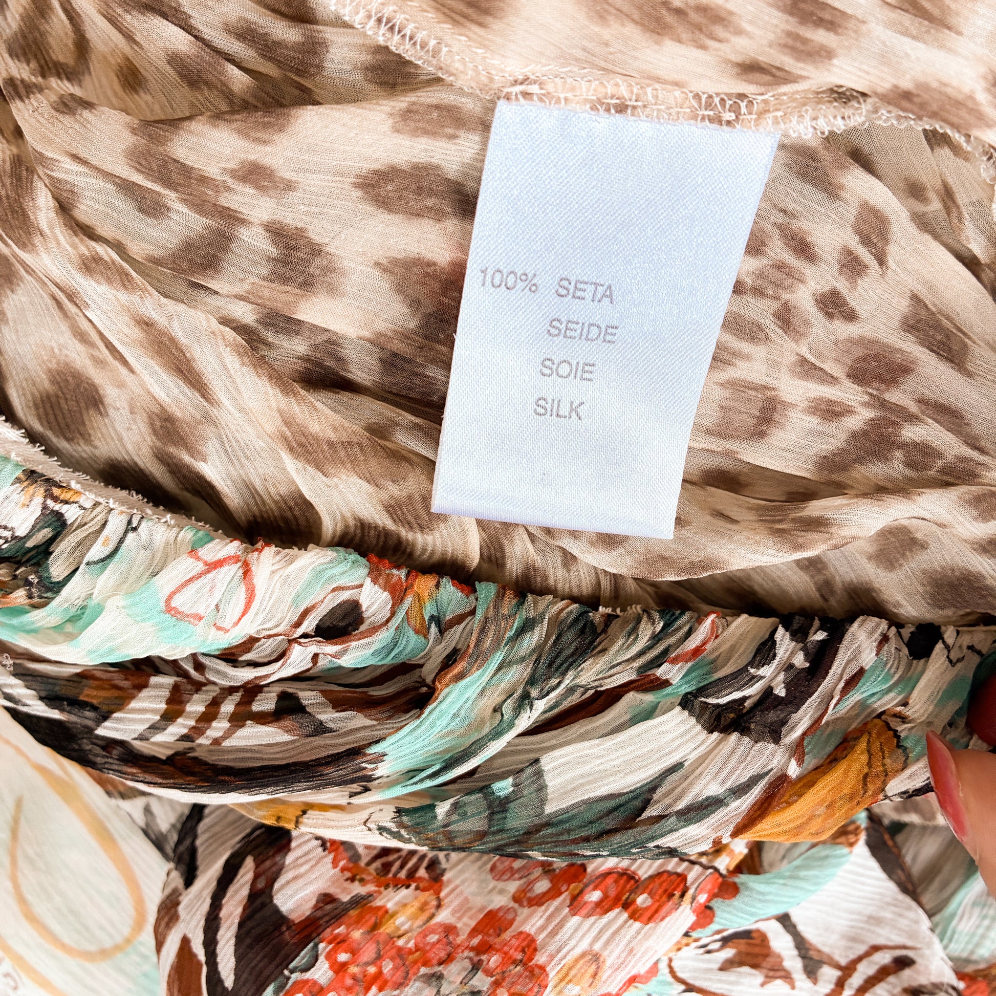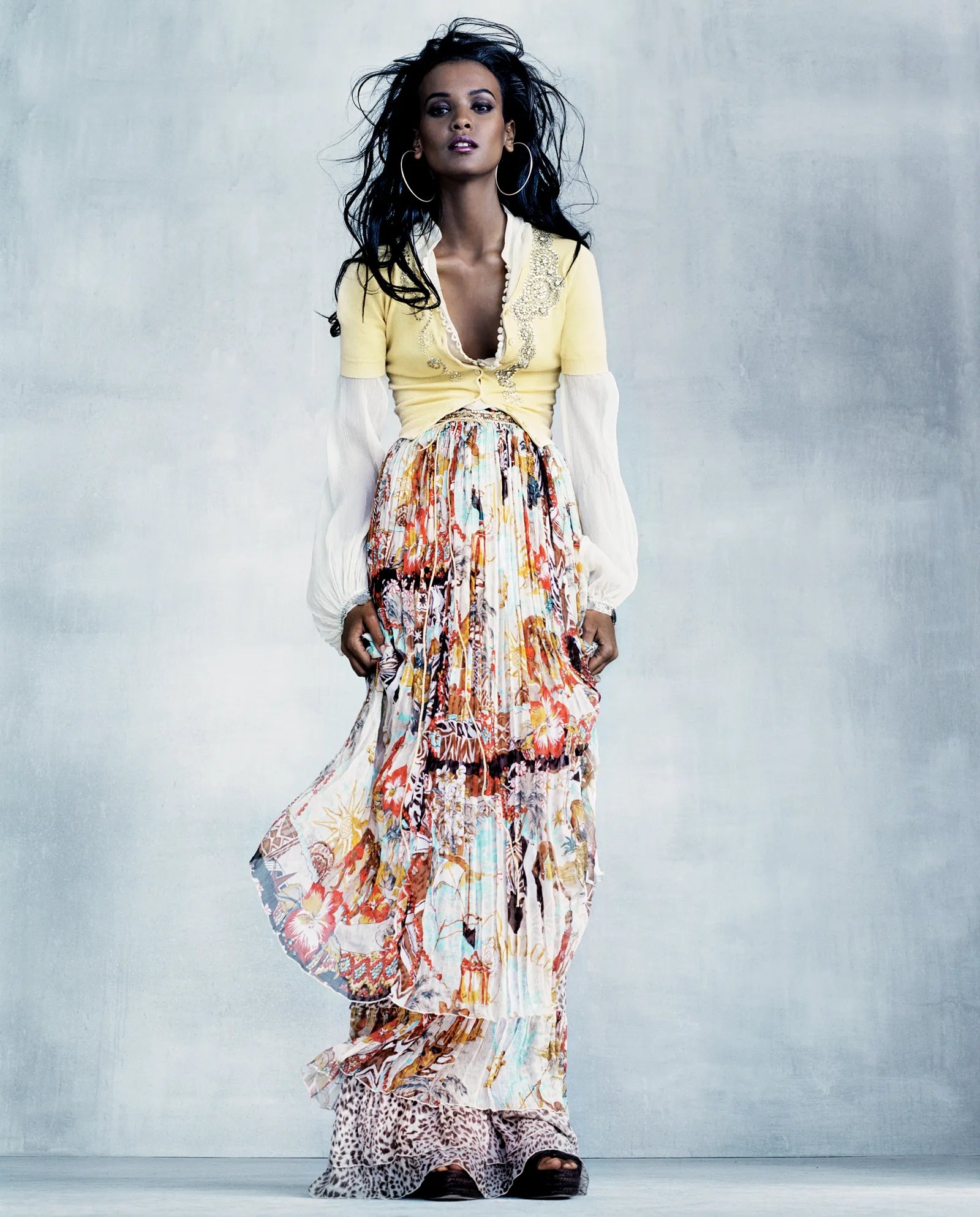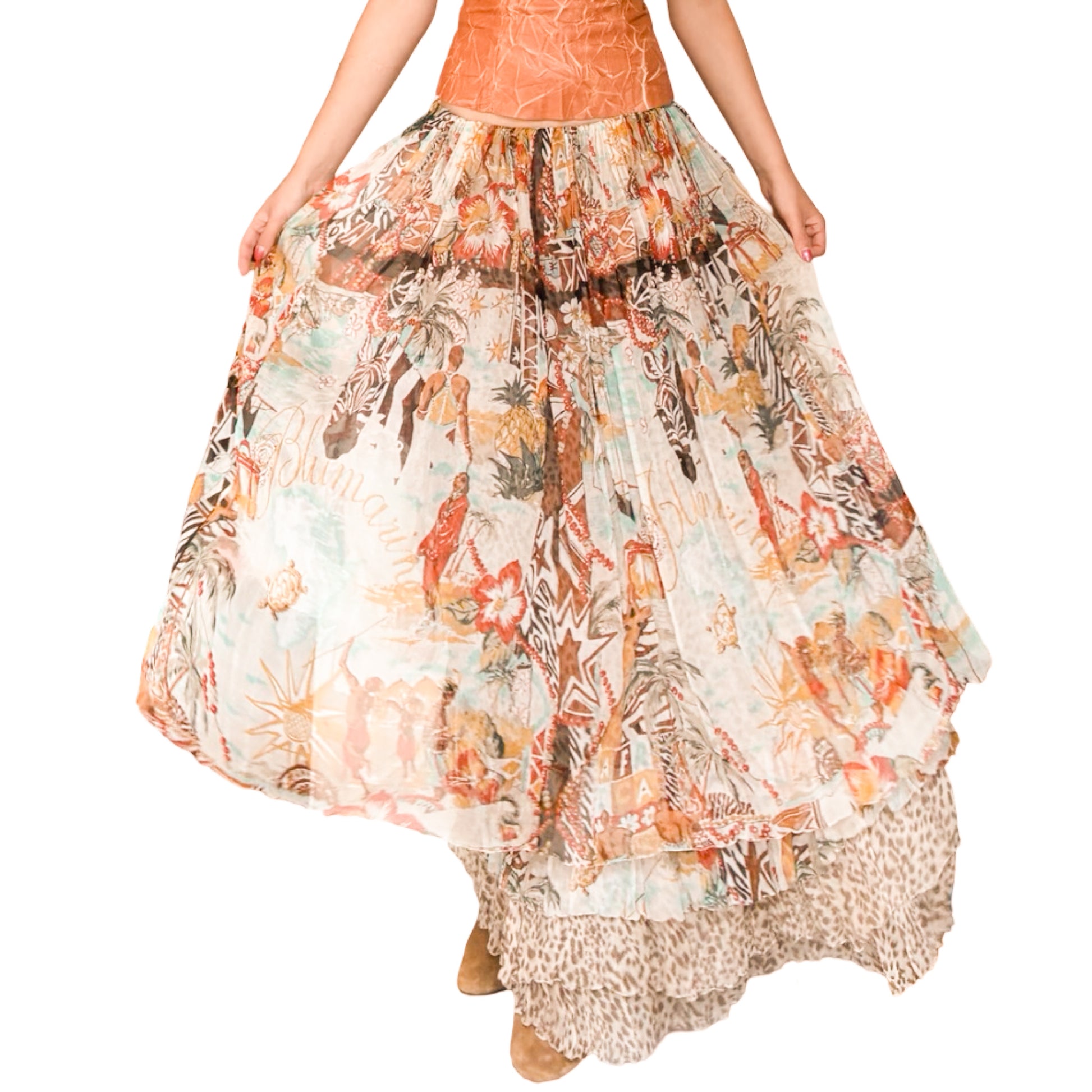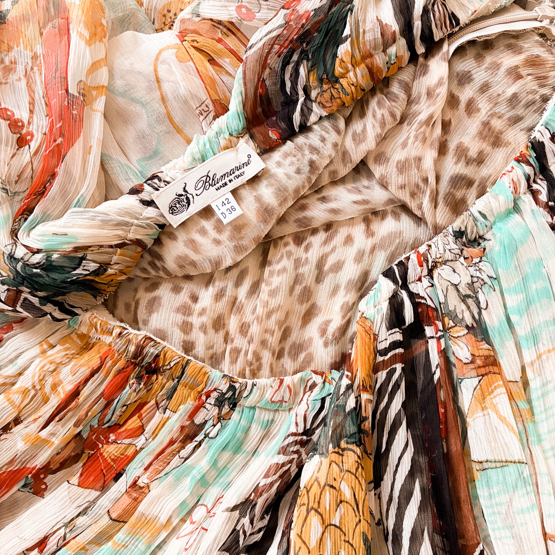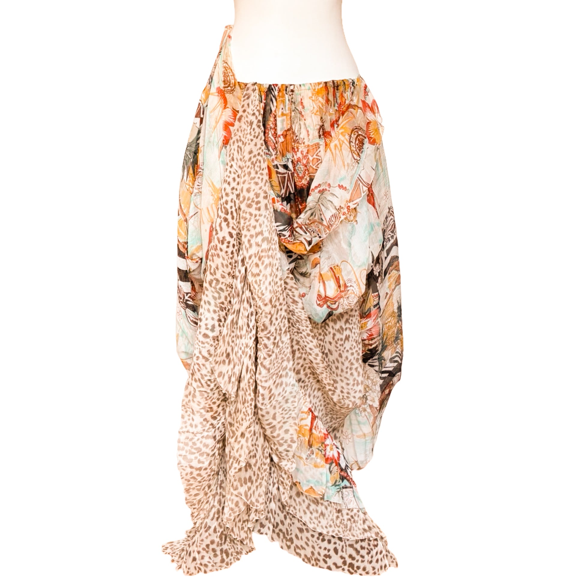 Blumarine runway piece from the Spring 2005 collection, this voluminous silk maxi skirt captures the brand’s ethereal yet daring spirit. Crafted in multiple sheer layers of silk. The print blends bold ethnic motifs with a bohemian flair, accented by vibrant florals, zebras, and tribal-inspired graphics, and is finished with a contrasting leopard silk underlayer visible at the hem. The Blumarine signature is integrated within the print as part of the design’s storytelling. Seen on the runway and throughout the season’s campaign editorials, this skirt stands as one of the most emblematic pieces of the collection. Extremely rare !