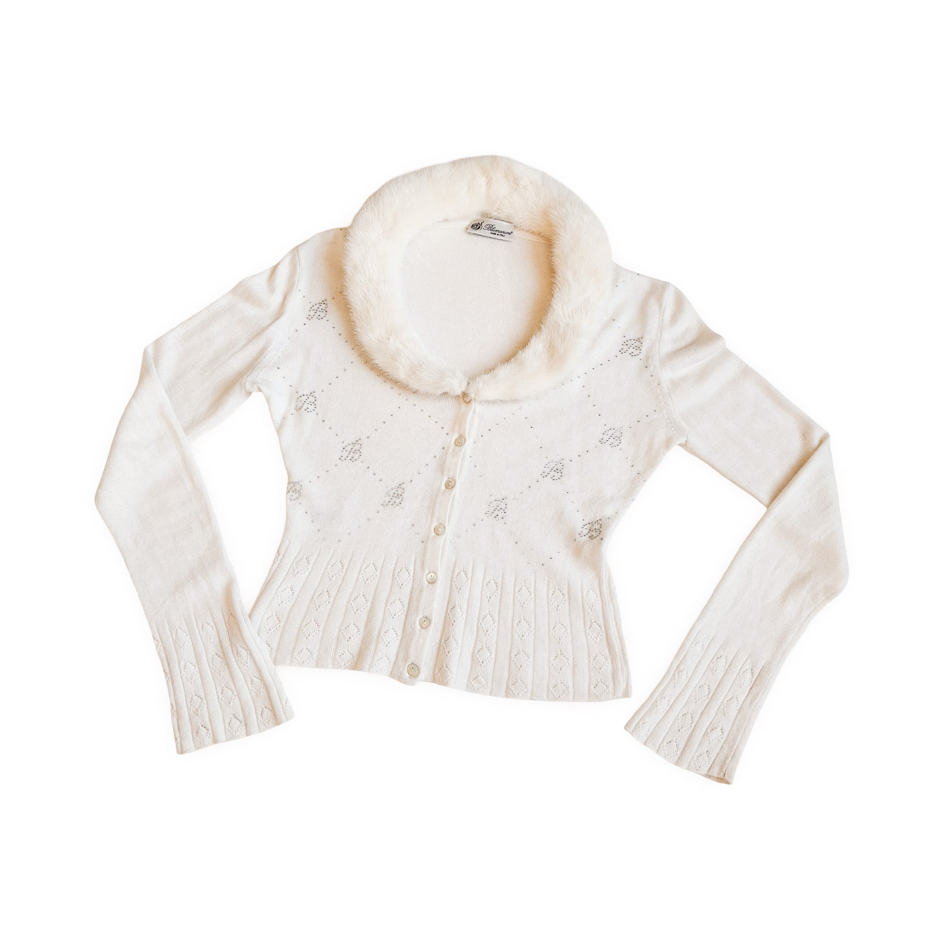 Blumarine cashmere cardigan from Spring 2005, seen on the runway in a cropped pink version. . Fitted silhouette, designed to be worn directly on the skin due to its exceptionally soft hand feel, or with a delicate bra subtly visible at the neckline. Features real mink fur trim along the collar and an all-over rhinestone monogram forming the Blumarine “B” logo. Front button closure, long sleeves with openwork knit detailing at the cuffs and hem. Impossible to find.