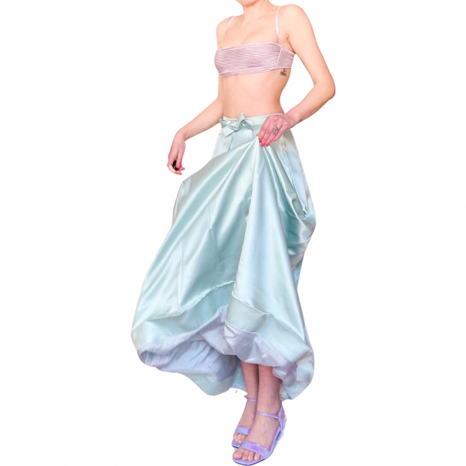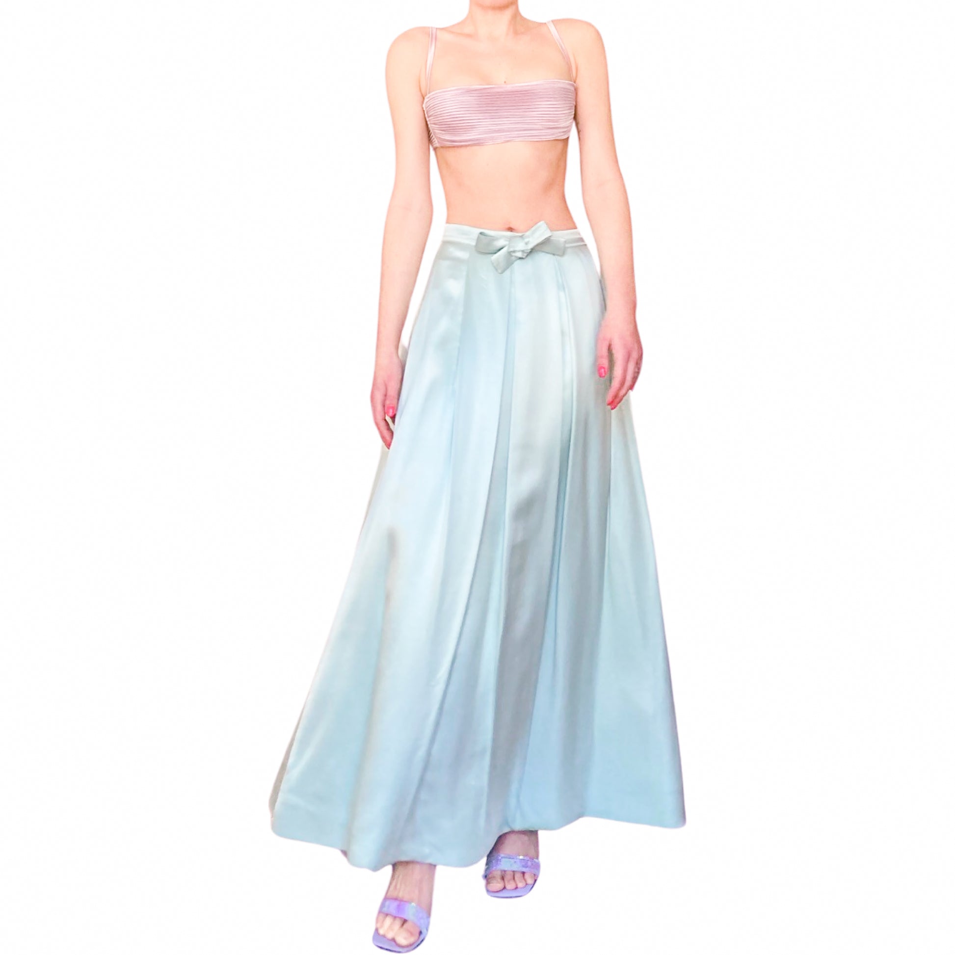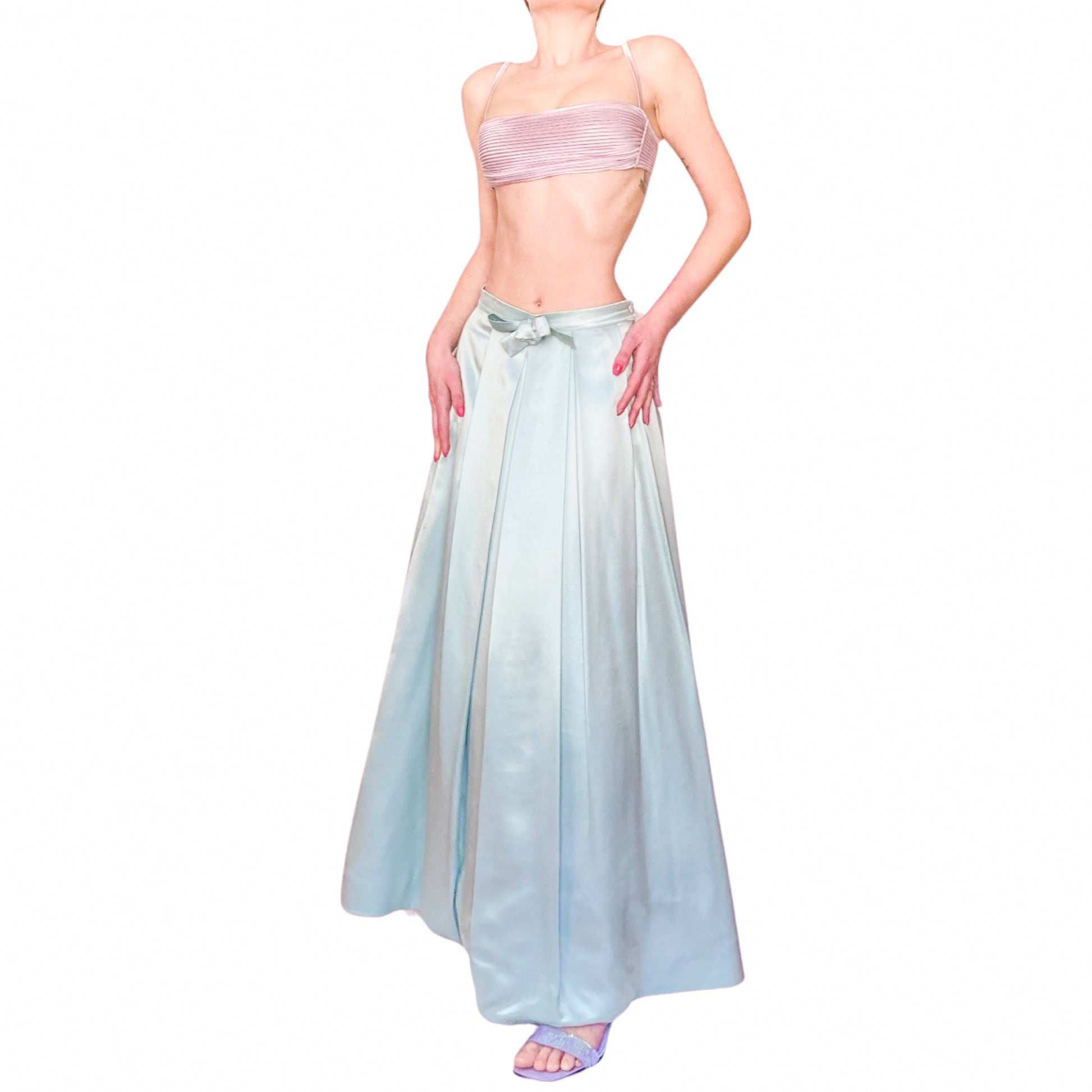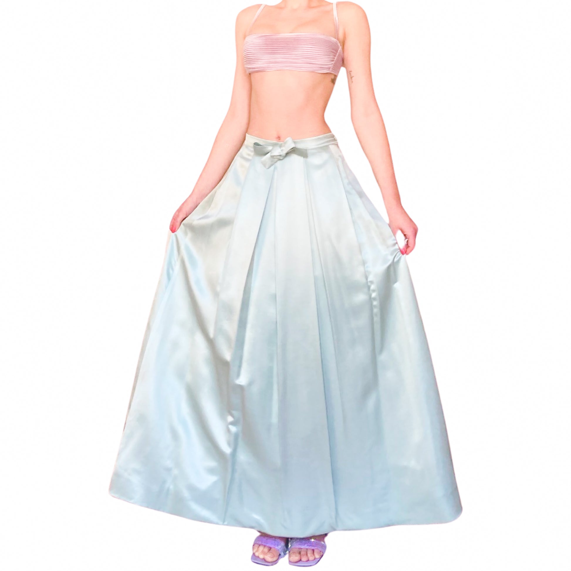 Dive into timeless elegance with our vintage Blumarine silk maxi luxurious skirt. This ethereal piece, reminiscent of a crinoline design, features a flattering cinched waist and a full, bouffant silhouette in a delicate pale aqua hue. Luxuriously lined for a graceful drape & fall. Complete with a detachable bow for versatile styling, this skirt is secured with a zipper and button closure for ease and security. Step into the allure of Blumarine's Fall/Winter 1999 collection and embrace the opulence of a bygone era. This icon was seen on the runway & shot for the official campaign too.