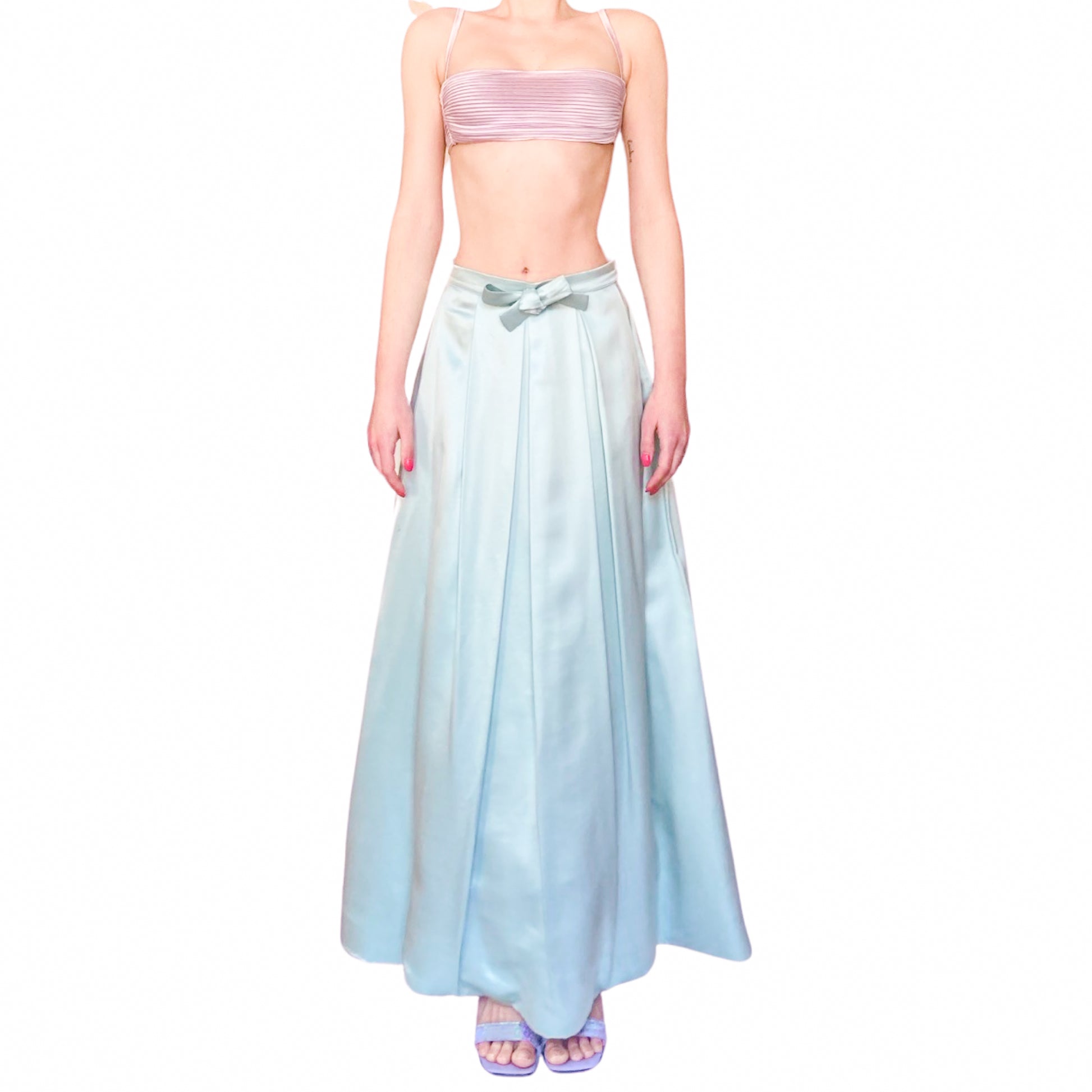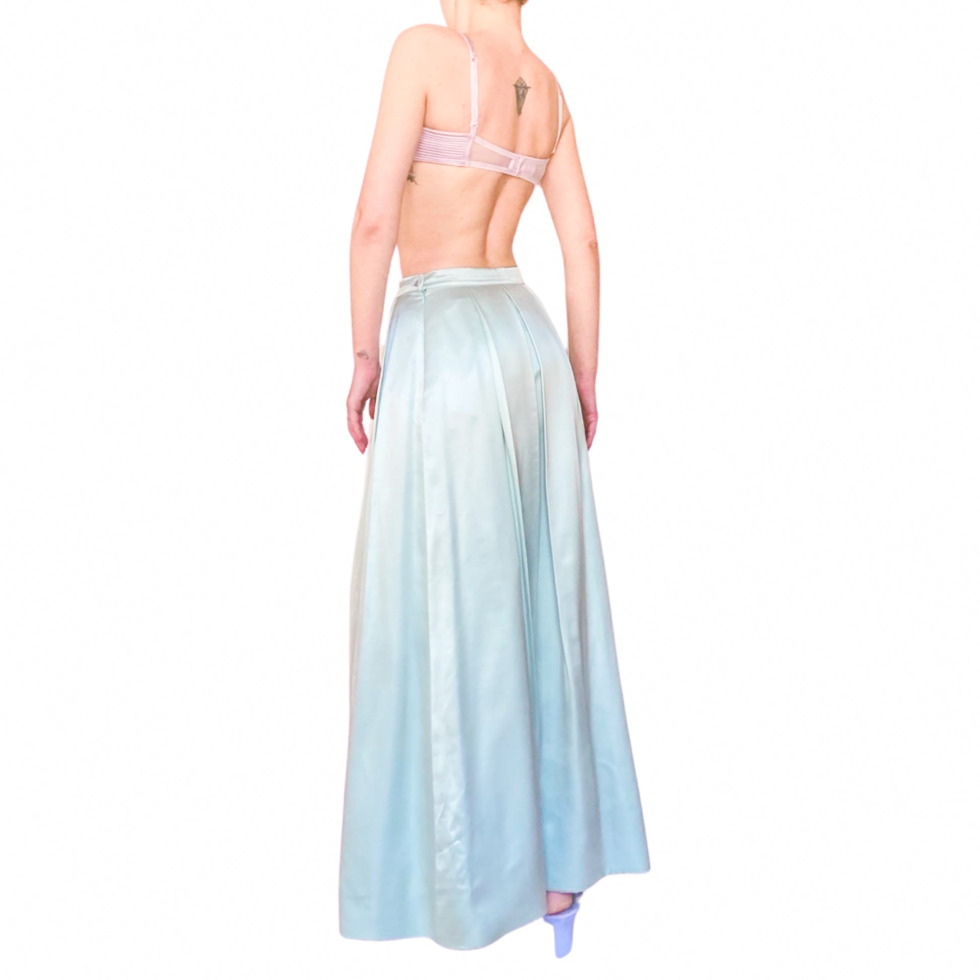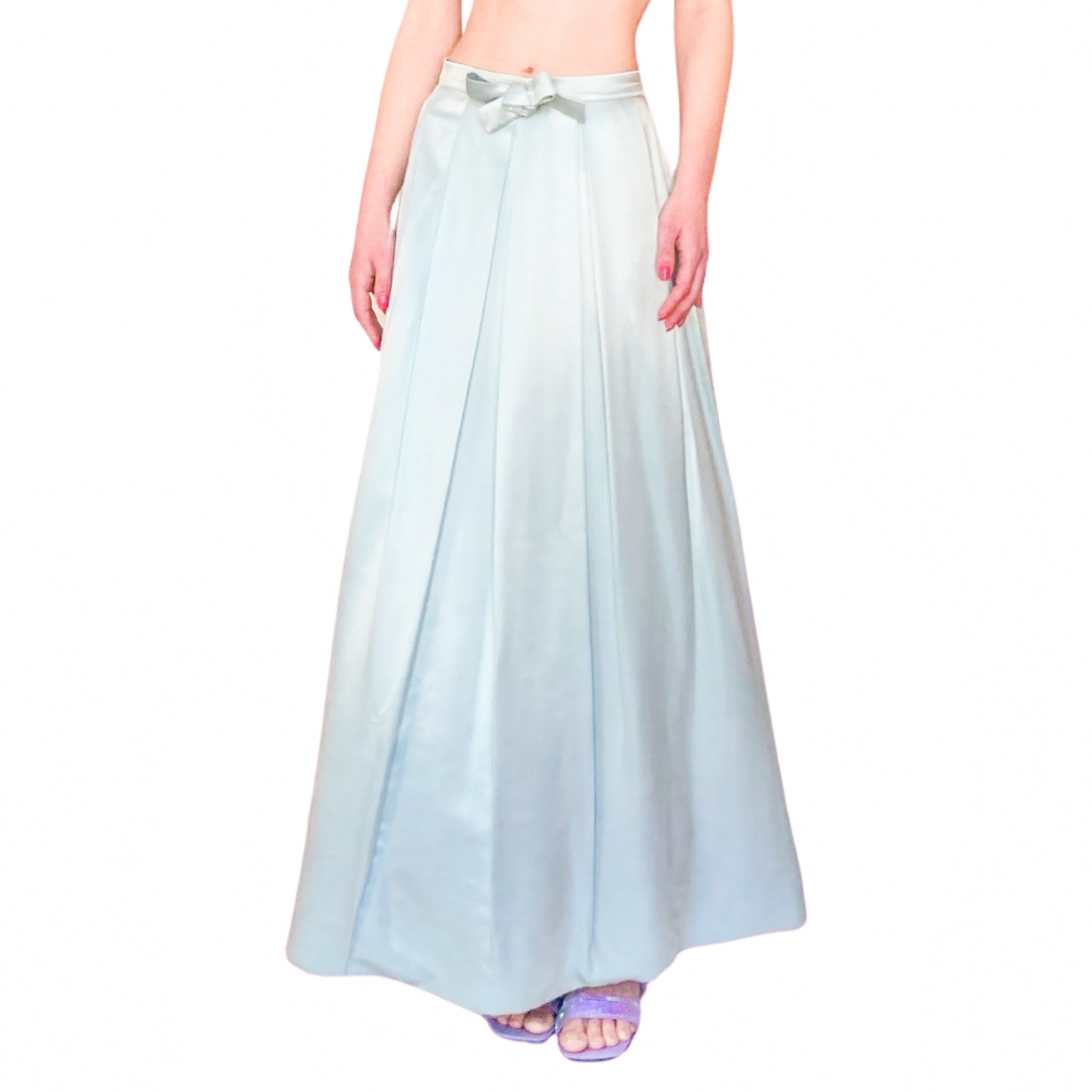 Dive into timeless elegance with our vintage Blumarine silk maxi luxurious skirt. This ethereal piece, reminiscent of a crinoline design, features a flattering cinched waist and a full, bouffant silhouette in a delicate pale aqua hue. Luxuriously lined for a graceful drape & fall. Complete with a detachable bow for versatile styling, this skirt is secured with a zipper and button closure for ease and security. Step into the allure of Blumarine's Fall/Winter 1999 collection and embrace the opulence of a bygone era. This icon was seen on the runway & shot for the official campaign too.