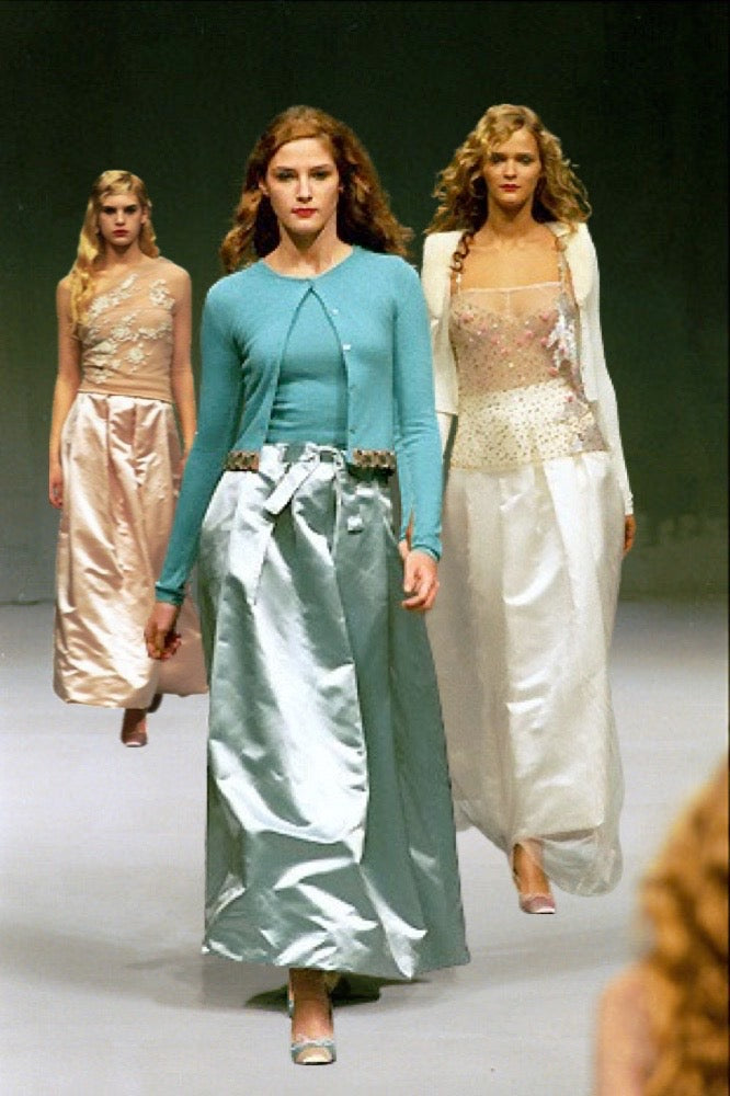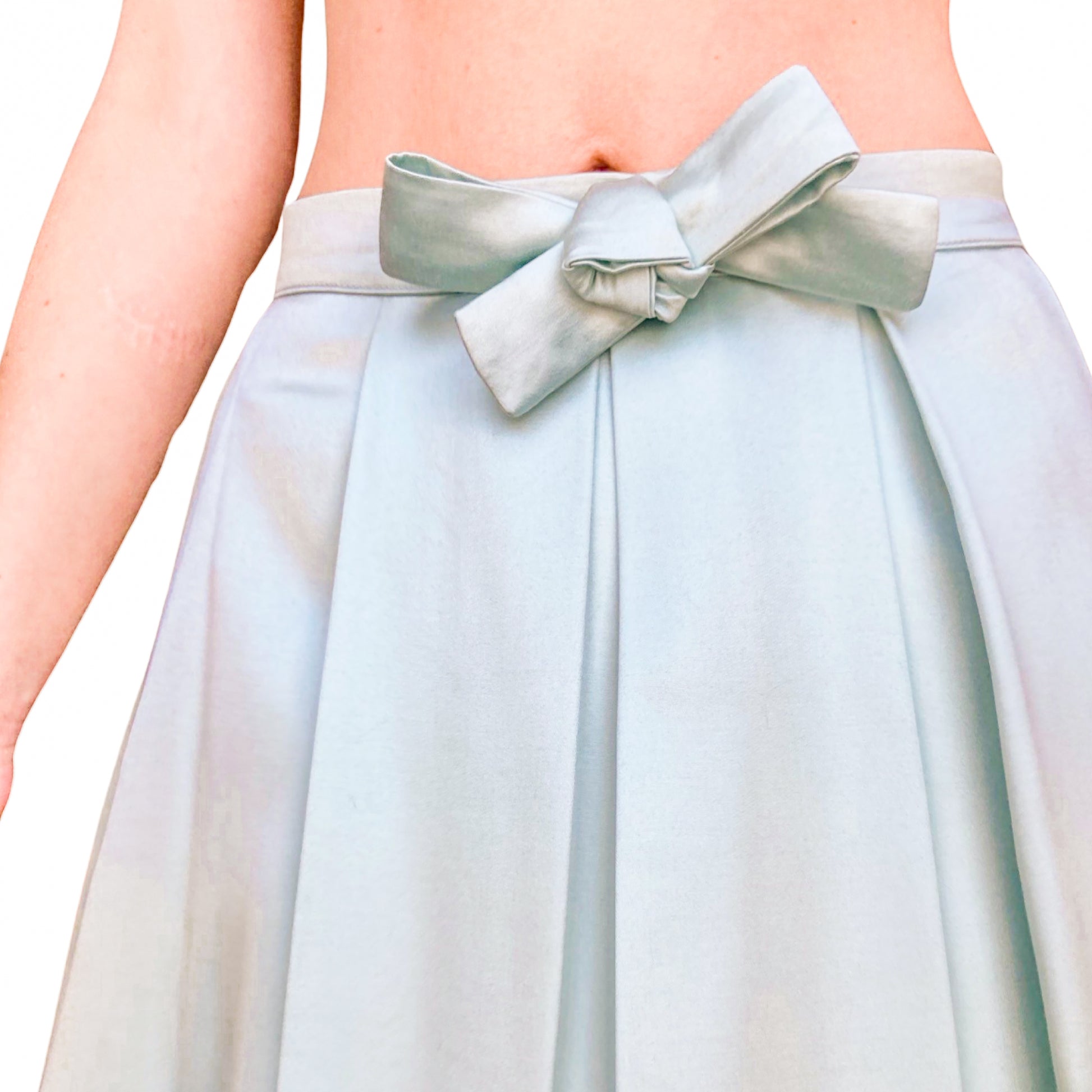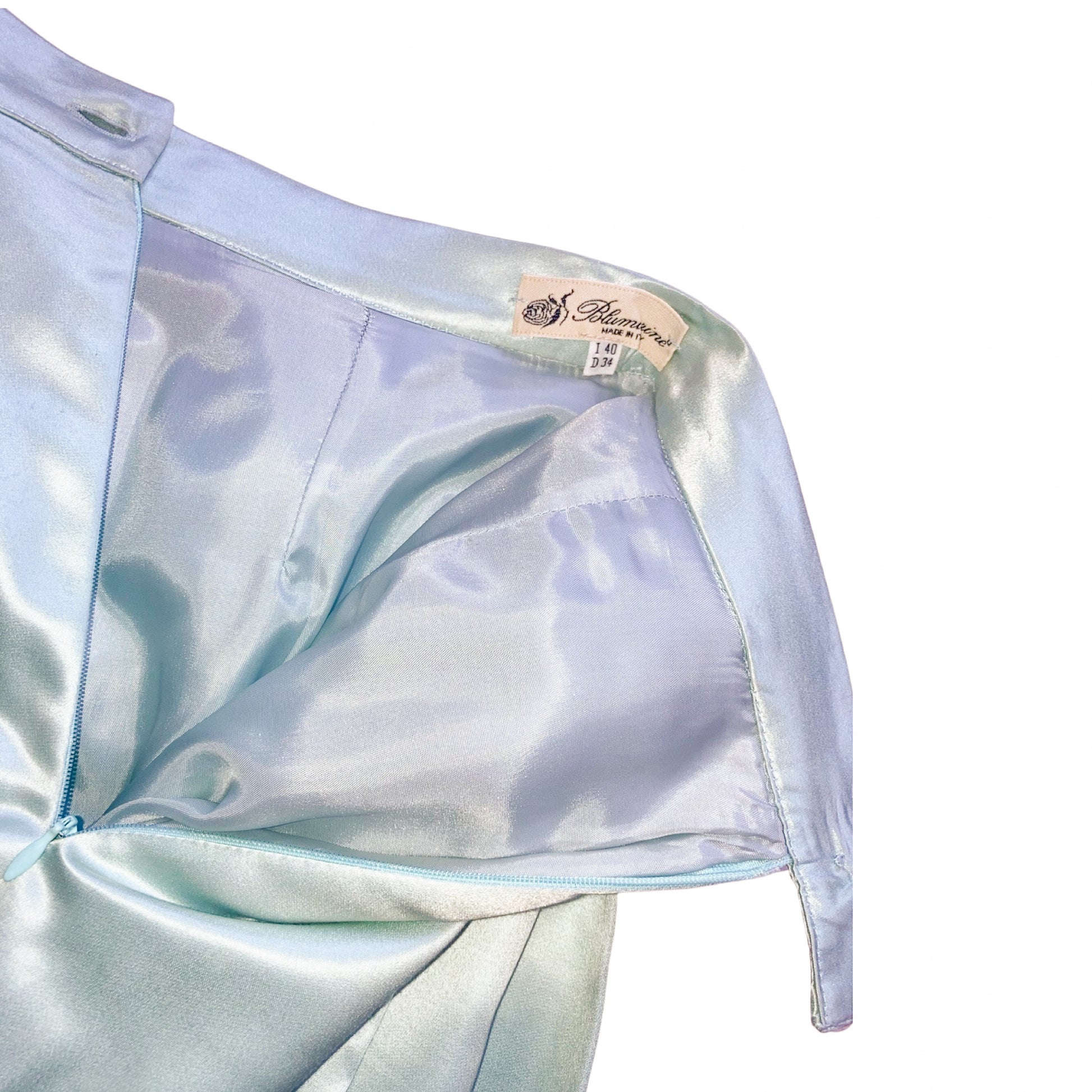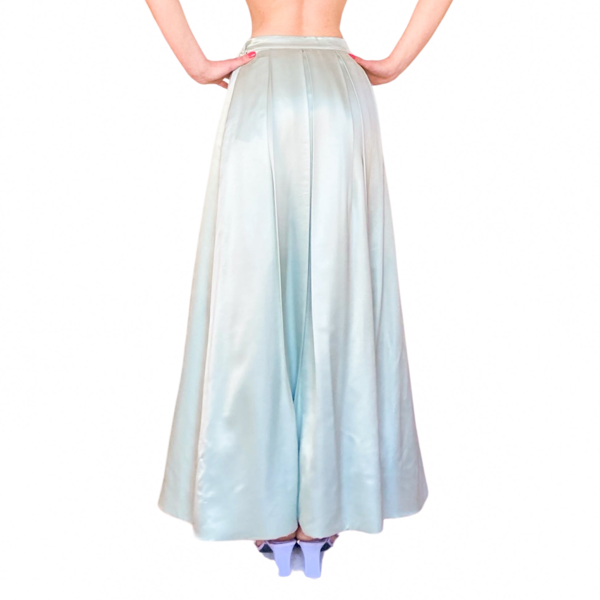 Dive into timeless elegance with our vintage Blumarine silk maxi luxurious skirt. This ethereal piece, reminiscent of a crinoline design, features a flattering cinched waist and a full, bouffant silhouette in a delicate pale aqua hue. Luxuriously lined for a graceful drape & fall. Complete with a detachable bow for versatile styling, this skirt is secured with a zipper and button closure for ease and security. Step into the allure of Blumarine's Fall/Winter 1999 collection and embrace the opulence of a bygone era. This icon was seen on the runway & shot for the official campaign too.