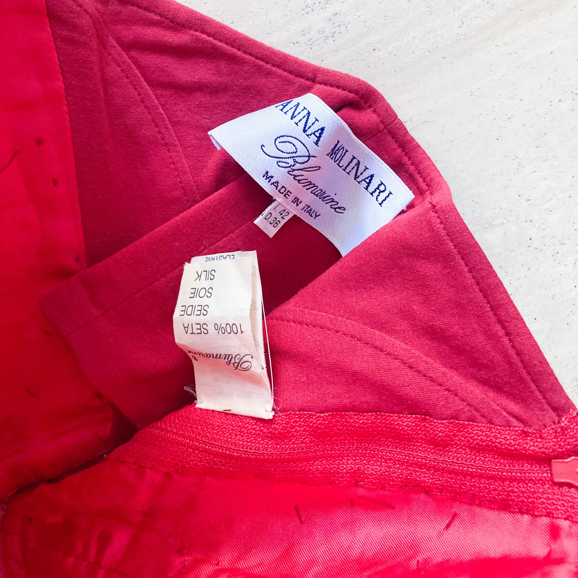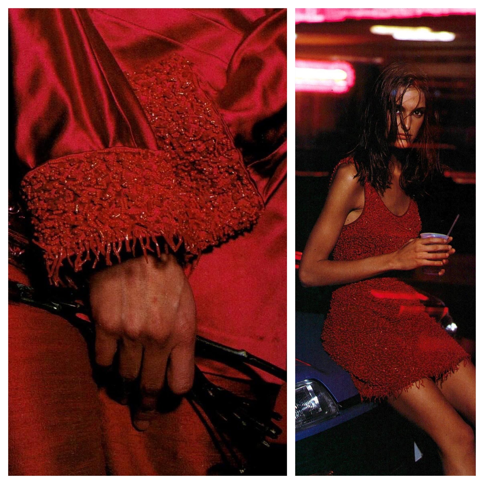 Collector bustier from Blumarine's Spring/Summer 1990 collection, this silk boned top is one of the rarest find of your shop. Adorned with genuine orange-red coral embroidery, the flattering cut complements the vibrant raspberry red color of the corset. The back is silk knit, & there is a zipper. Immaculately preserved it's an insane craftsmanship. Notably, the trade of corals is now prohibited by law in most countries, making a similar piece is impossible in today's market. Similar pieces shot by Albert Watson for the official campaign of the brand.