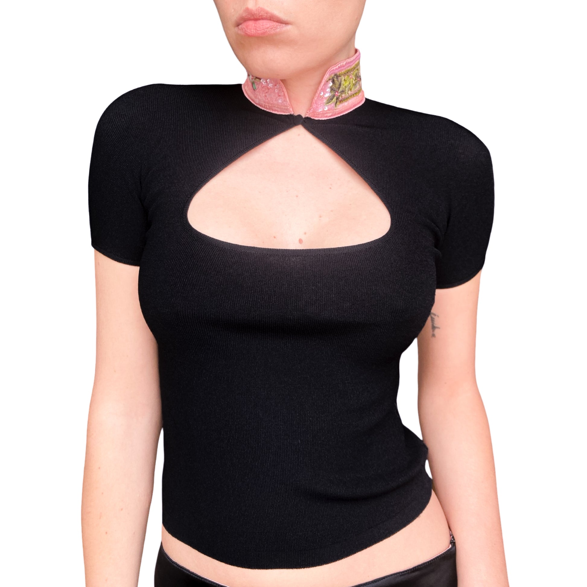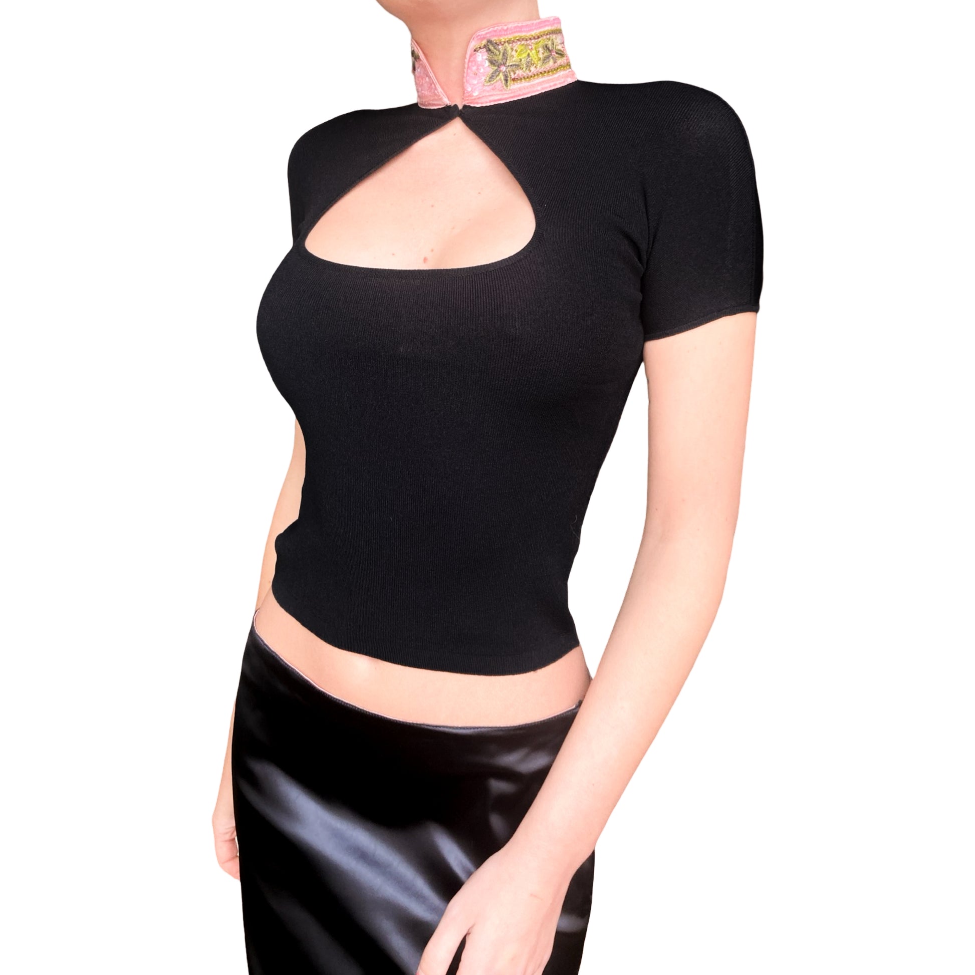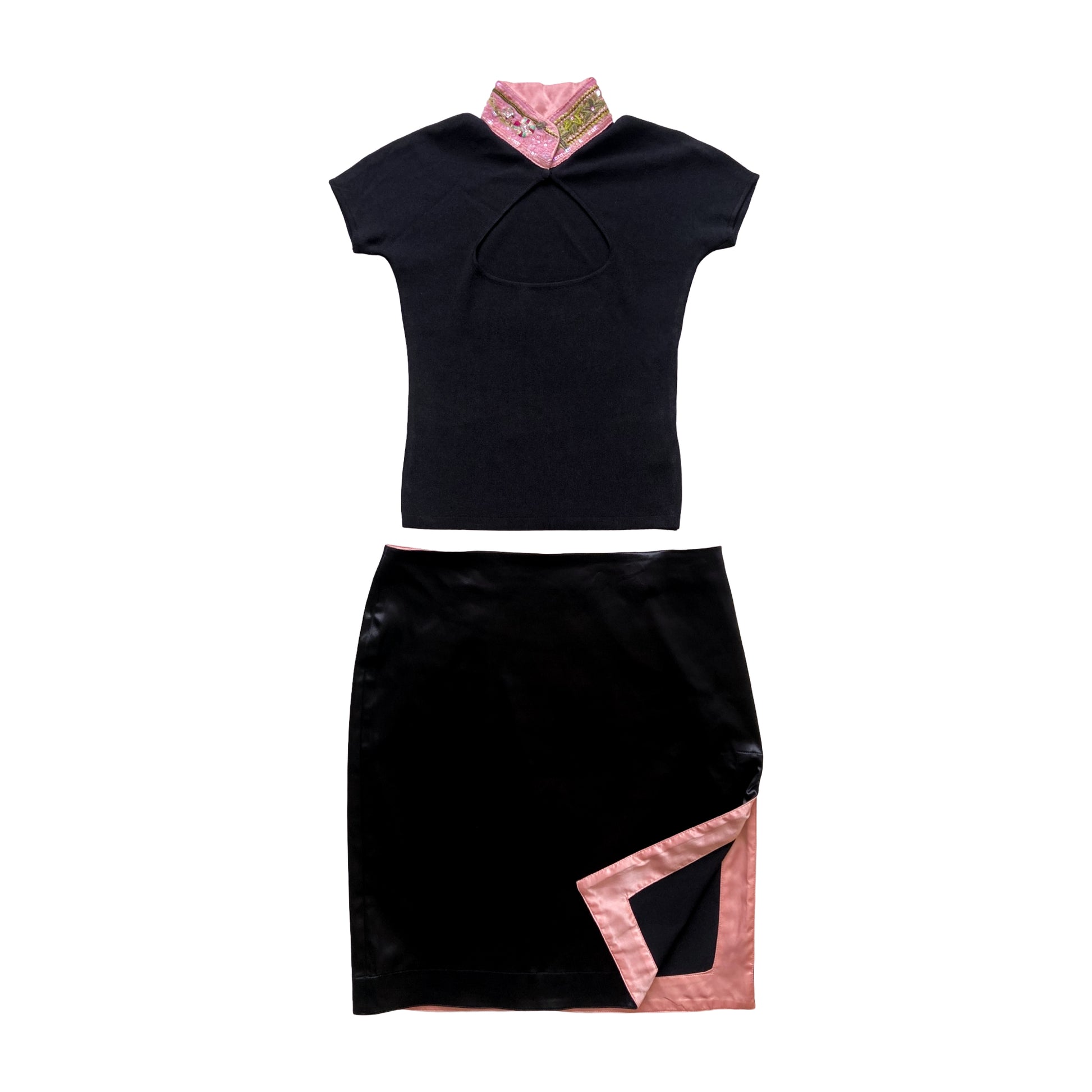 Vintage extremely rare two-piece set featuring a black mini sleeves top with a distinctive pink embellished (with beads & sequins) mandarin collar and a matching satin skirt. The top has a keyhole cutout at the chest (with a button closing) , and the skirt is detailed with a pink satin accent at the hem & slit. Super hot & feminine set !