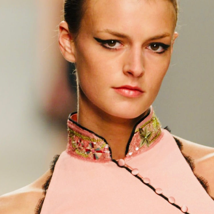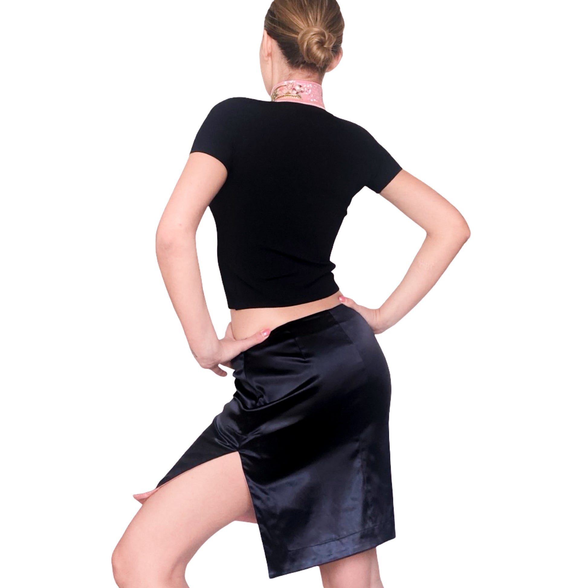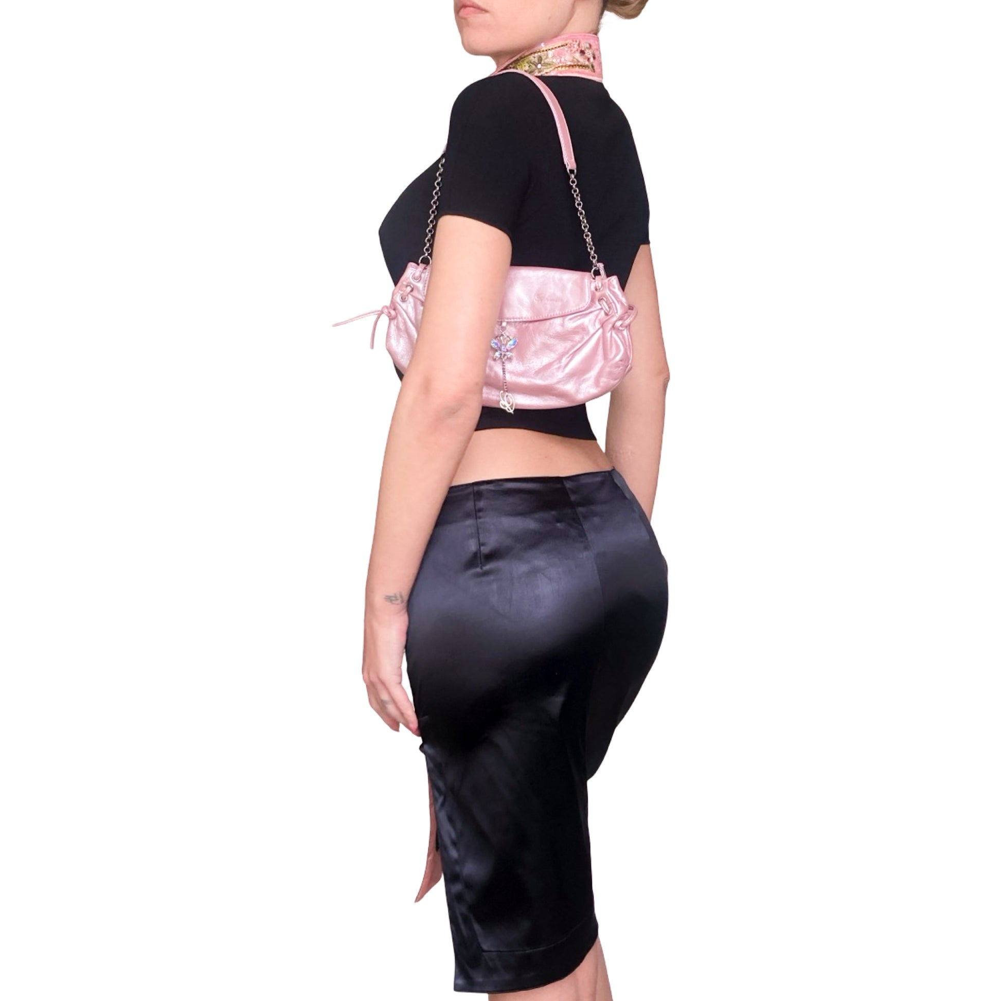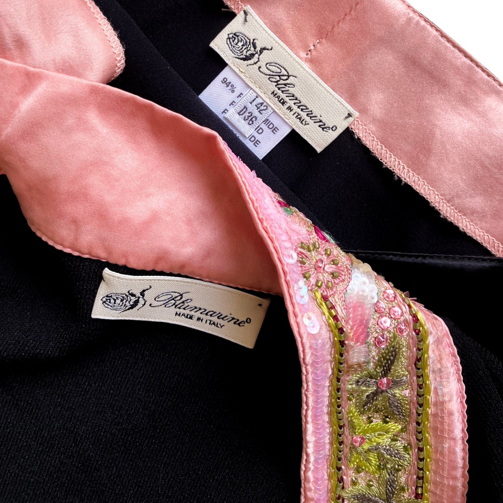 Vintage extremely rare two-piece set featuring a black mini sleeves top with a distinctive pink embellished (with beads & sequins) mandarin collar and a matching satin skirt. The top has a keyhole cutout at the chest (with a button closing) , and the skirt is detailed with a pink satin accent at the hem & slit. Super hot & feminine set !