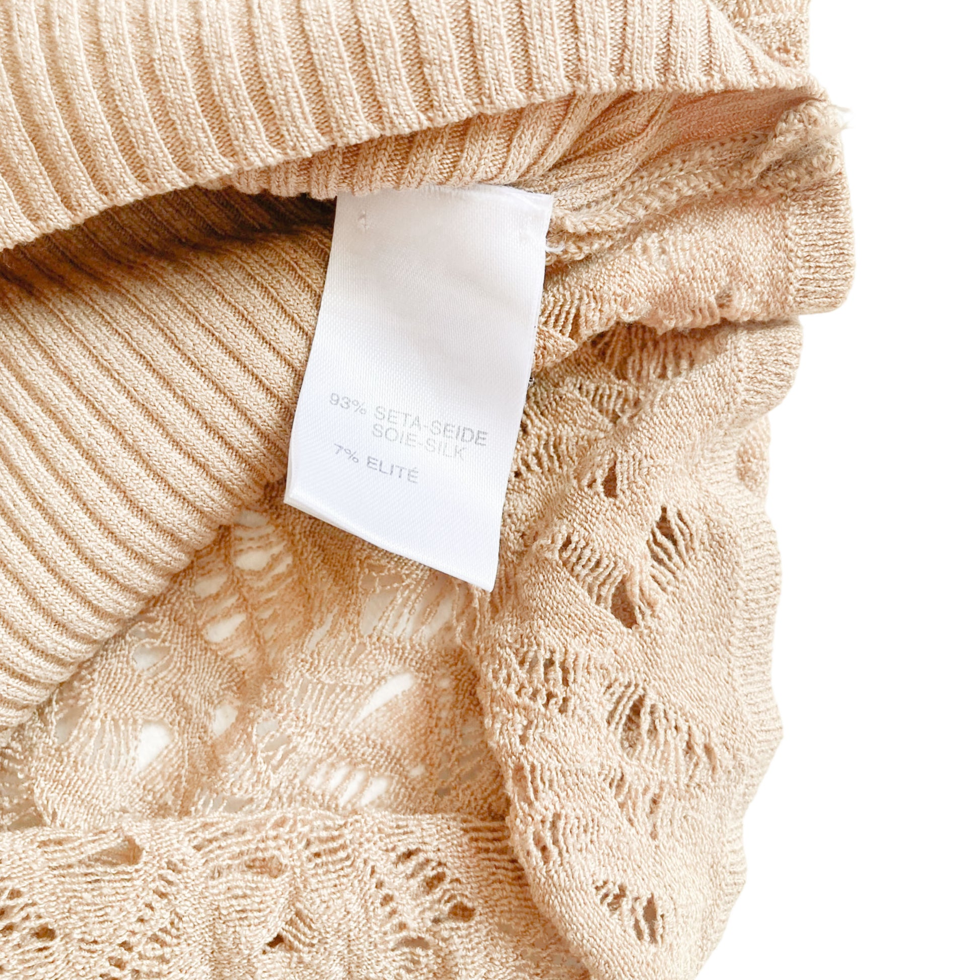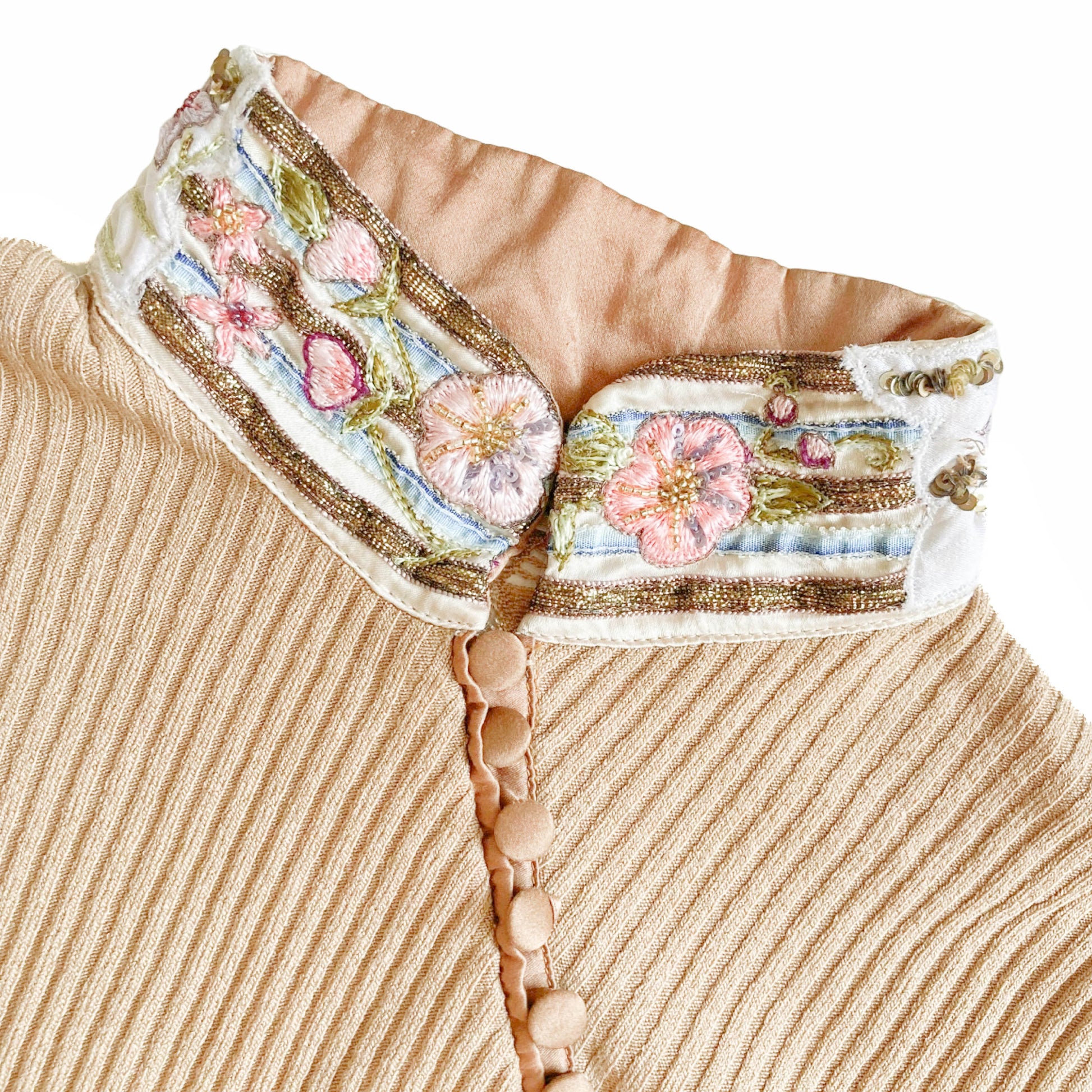 This Blumarine top from the Spring-Summer 2003 collection features a ribbed knitted silk front and a see-through lace back. The embroidered mandarin collar with floral motifs and covered buttons adds a subtle decorative touch. Made from 93% silk and 7% elite, the top provides a comfortable fit with a slight stretch. Ultra rare version on these seen on the runway.