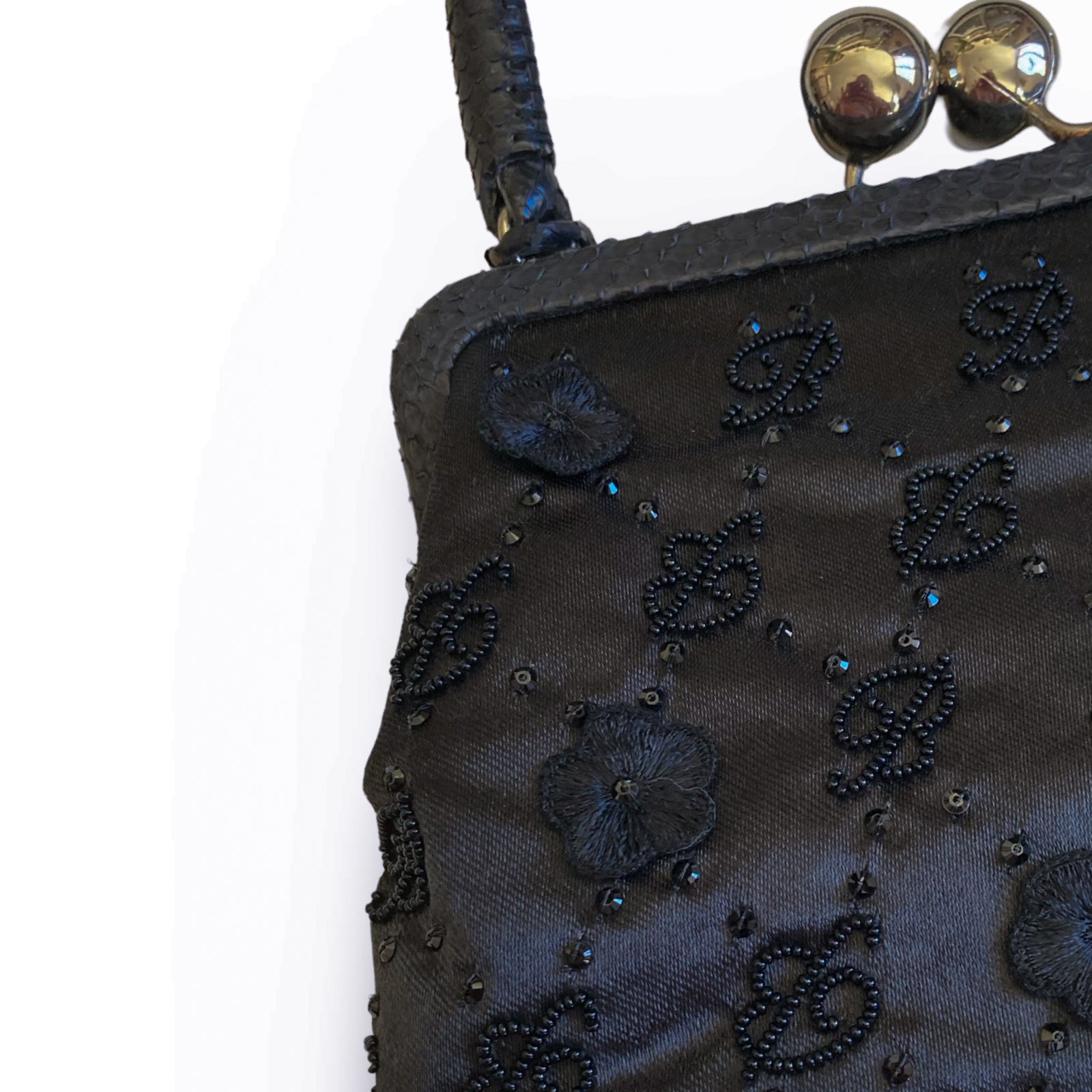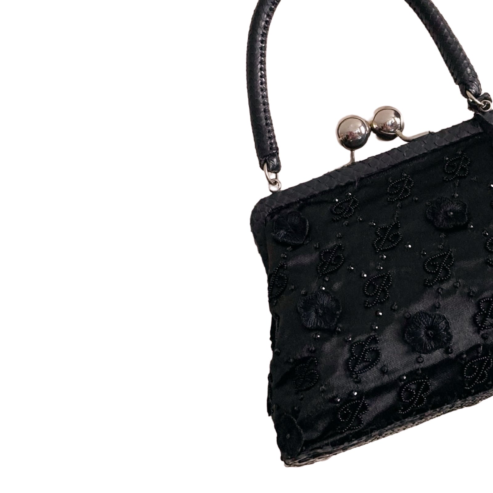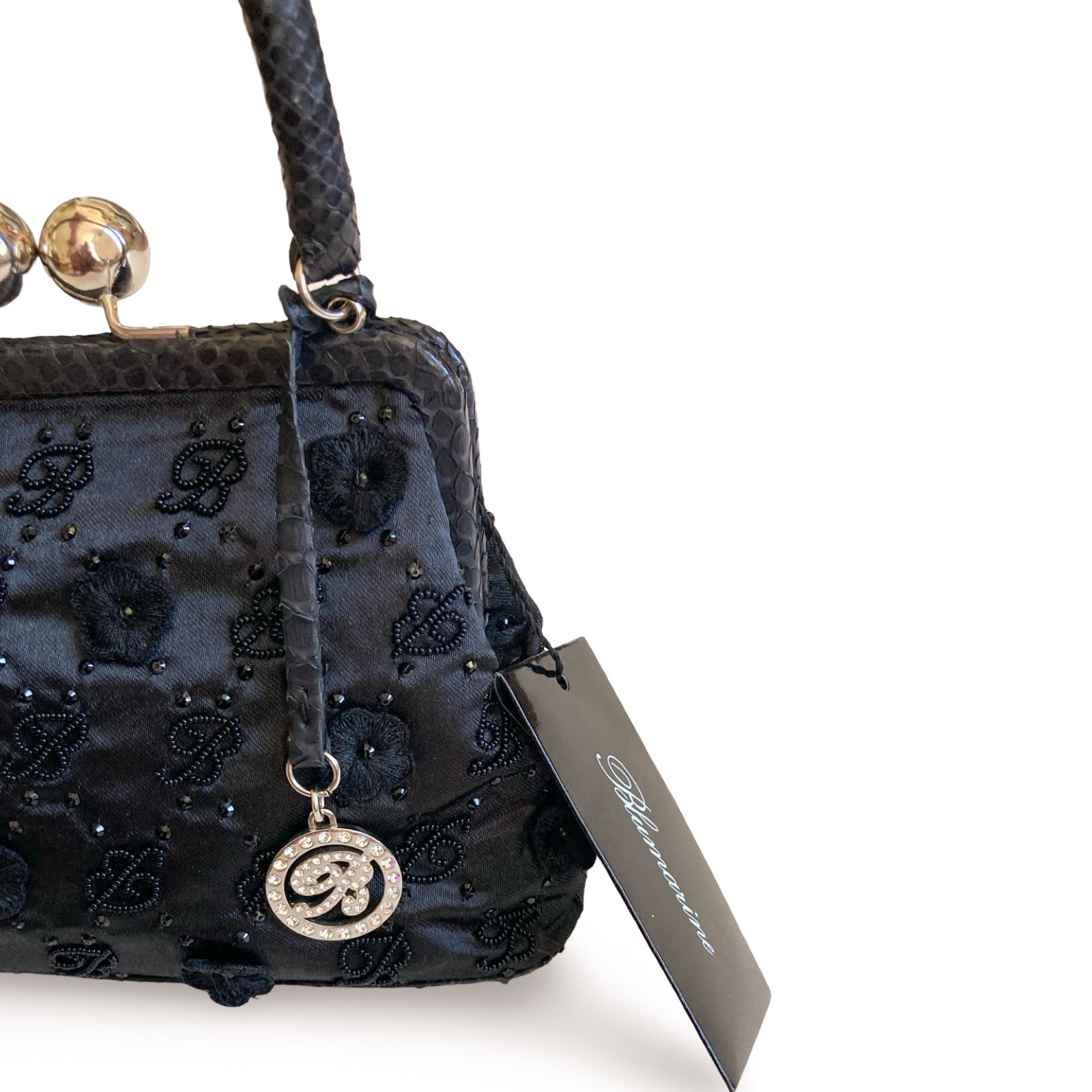 This Blumarine handbag from the Spring/Summer 2006 collection features a structured frame with a classic kiss-lock closure. The exterior is crafted from black silk satin, embroidered with the signature 'B' monogram and floral motifs. Seen on the runway, this mini bag includes a short leather handle with a textured finish, offering a refined and elegant look. From the special edition of the Blumarine bag line, which is the rarest ! It comes with its dustbag, tags & an official authentication card.