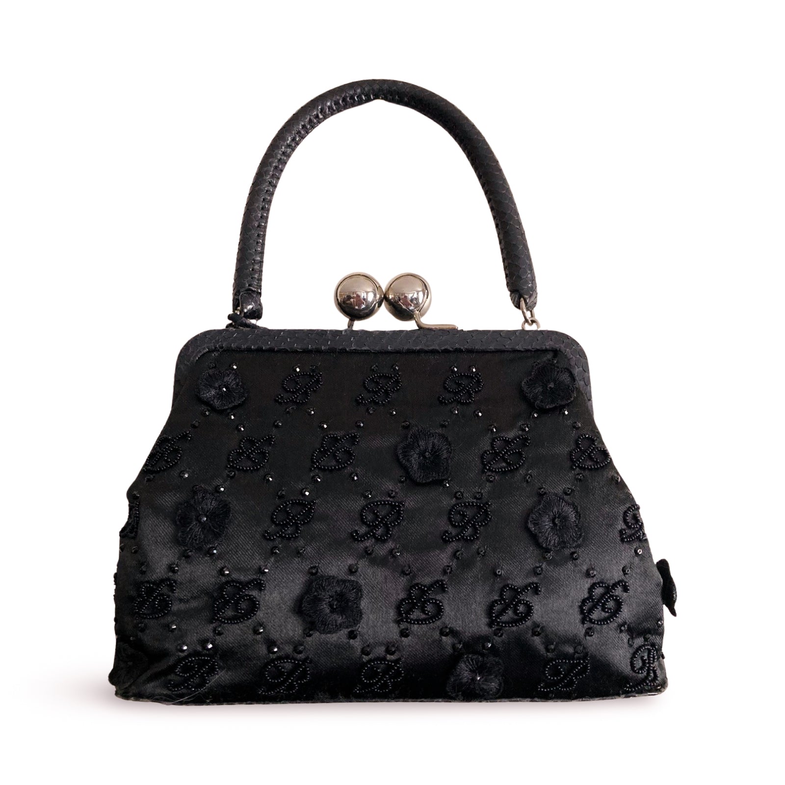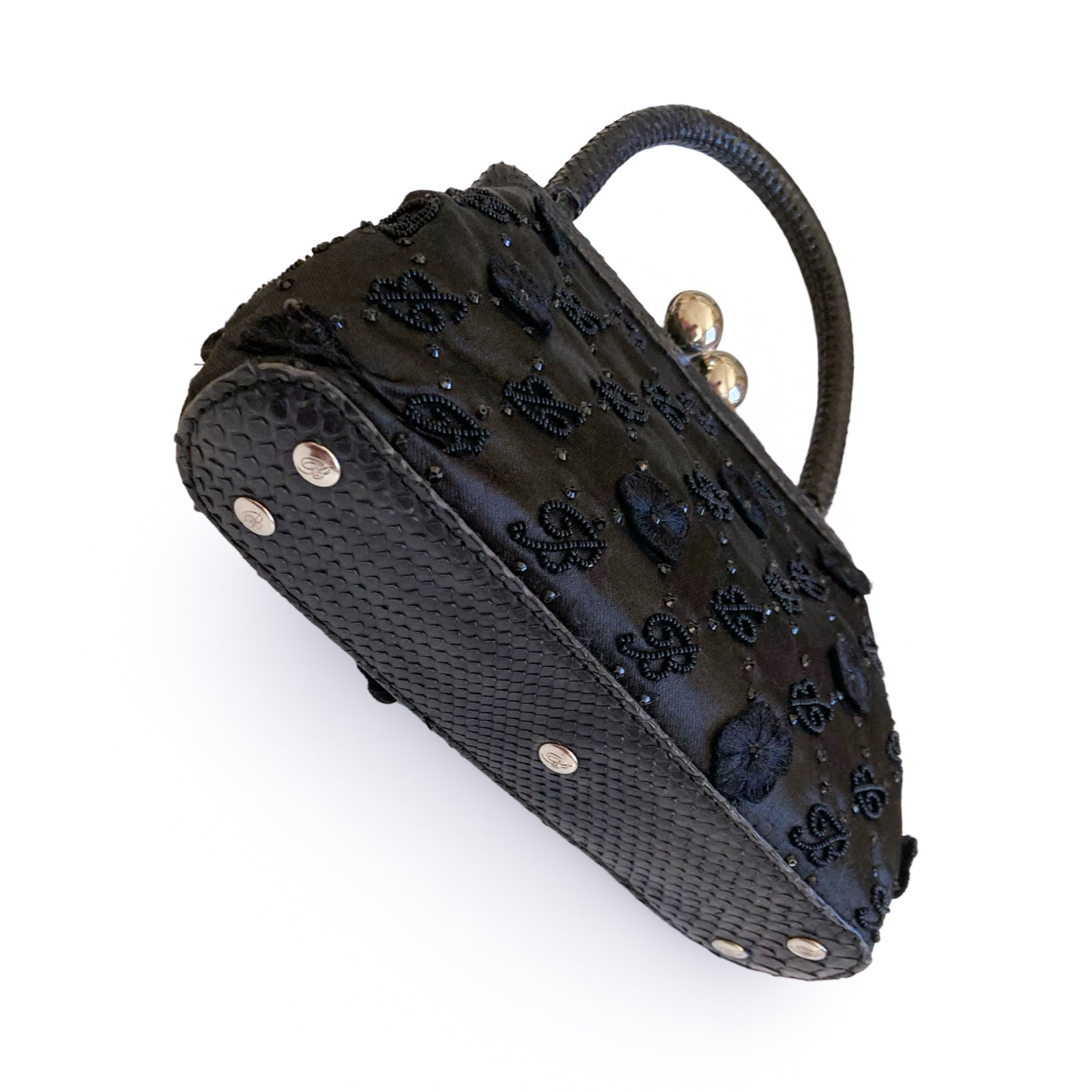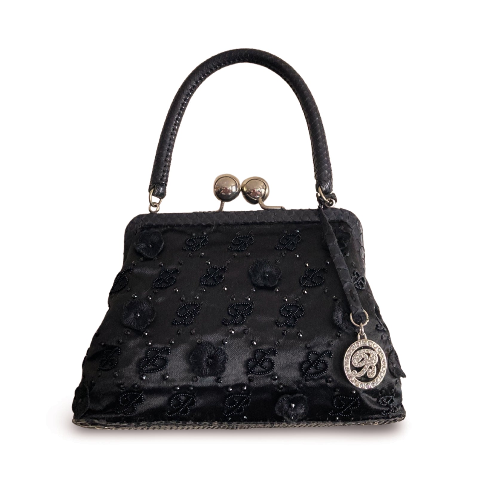 This Blumarine handbag from the Spring/Summer 2006 collection features a structured frame with a classic kiss-lock closure. The exterior is crafted from black silk satin, embroidered with the signature 'B' monogram and floral motifs. Seen on the runway, this mini bag includes a short leather handle with a textured finish, offering a refined and elegant look. From the special edition of the Blumarine bag line, which is the rarest ! It comes with its dustbag, tags & an official authentication card.