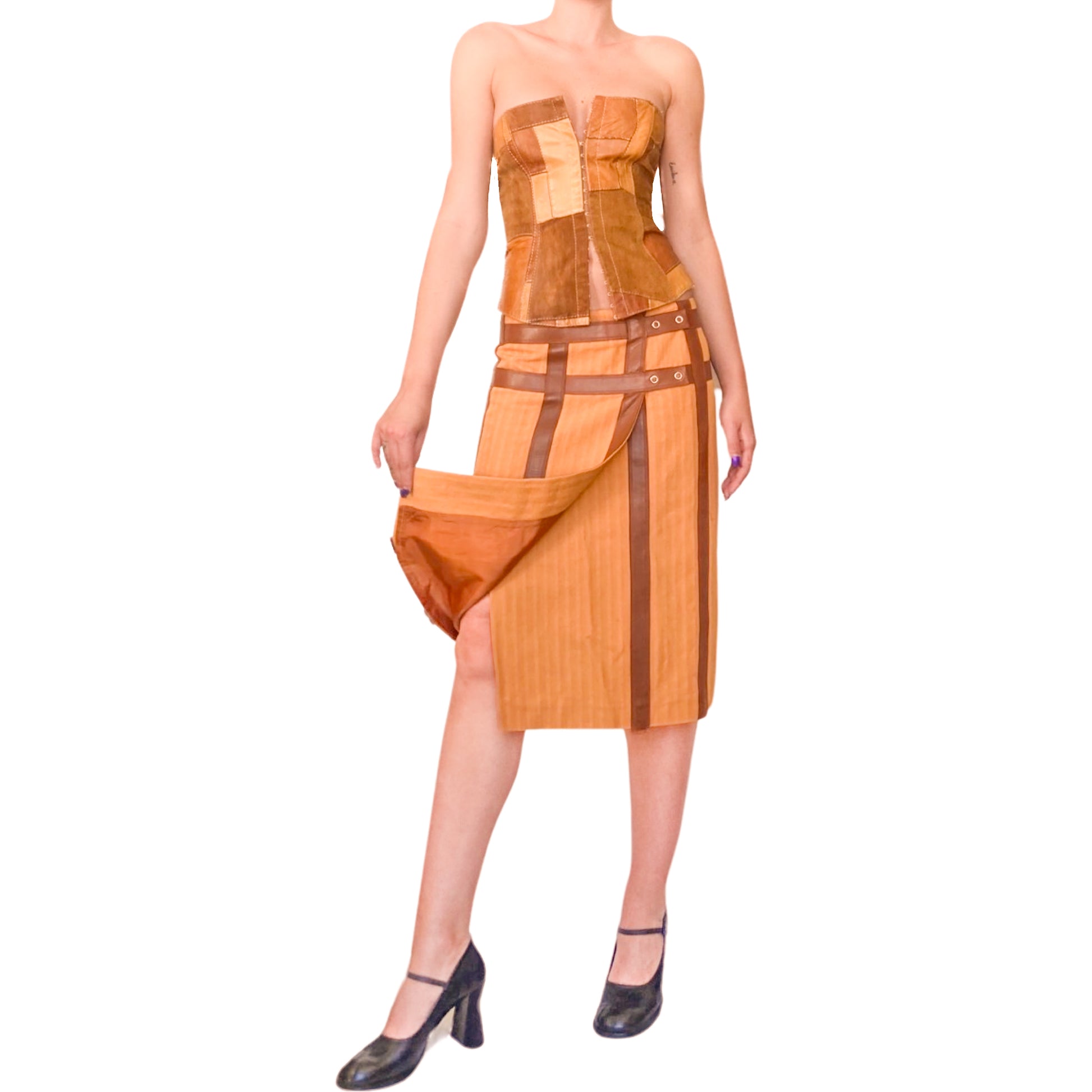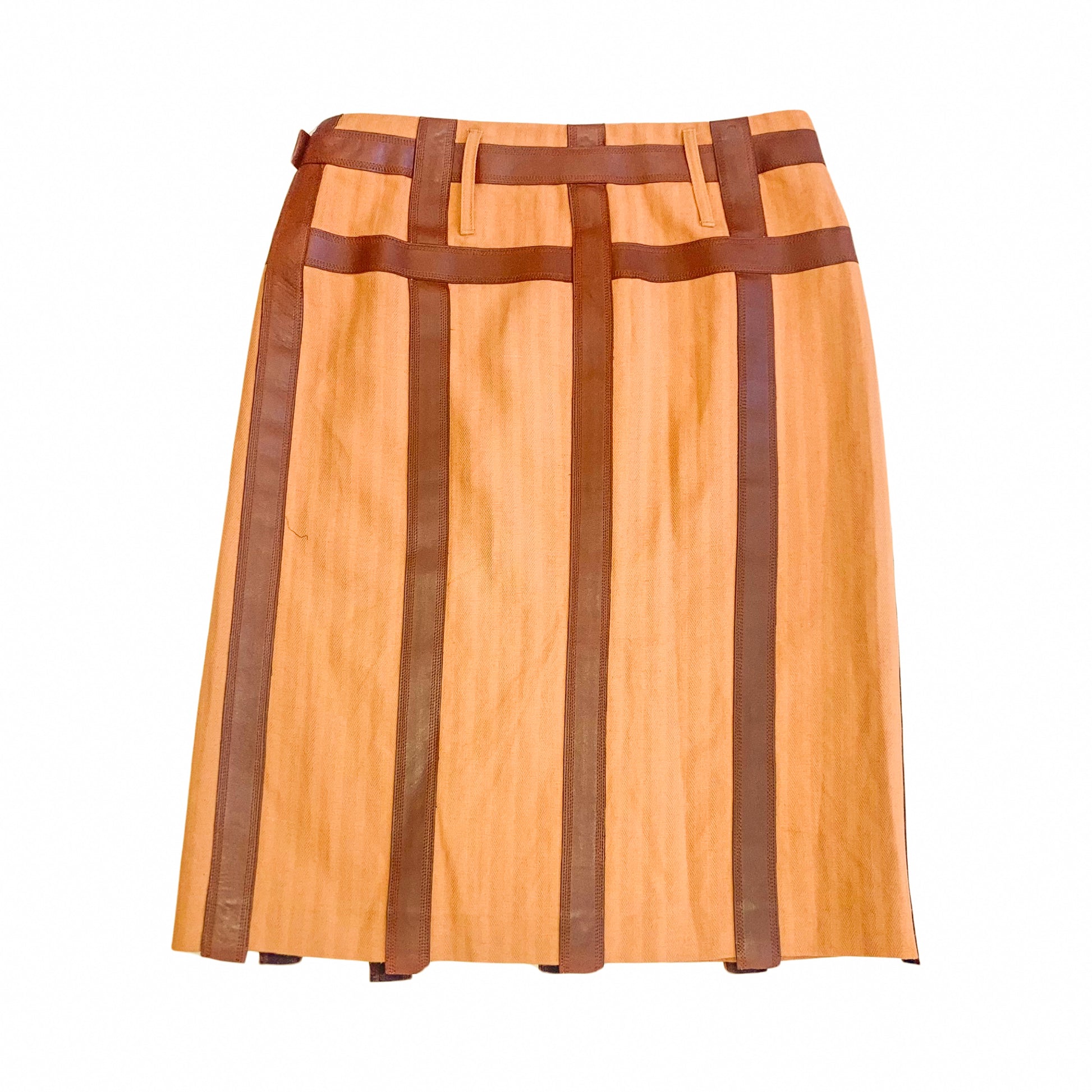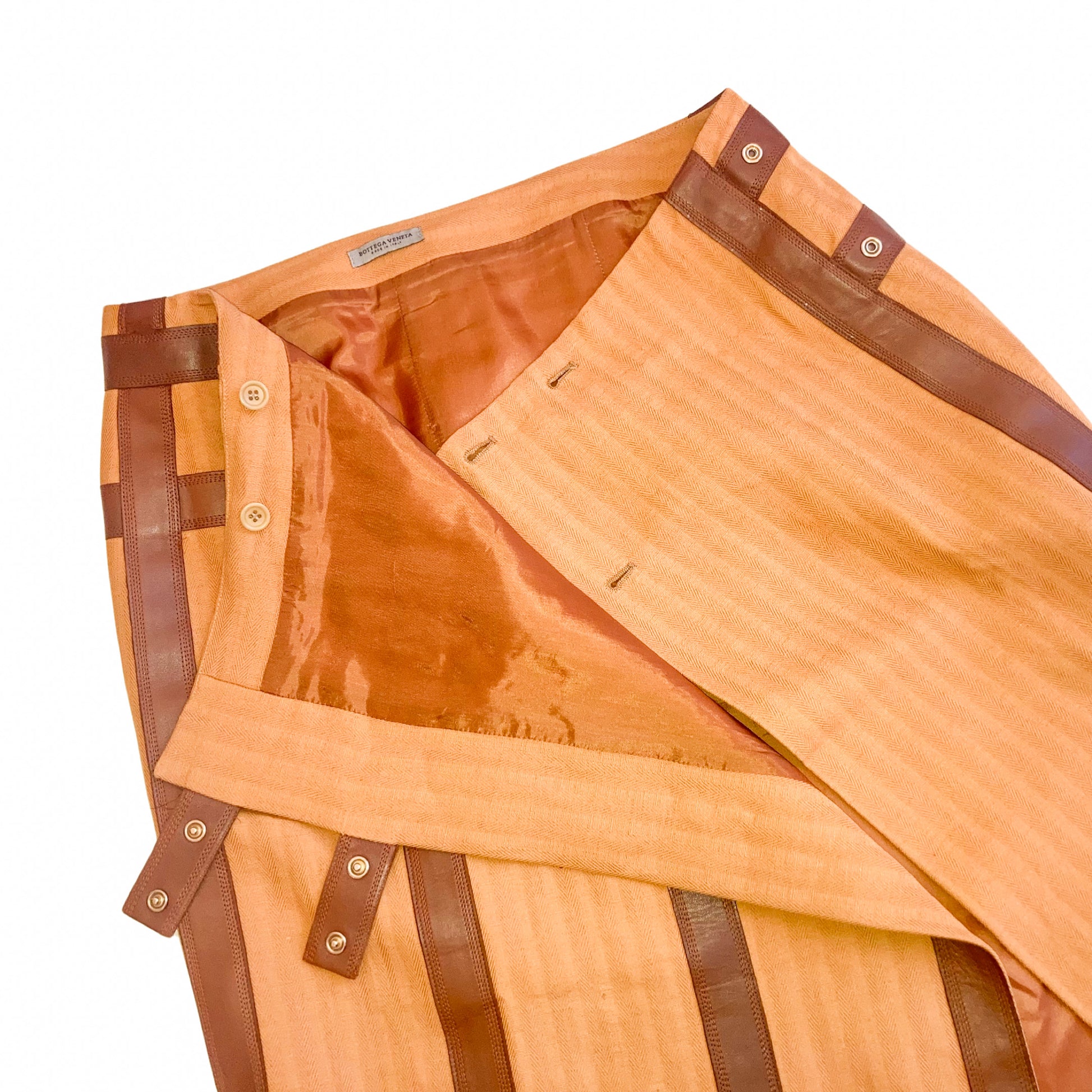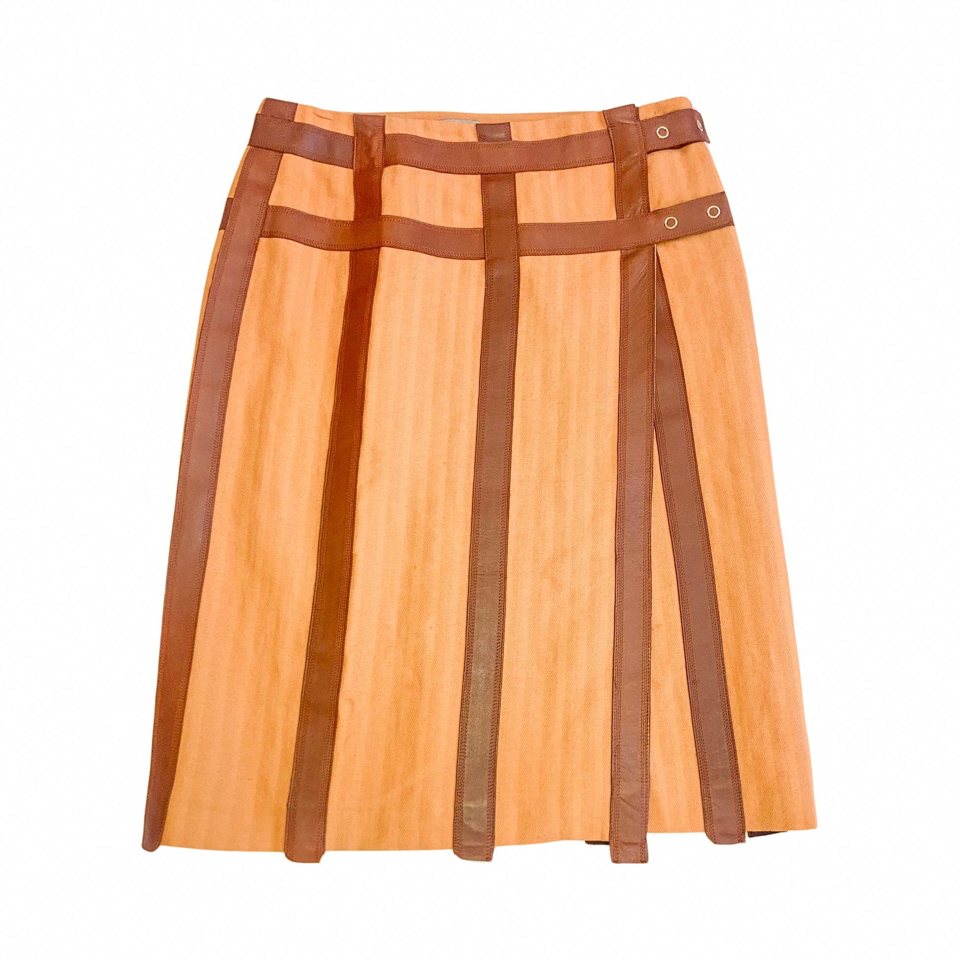 A timeless classic, the Bottega Veneta 2000's silk & leather bondage skirt is sure to turn heads. Crafted with vibrant apricot-hued silk+cotton knit and (not sure it's real) leather bondage bands, this midi skirt is lined and features a snap + buttons closure for a secure fit.