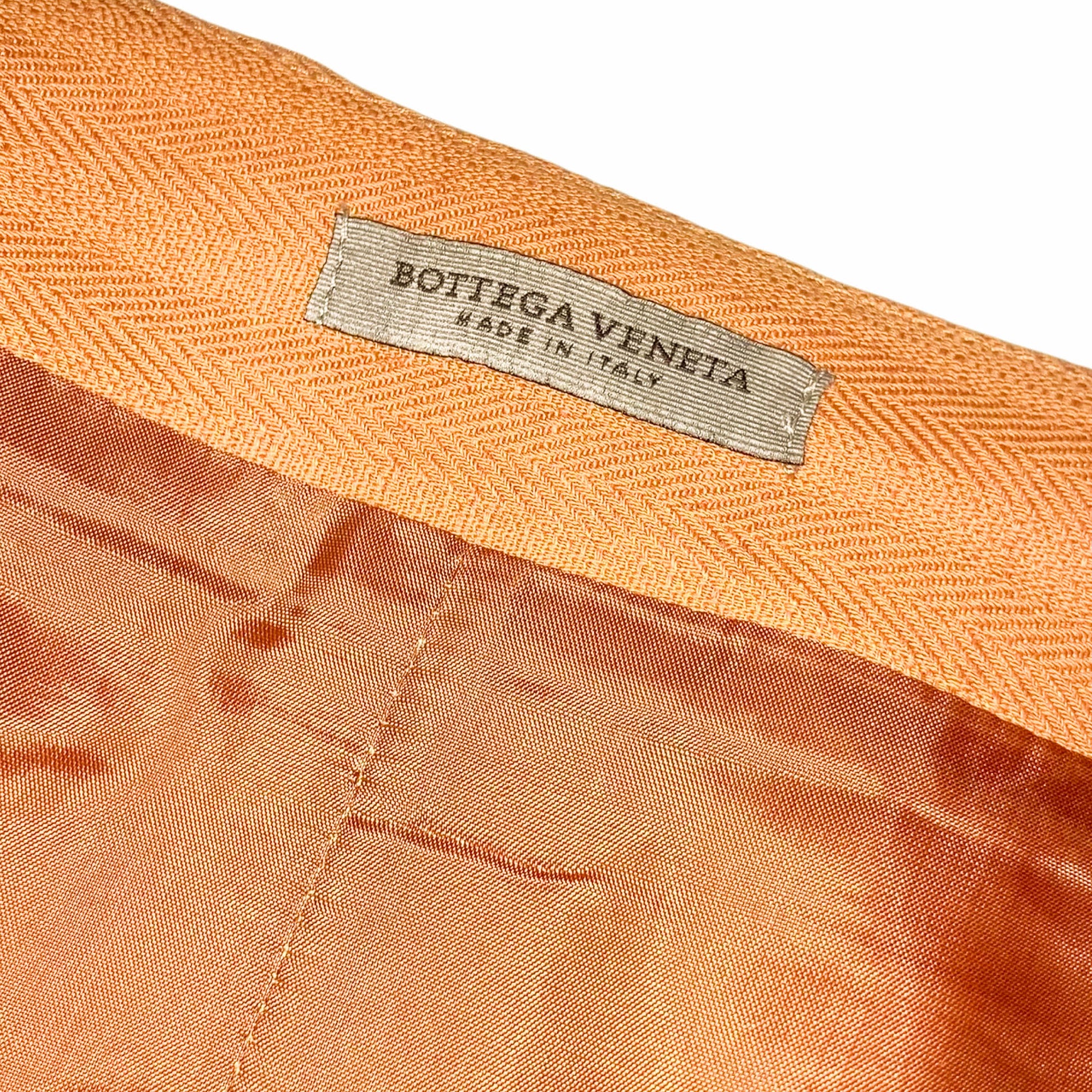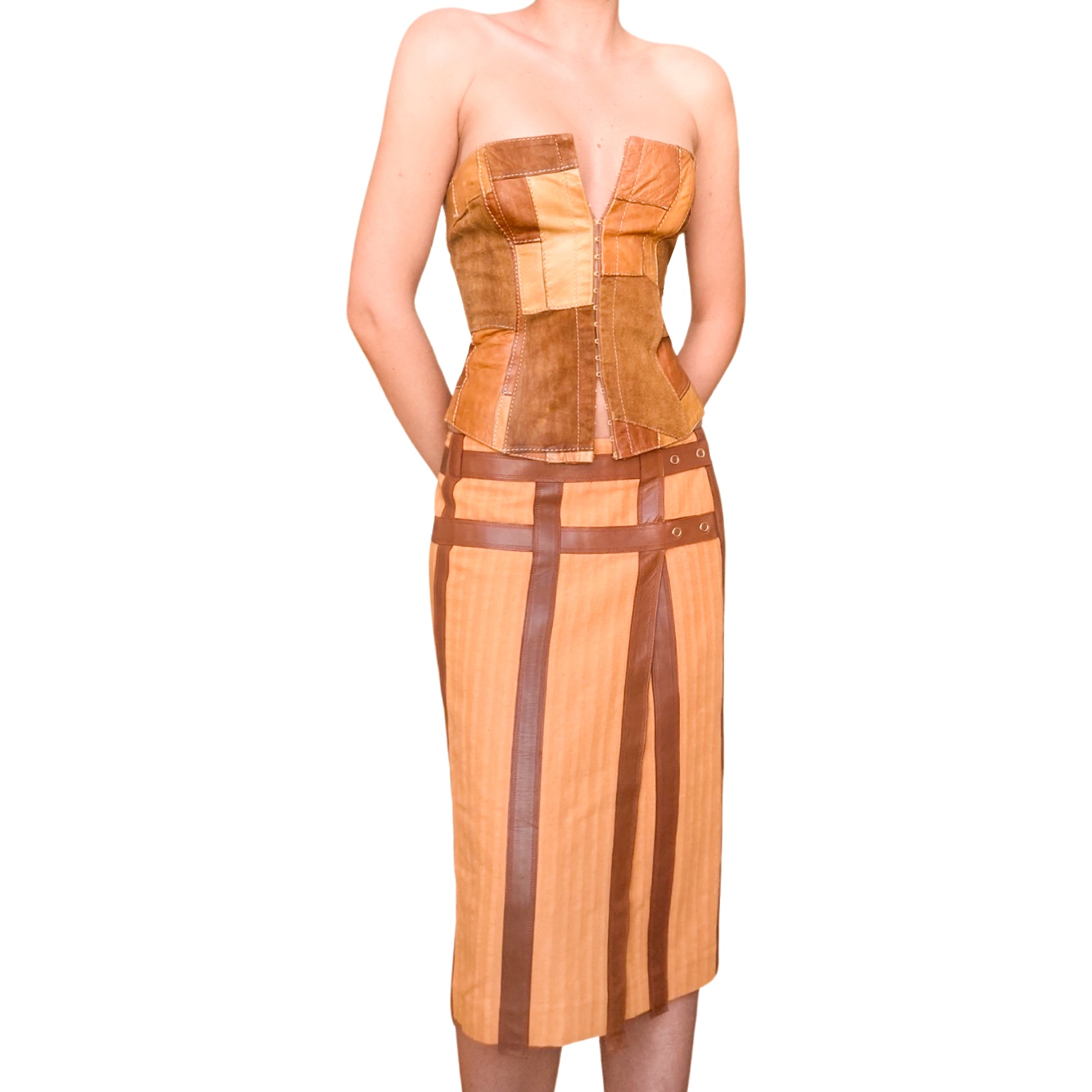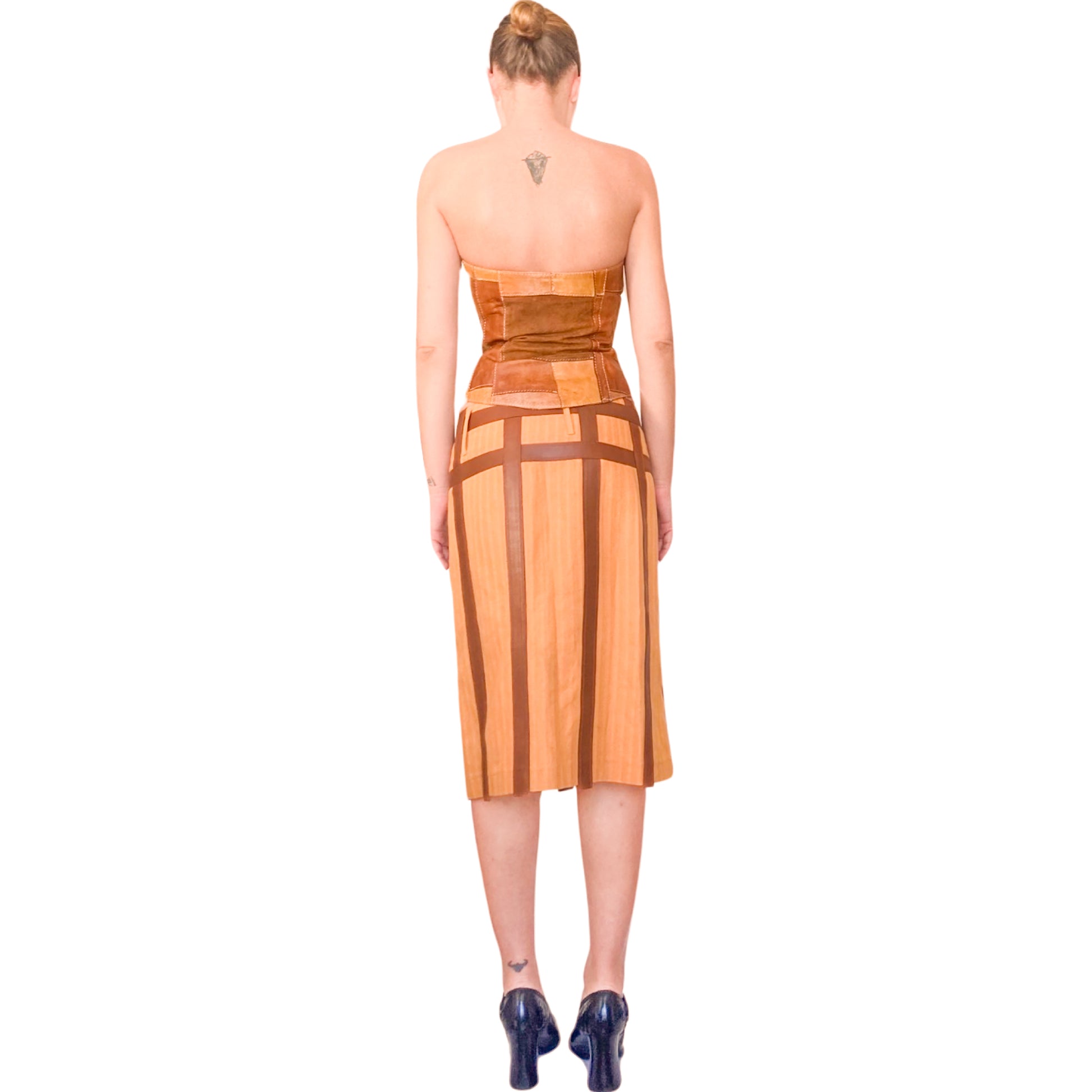 A timeless classic, the Bottega Veneta 2000's silk & leather bondage skirt is sure to turn heads. Crafted with vibrant apricot-hued silk+cotton knit and (not sure it's real) leather bondage bands, this midi skirt is lined and features a snap + buttons closure for a secure fit.