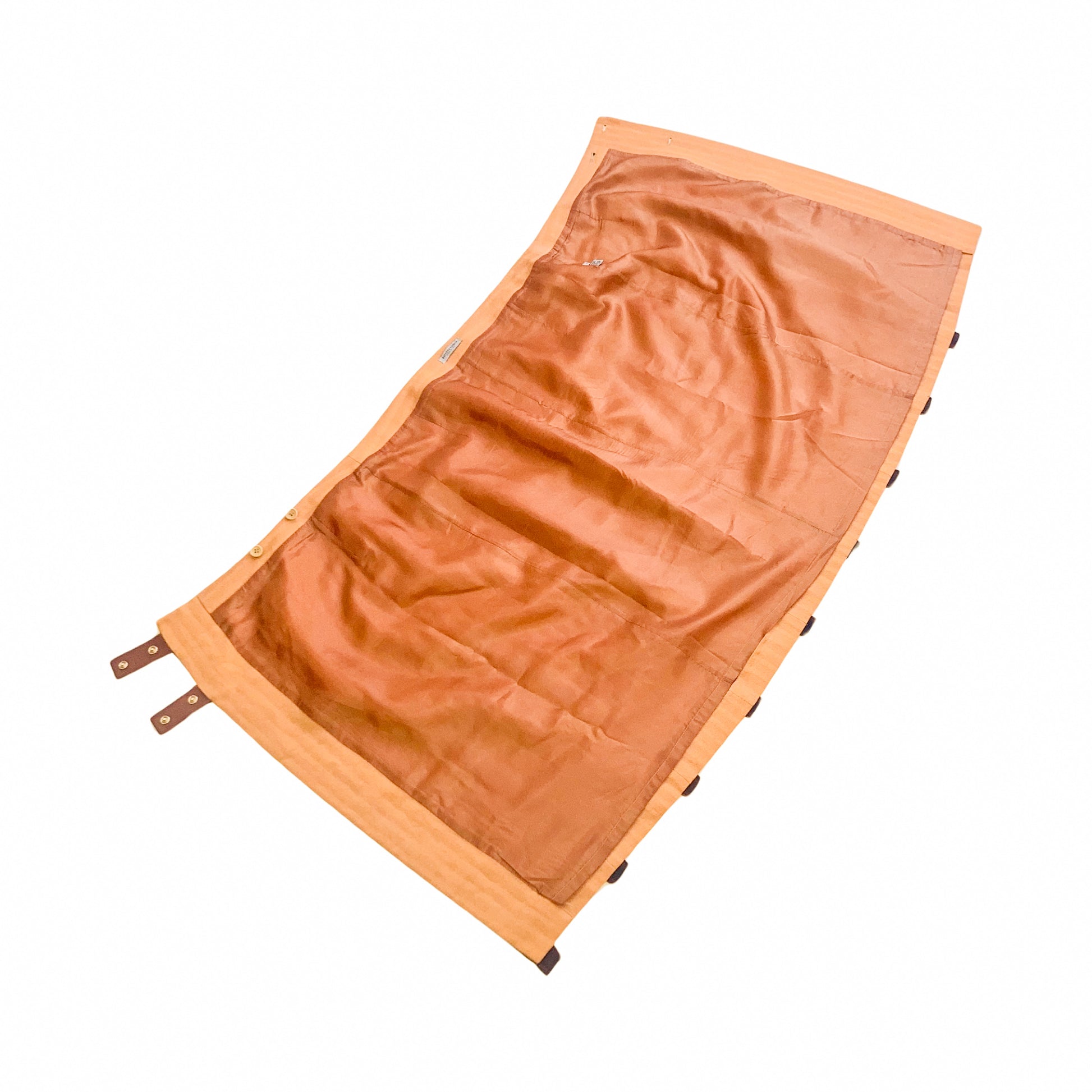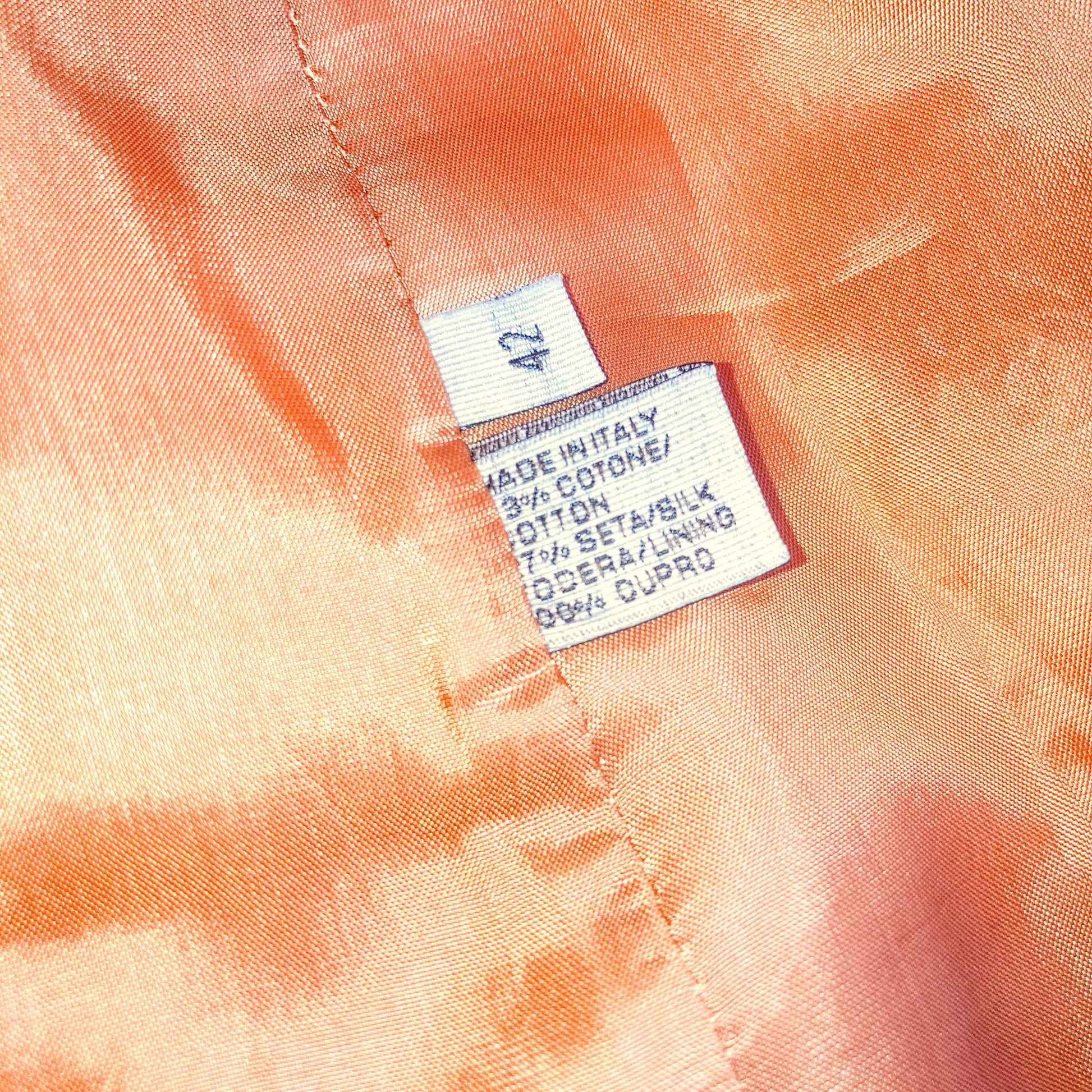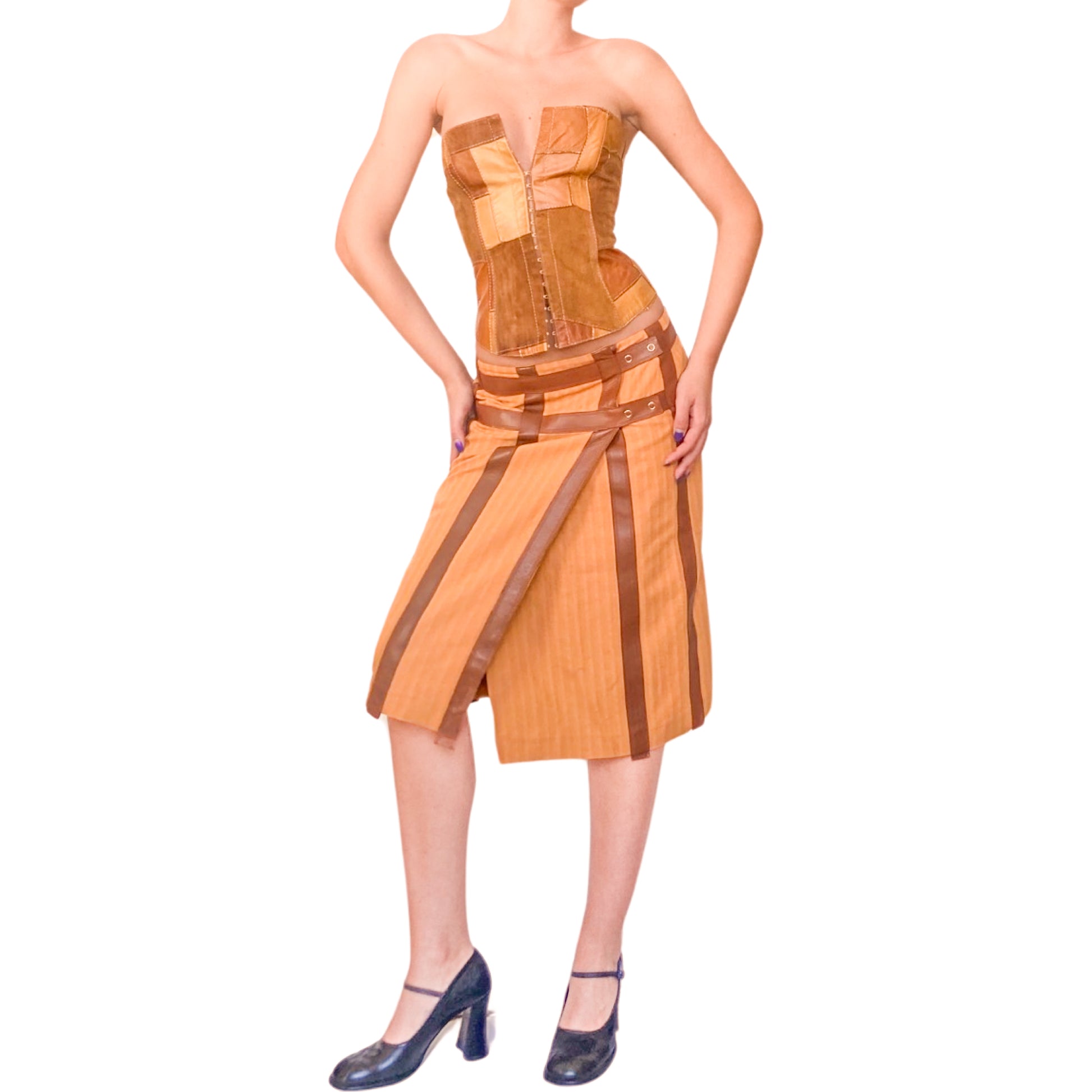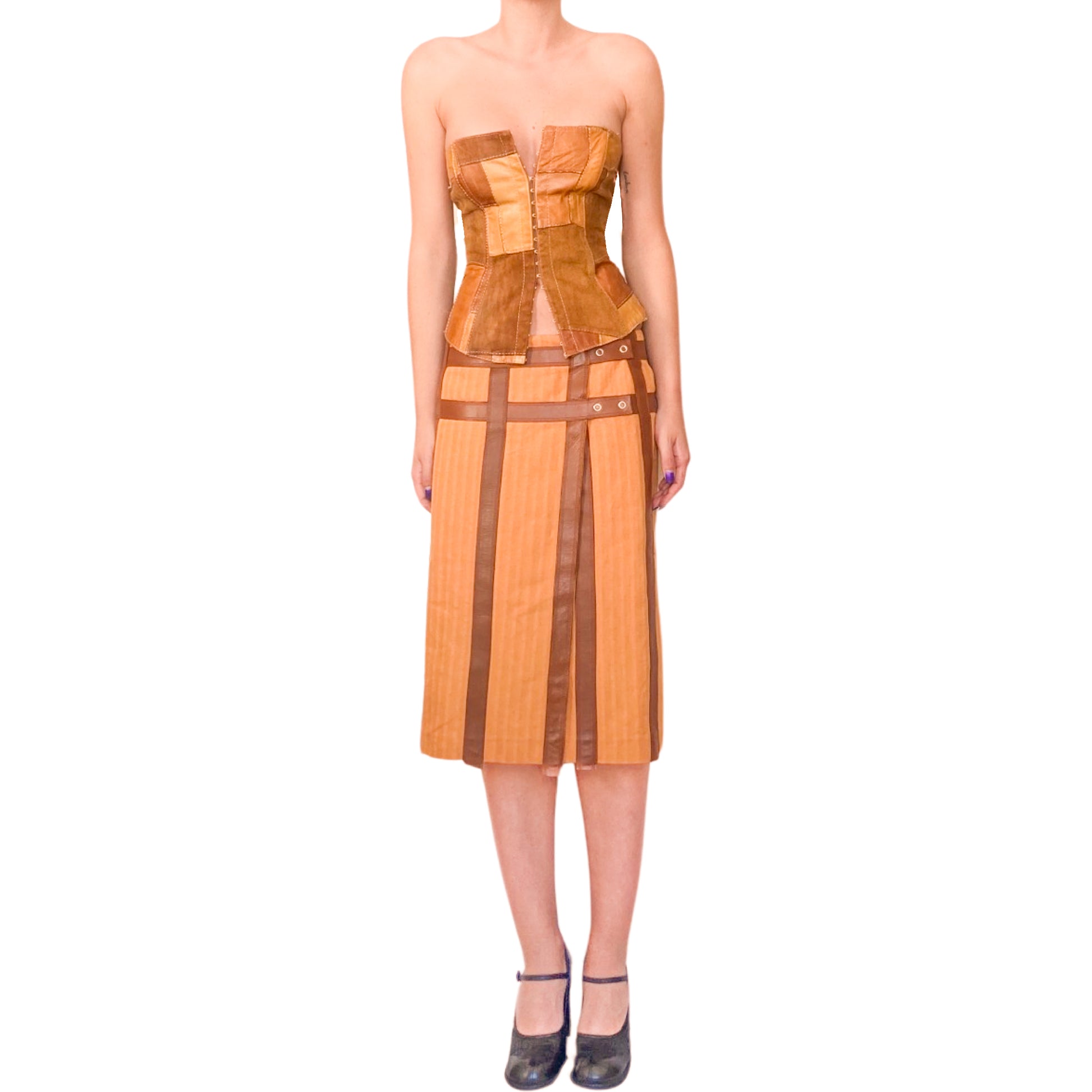A timeless classic, the Bottega Veneta 2000's silk & leather bondage skirt is sure to turn heads. Crafted with vibrant apricot-hued silk+cotton knit and (not sure it's real) leather bondage bands, this midi skirt is lined and features a snap + buttons closure for a secure fit.