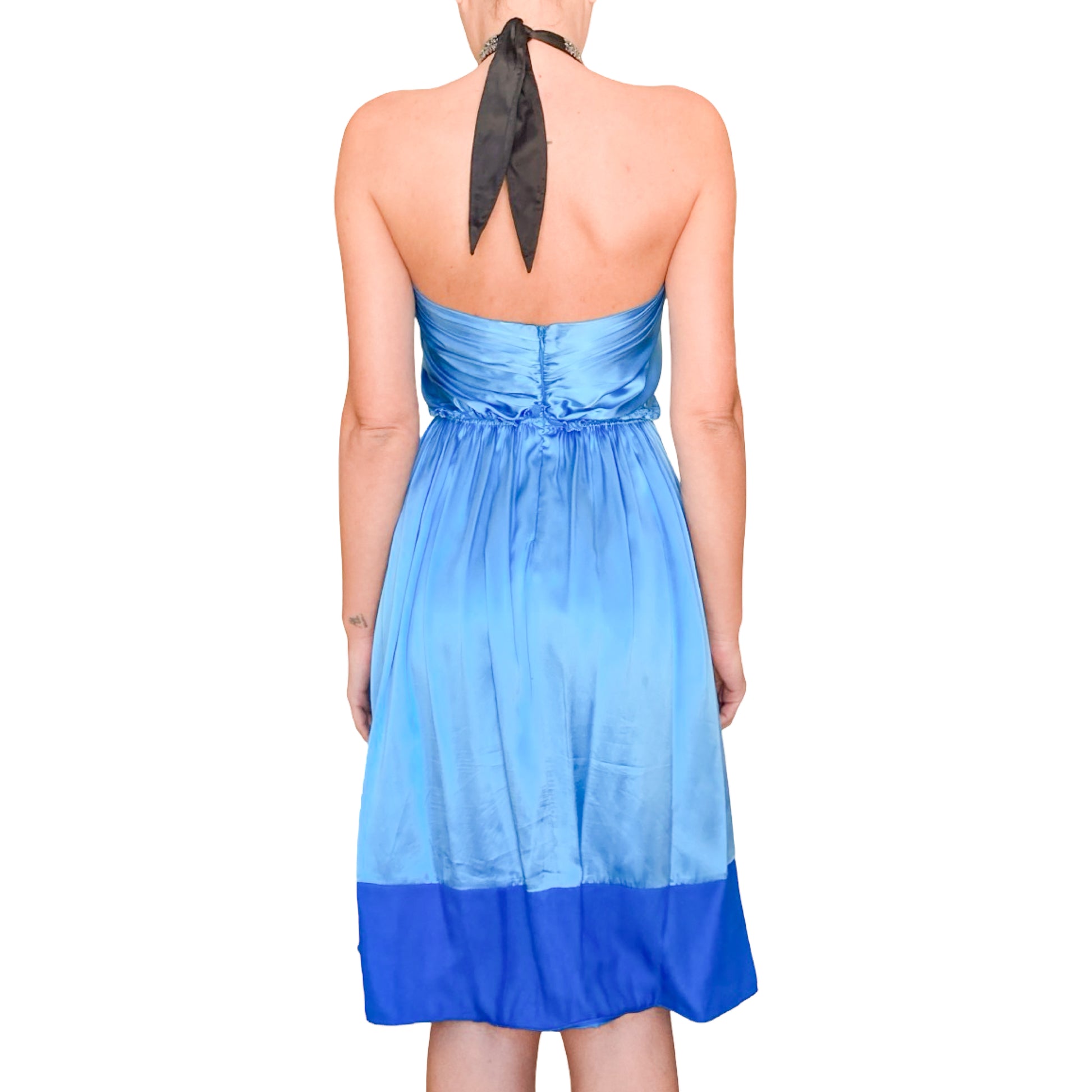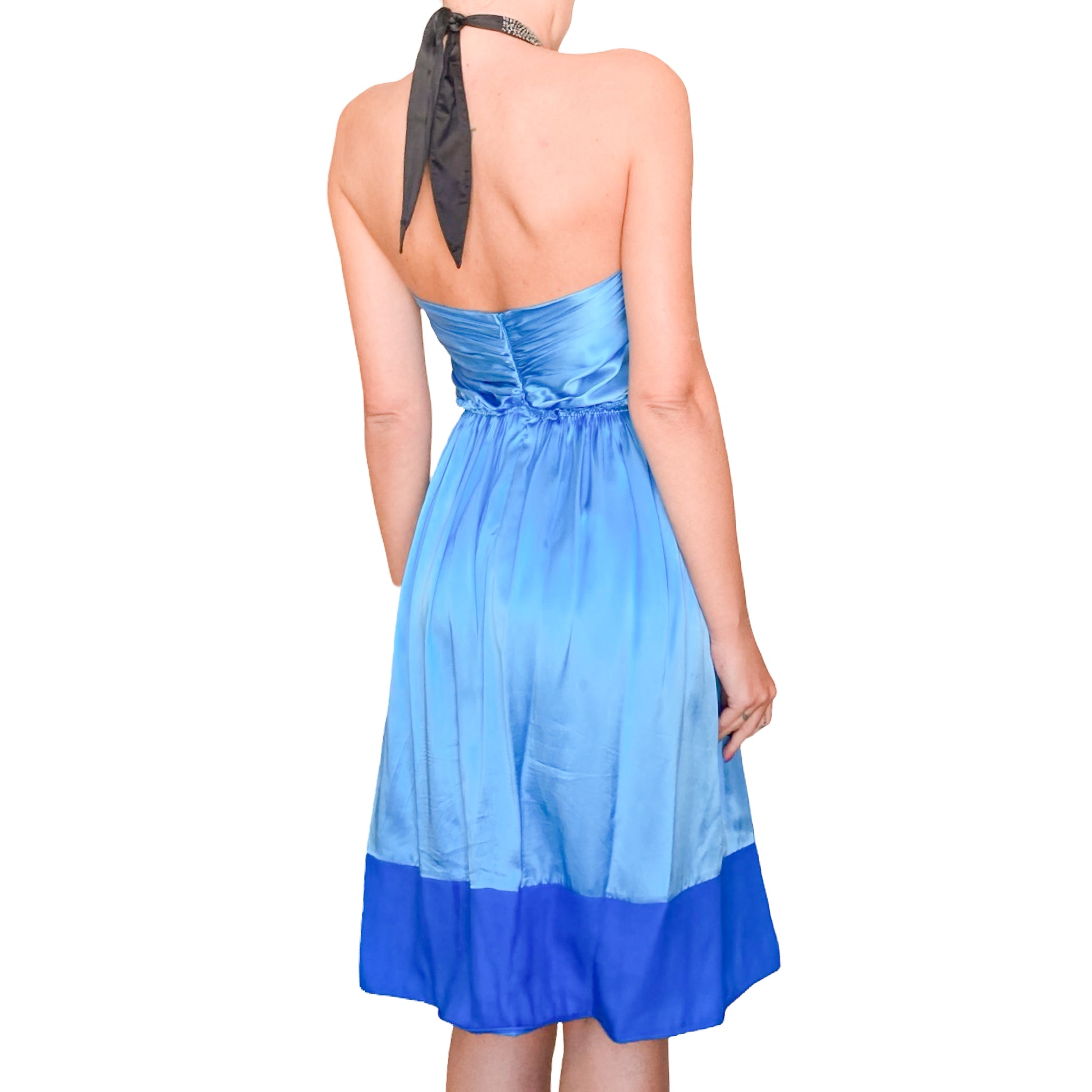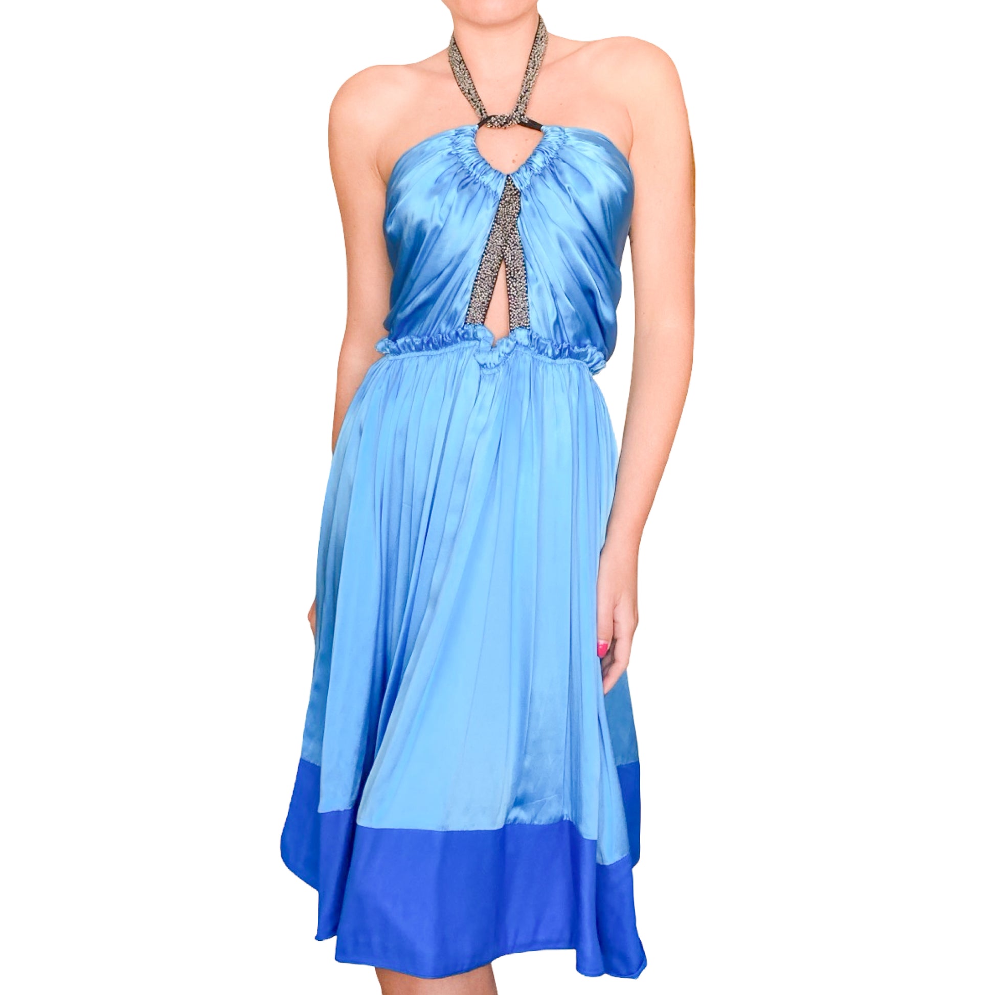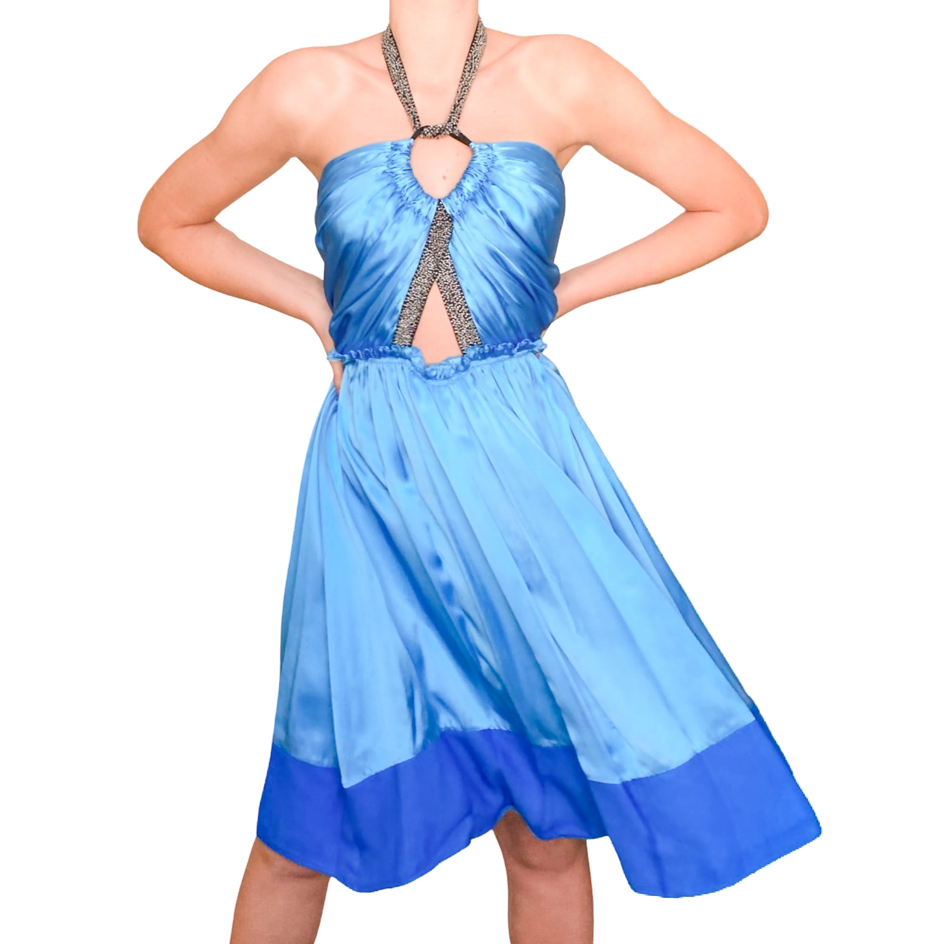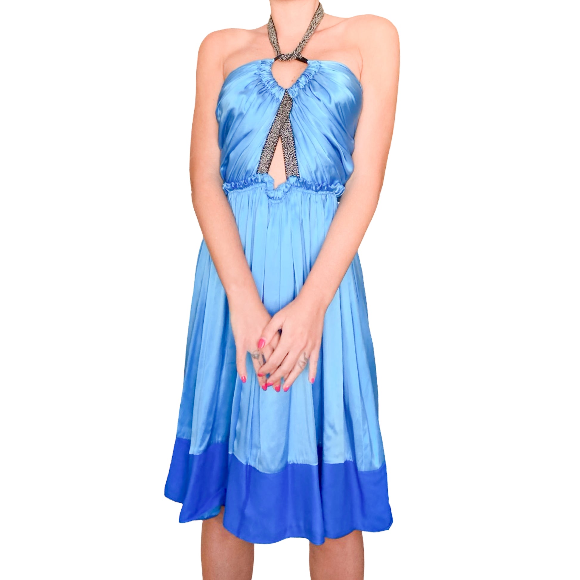 This Chloé sublime dress from the Spring/Summer 2005 runway collection features a hypnotic electric blue satin silk fabric. The halter neck design showcases a unique crystal-embellished trim that forms a keyhole cutout at the front ( you can also style it as a normal halter). The fitted bodice transitions into a flowy, gathered skirt with a contrasting navy blue hemline. It includes a concealed back zipper for ease of wear. Seen on the runway, campaign & on Paris Hilton, Celine Dior, Barbie & Micha Barton. Such an icon !