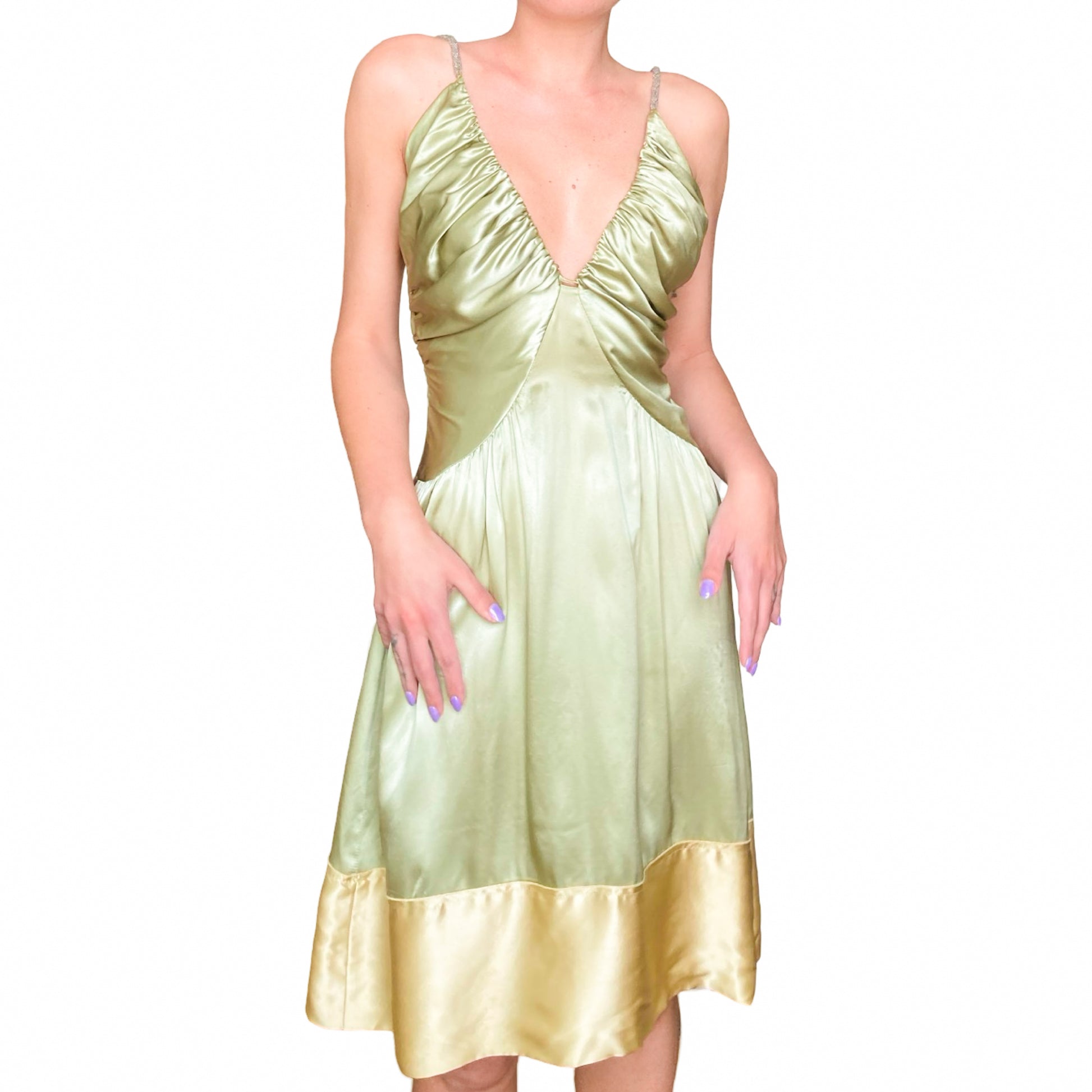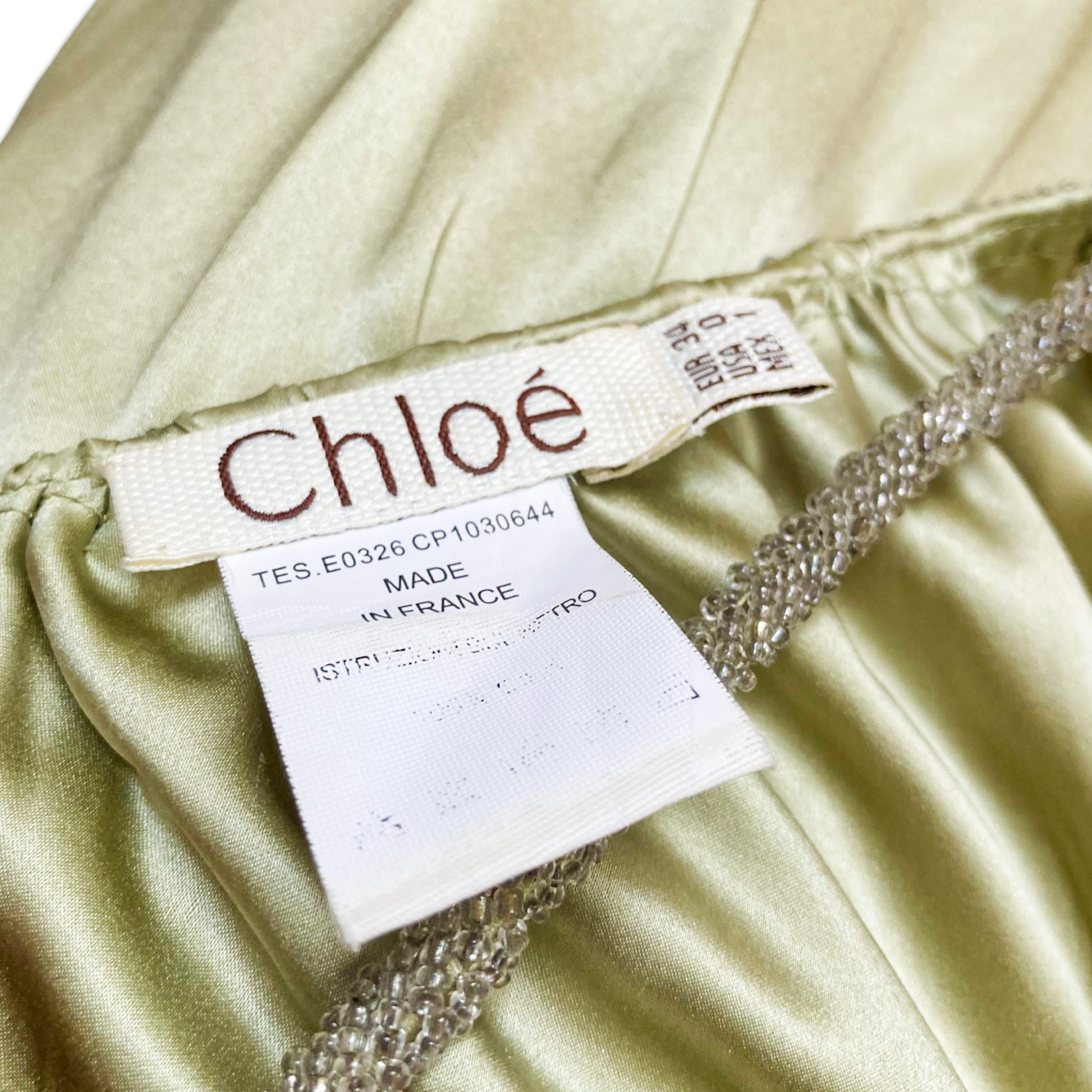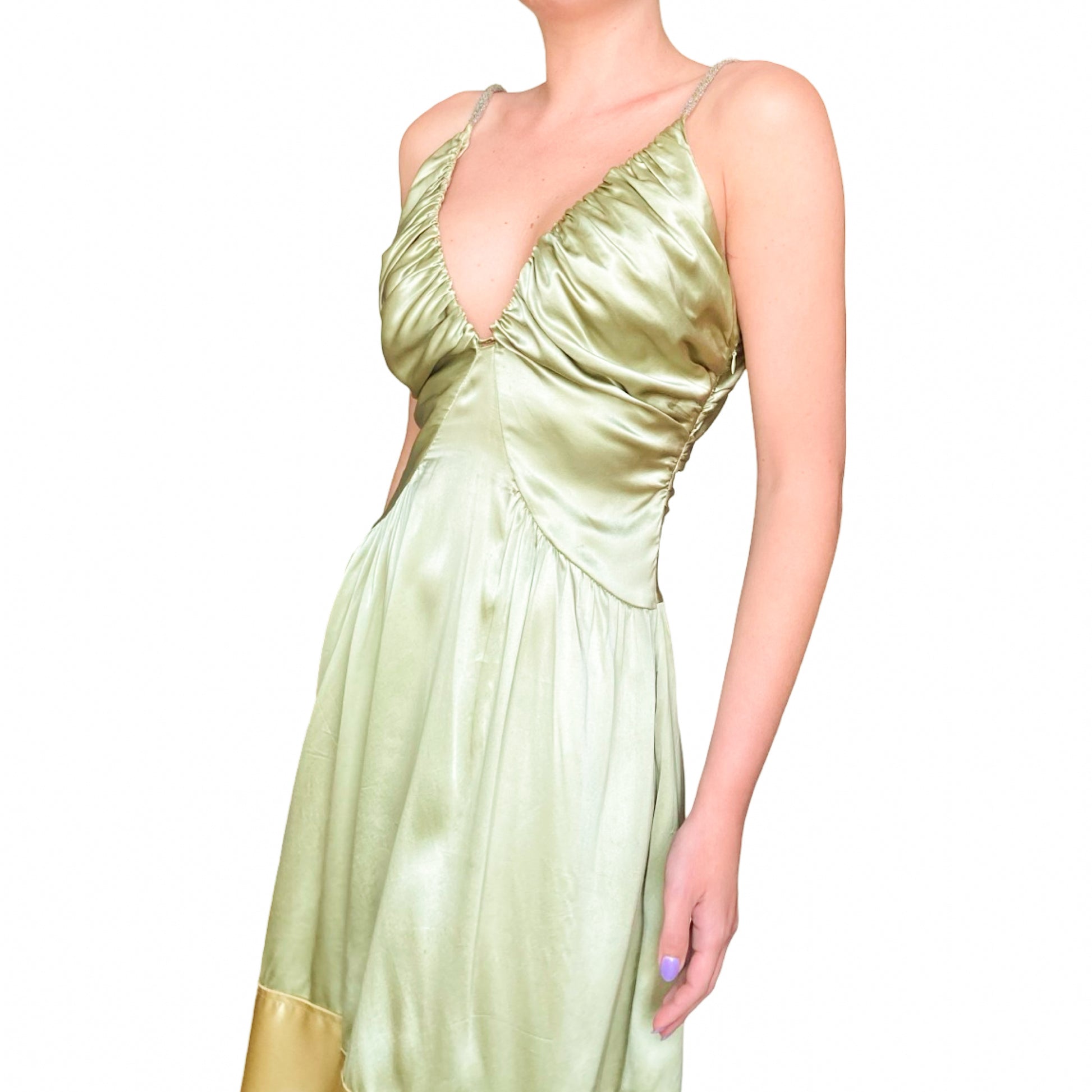 This iconic 100% silk cocktail dress is from the Chloé Spring 2005 Ready-to-Wear collection & seen on the Runway , designed by Phoebe Philo. The dress is in sage green with a gold silk bottom, featuring a deep décolleté and silver tube-beaded straps. It has a hidden side zipper for a smooth fit. Crafted in pale chartreuse silk, it showcases a plunging V neckline. The back of the dress mirrors the V neckline, with silver beadwork extending from the straps. This gorgeous dress exemplifies the effortless elegance of Chloé's designs.