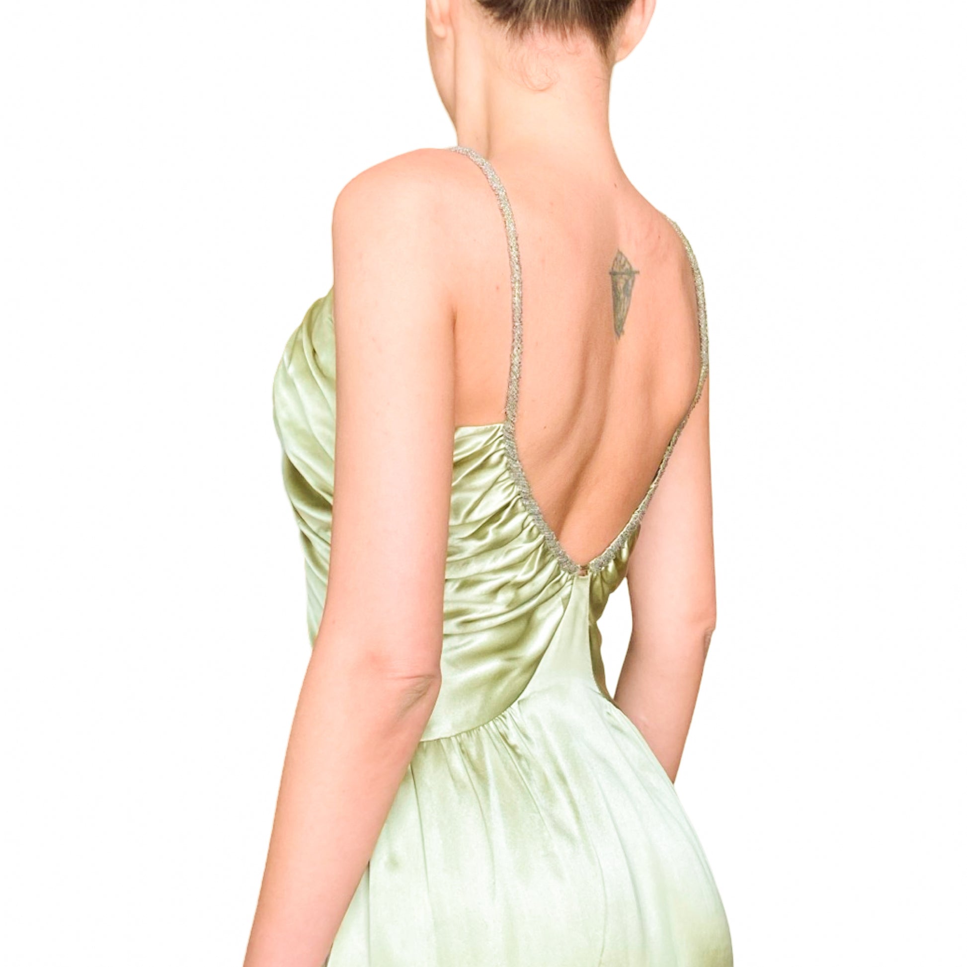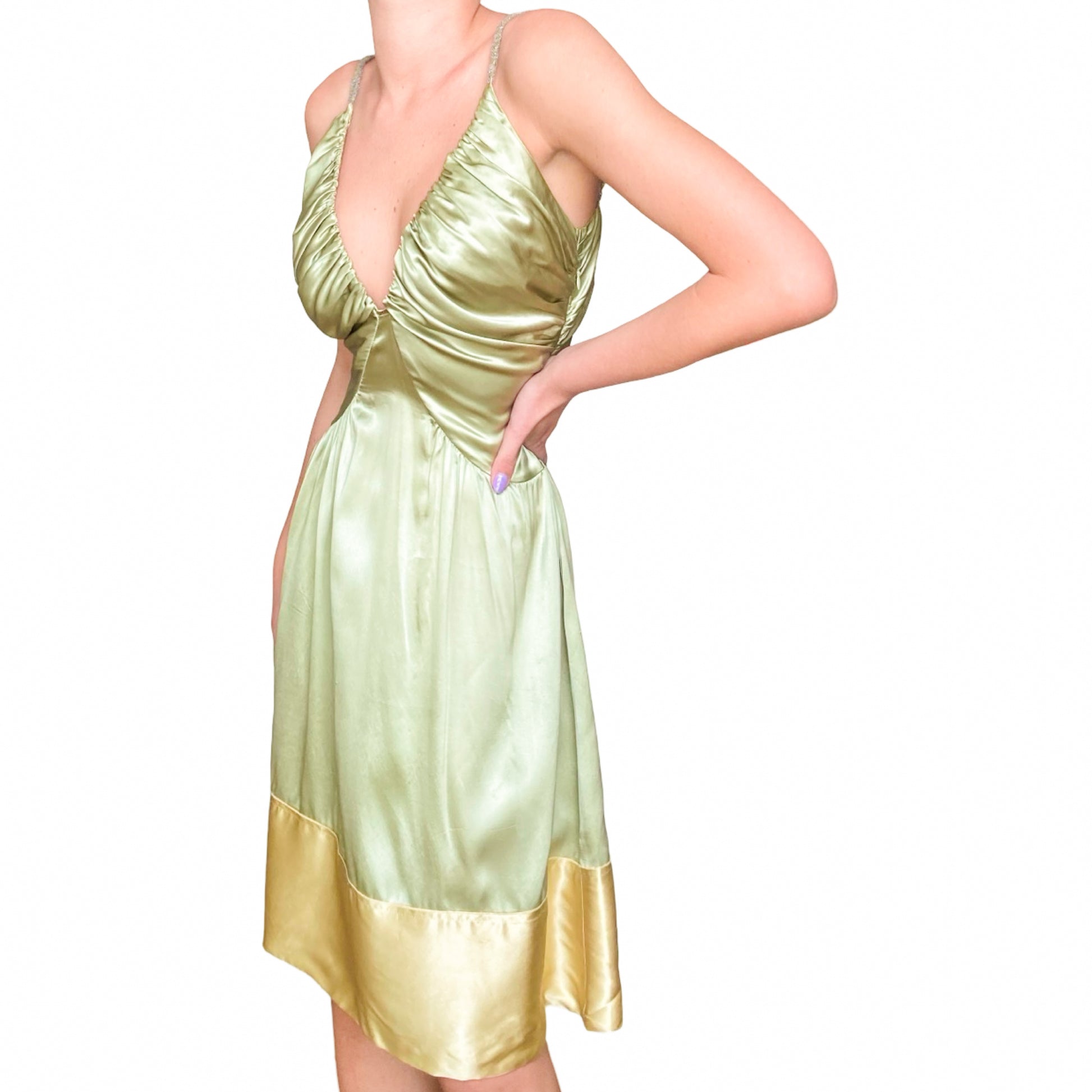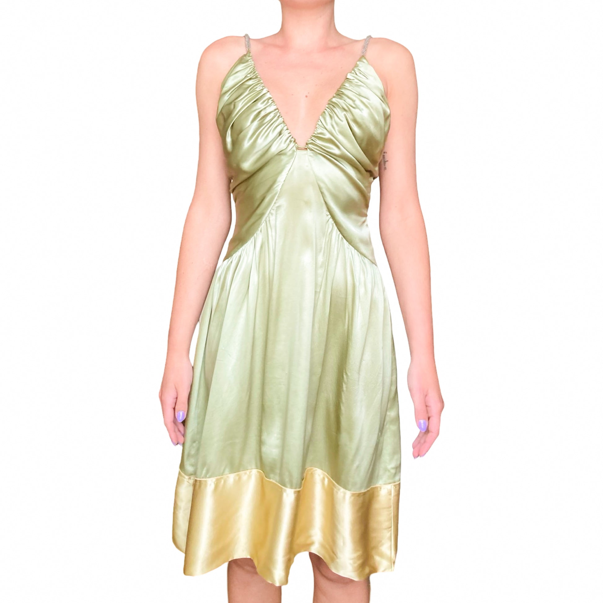 This iconic 100% silk cocktail dress is from the Chloé Spring 2005 Ready-to-Wear collection & seen on the Runway , designed by Phoebe Philo. The dress is in sage green with a gold silk bottom, featuring a deep décolleté and silver tube-beaded straps. It has a hidden side zipper for a smooth fit. Crafted in pale chartreuse silk, it showcases a plunging V neckline. The back of the dress mirrors the V neckline, with silver beadwork extending from the straps. This gorgeous dress exemplifies the effortless elegance of Chloé's designs.