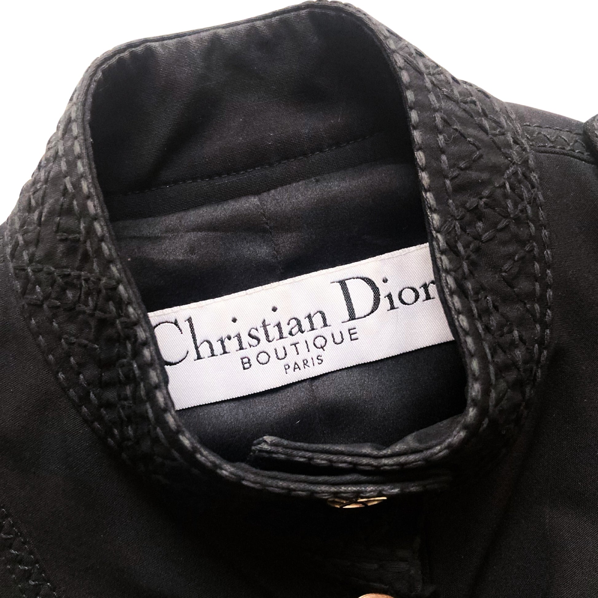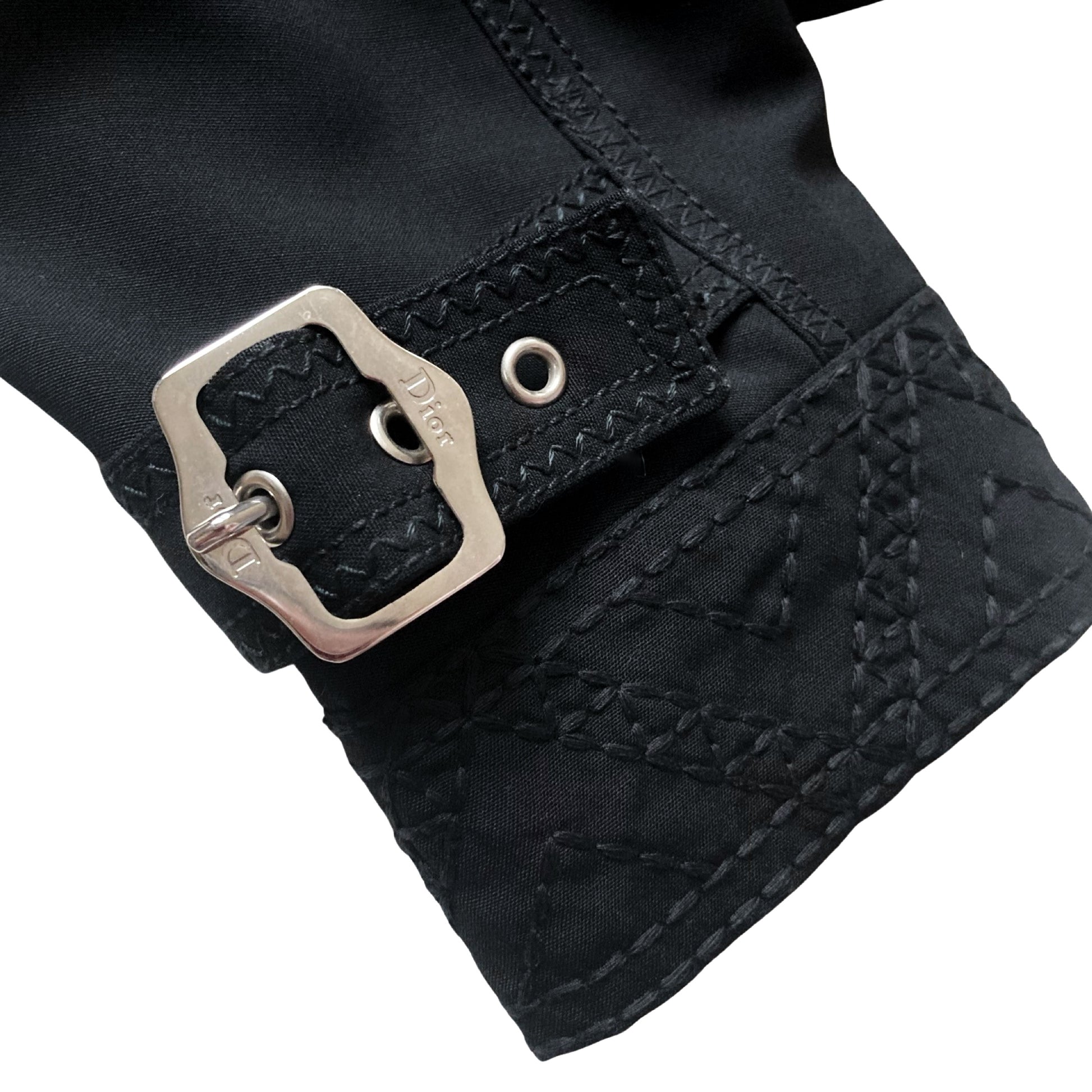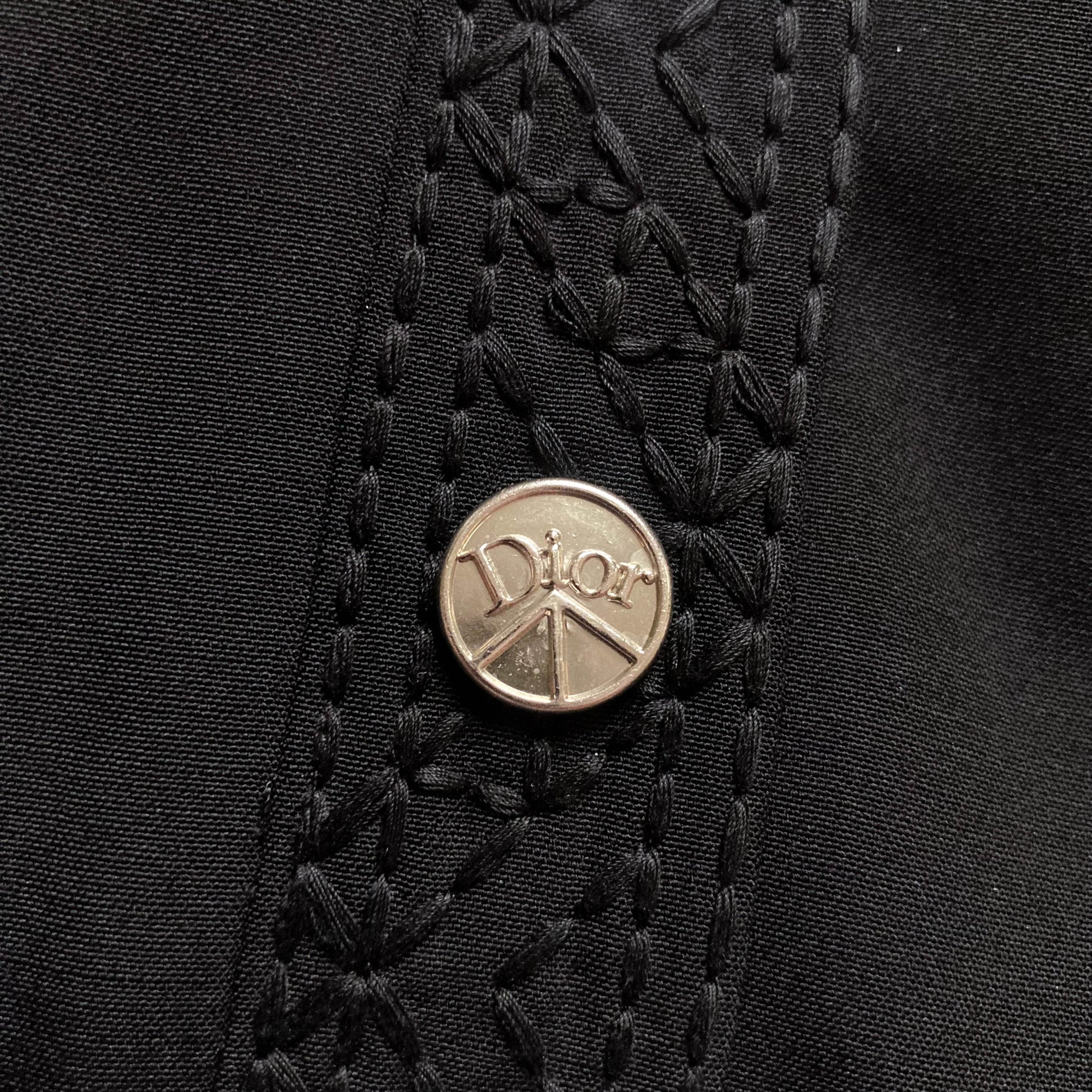 Tise Dior by Galliano windbreaker jacket features a parachute-style cut. Embroidered with striking precision, the stitching adds an extra layer of detail and texture to the overall design. With a fitted silhouette, elongated sleeves, and military-inspired details, including hardware and chest pockets. Buttons has the Peace symbol over the Dior Logo. I love how Galliano plays with paradoxes, appropriating military cuts while adding symbols of peace. More genius at work. Super interesting gathered cut & roundish sleeves. Can also be worn as a blouse. As seen on Milla Jovovich at the RTW Spring 2005 show front row in khaki and embroidered. A similar gold version also seen on the runway. Only one on internet, & she is here :)