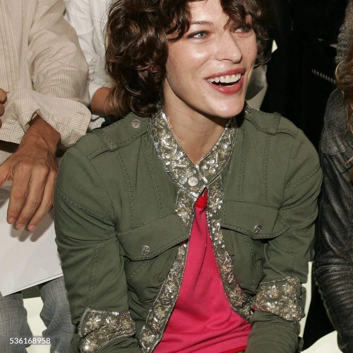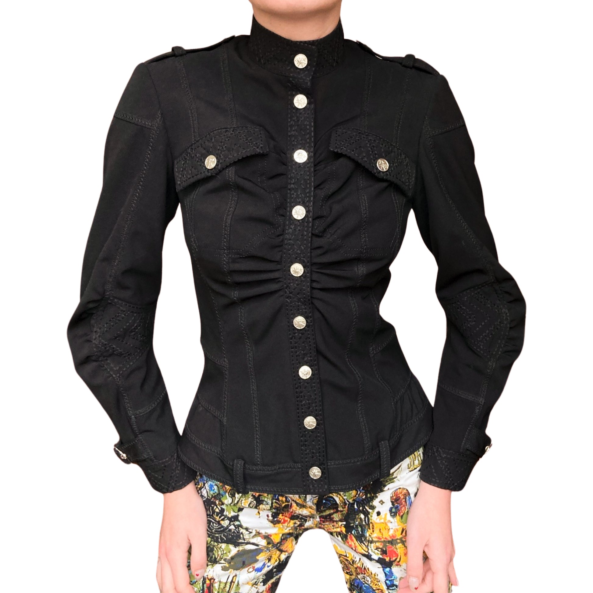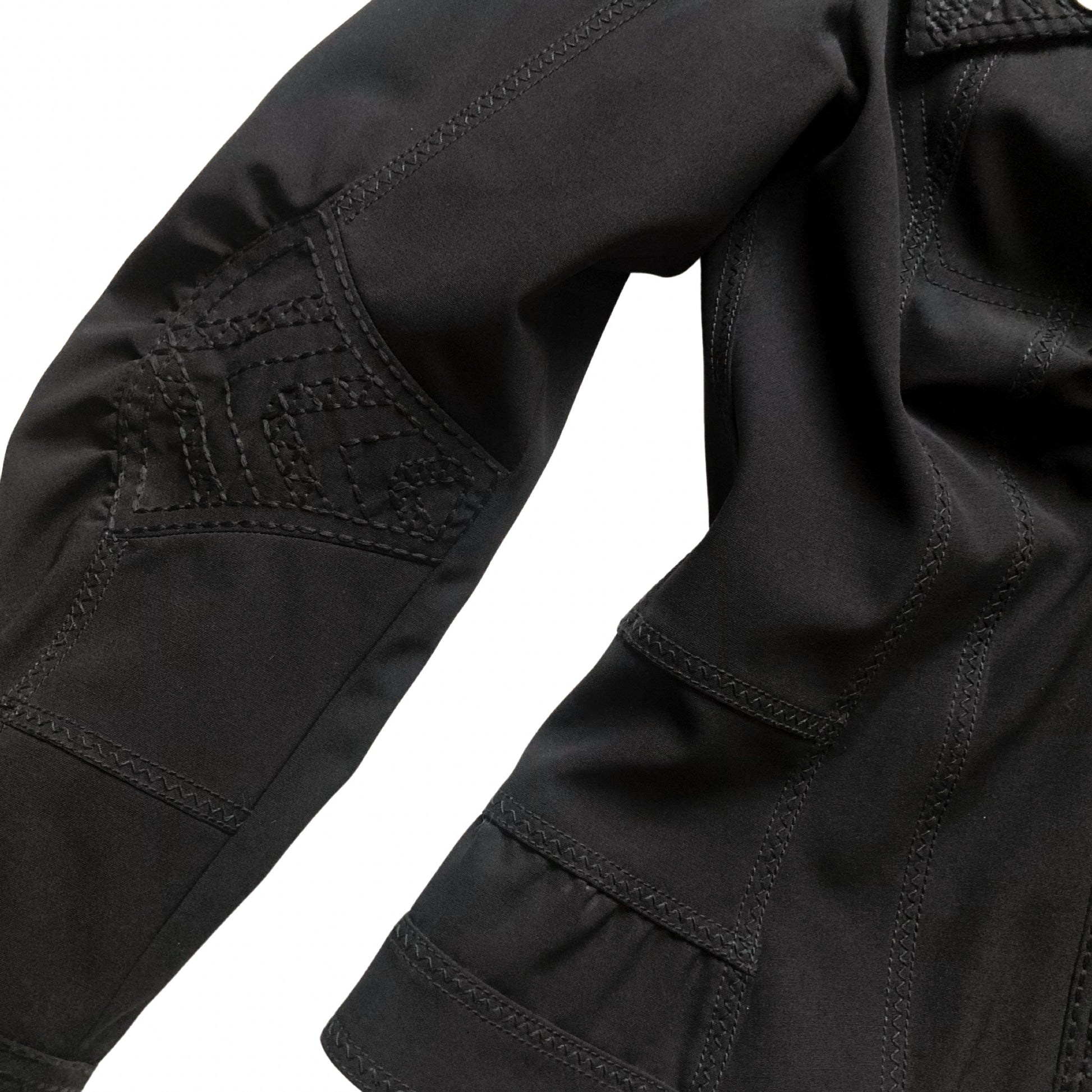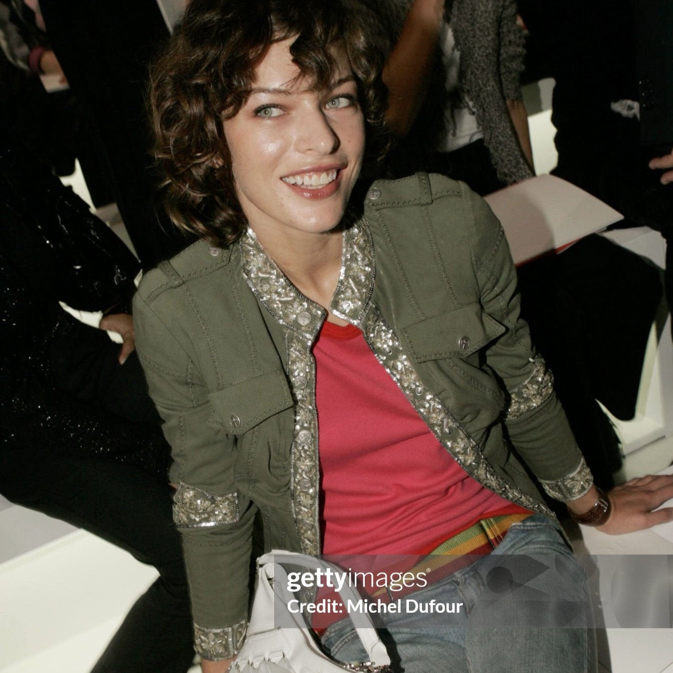 Tise Dior by Galliano windbreaker jacket features a parachute-style cut. Embroidered with striking precision, the stitching adds an extra layer of detail and texture to the overall design. With a fitted silhouette, elongated sleeves, and military-inspired details, including hardware and chest pockets. Buttons has the Peace symbol over the Dior Logo. I love how Galliano plays with paradoxes, appropriating military cuts while adding symbols of peace. More genius at work. Super interesting gathered cut & roundish sleeves. Can also be worn as a blouse. As seen on Milla Jovovich at the RTW Spring 2005 show front row in khaki and embroidered. A similar gold version also seen on the runway. Only one on internet, & she is here :)