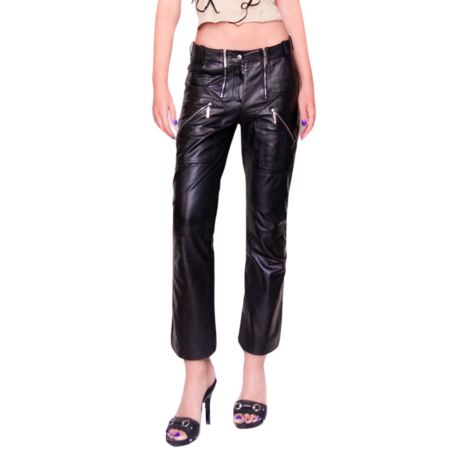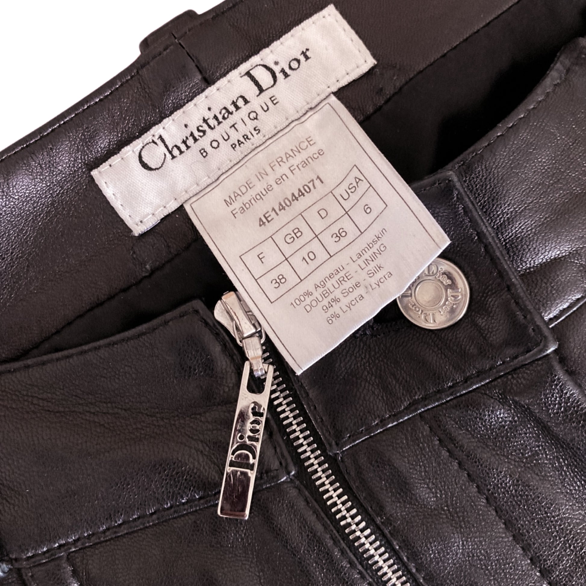 The leather pants of a lifetime from the Spring Summer 2002 collection of Christian dior by John Galliano. Seen on the runway on the Look 2 as a skirt. Expertly crafted from soft calf leather, the mid to high rise and subtly flared cut elegantly flatter your figure. It's screaming luxury ! Even the lining is made with silk. It's like wear a second skin, it's sooo confortable. Zip pullers, buttons, & all hardware are signed. 7 pockets ( 5 on front, 2 in the back ). You can enlarge the waist by using 2 zippers). A jacket from this collection was seen on Isabel Adjani, & the hardcore bag was pictured for the official campaign on Gisele Bündchen. The pants is the only one on the whole internet. Icon !