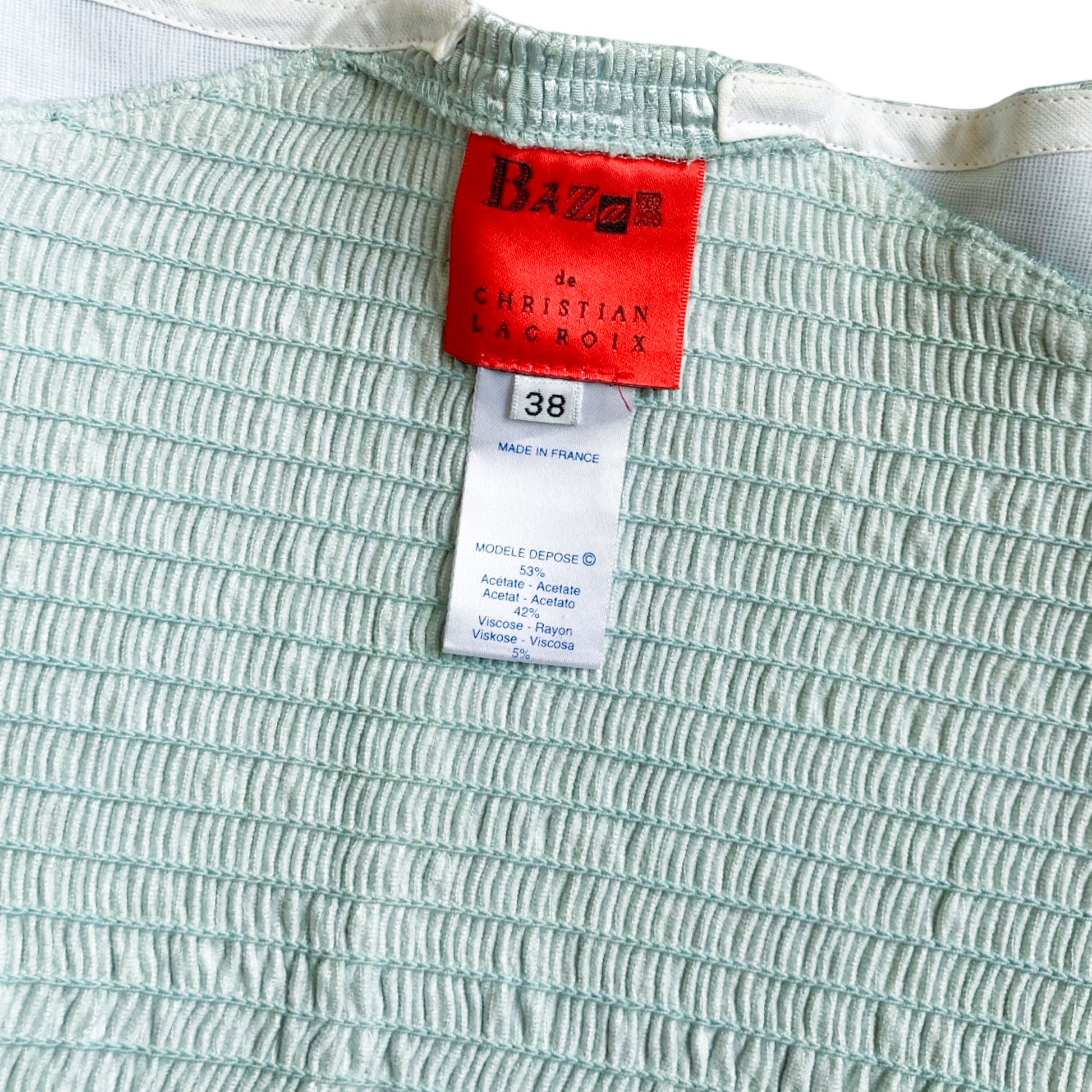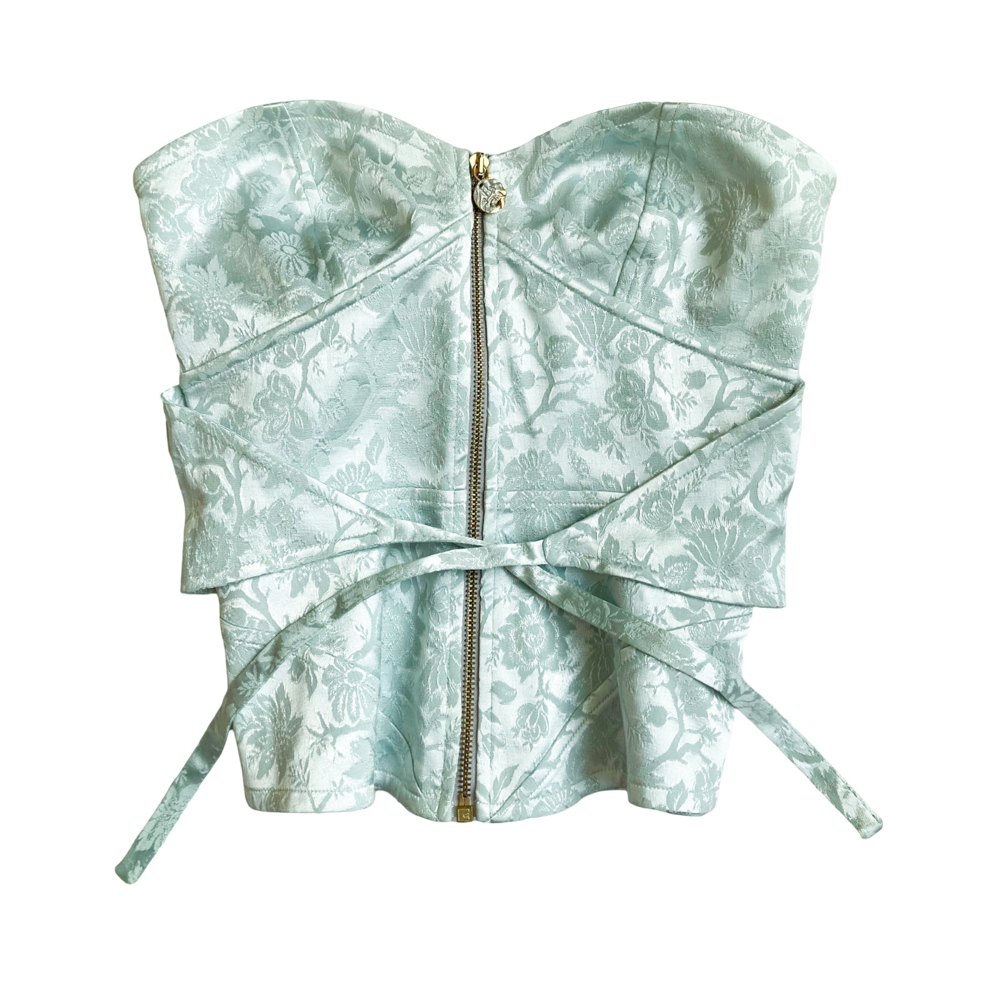 A stunning boned brocarde bustier in aqua-green floral patterns. It features a front zip closure adorned with a signature Lacroix emblem pull. The structured design includes a sweetheart neckline, while the back has a tie detail that can be styled as a bow or left draping elegantly. The back is also gathered with stretch. A true vintage grail ! Very hard to come by!