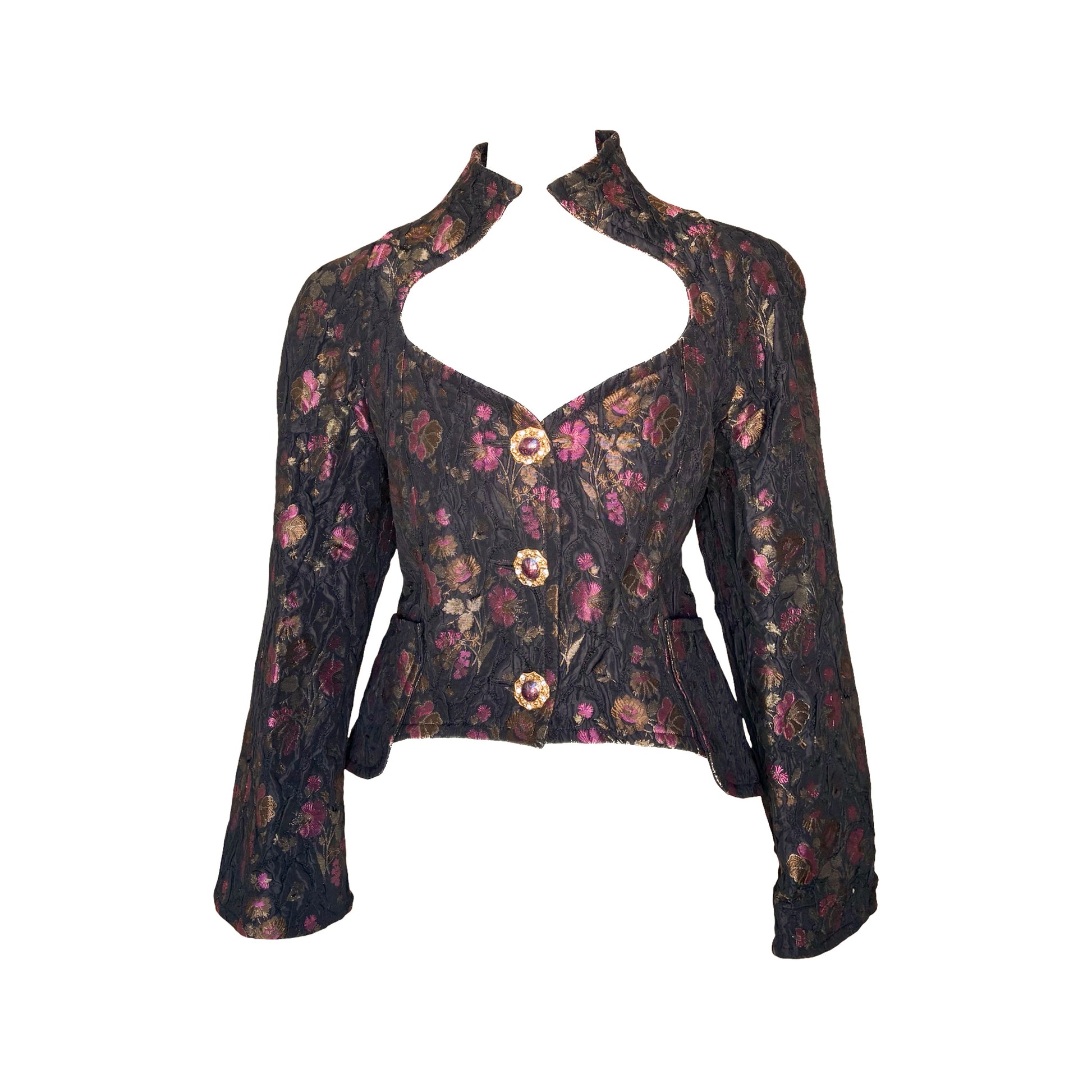 Christian Lacroix masterpiece from Fall 1996 crafted from richly textured floral brocade woven with metallic threads in deep gold, rose, and violet tones. Its sculpted silhouette features a dramatic heart-shaped neckline framed by a high split collar, slightly flared sleeves, and a front hem that sits slightly shorter than the back. The sides are detailed with two decorative basque panels that mimic pocket, enhancing the jacket’s hourglass architecture. The front closes with jeweled buttons set in ornate gold frames, each like a miniature brooch. Fully lined and tailored to perfection. Seen on the runway.