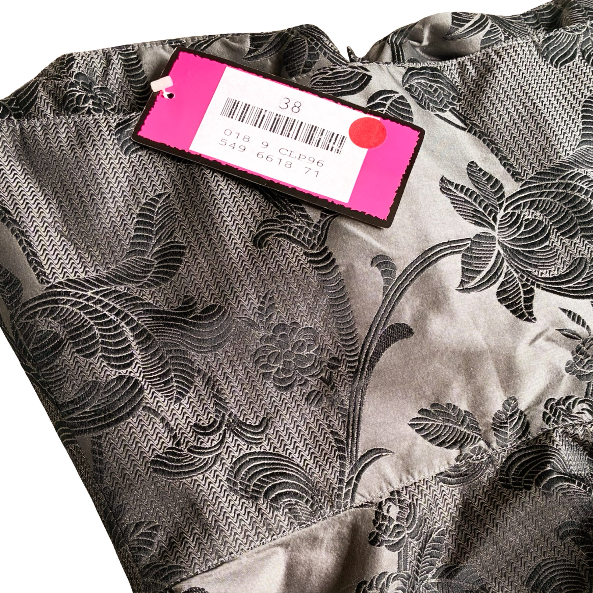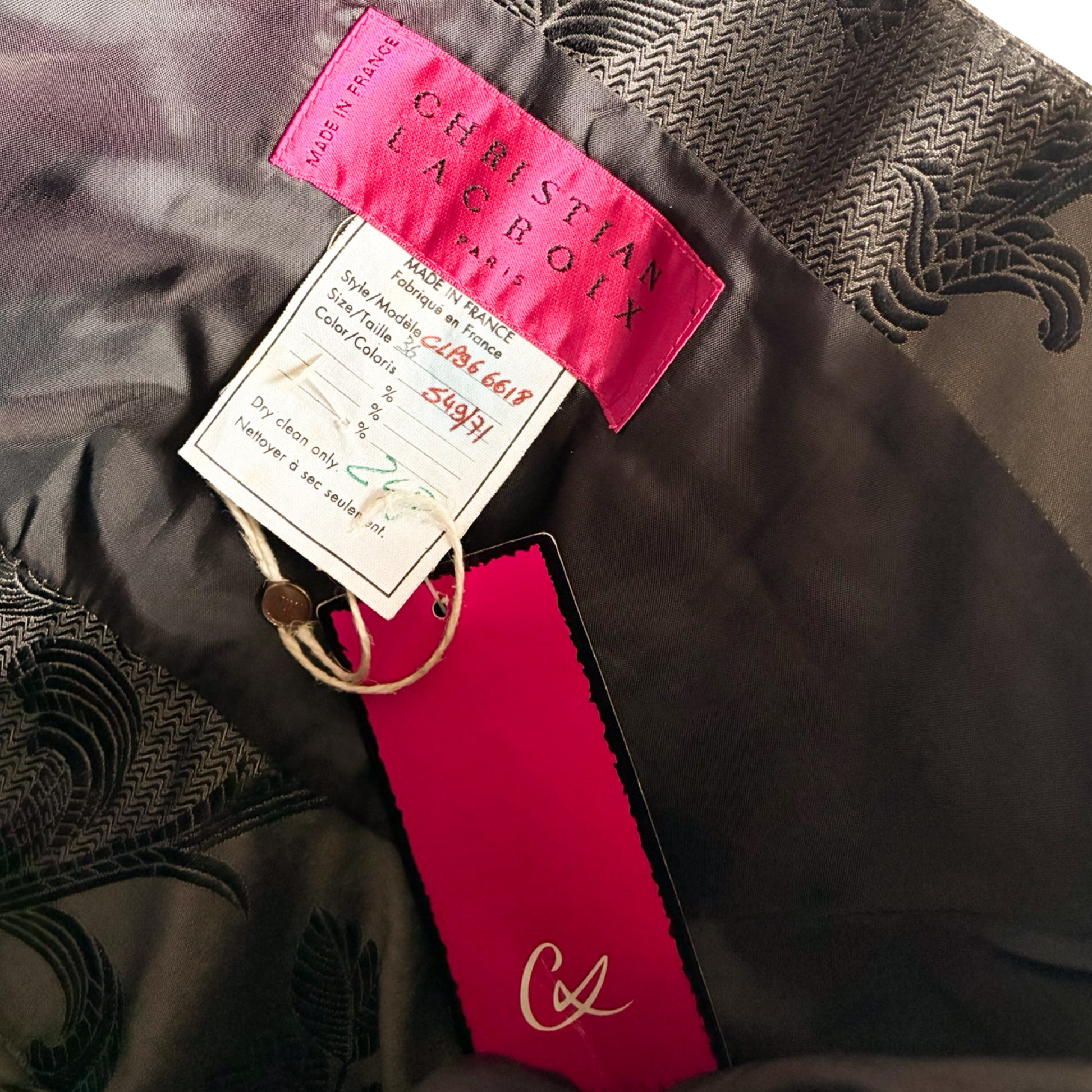 Christian Lacroix Spring 1996 velvet and jacquard corset featuring a sculptural strapless silhouette, crafted in panels of dark grey silk-blend jacquard with floral motifs and rich velvet inserts. The fitted bodice is structured with internal boning, a sweetheart neckline, and a peplum flare at the waist, accentuating the hourglass shape. At the front, a central zipper is adorned with the iconic gold Lacroix charm, adding a touch of opulence. A true archival piece from the 1996 runway, emblematic of Lacroix’s theatrical couture heritage.