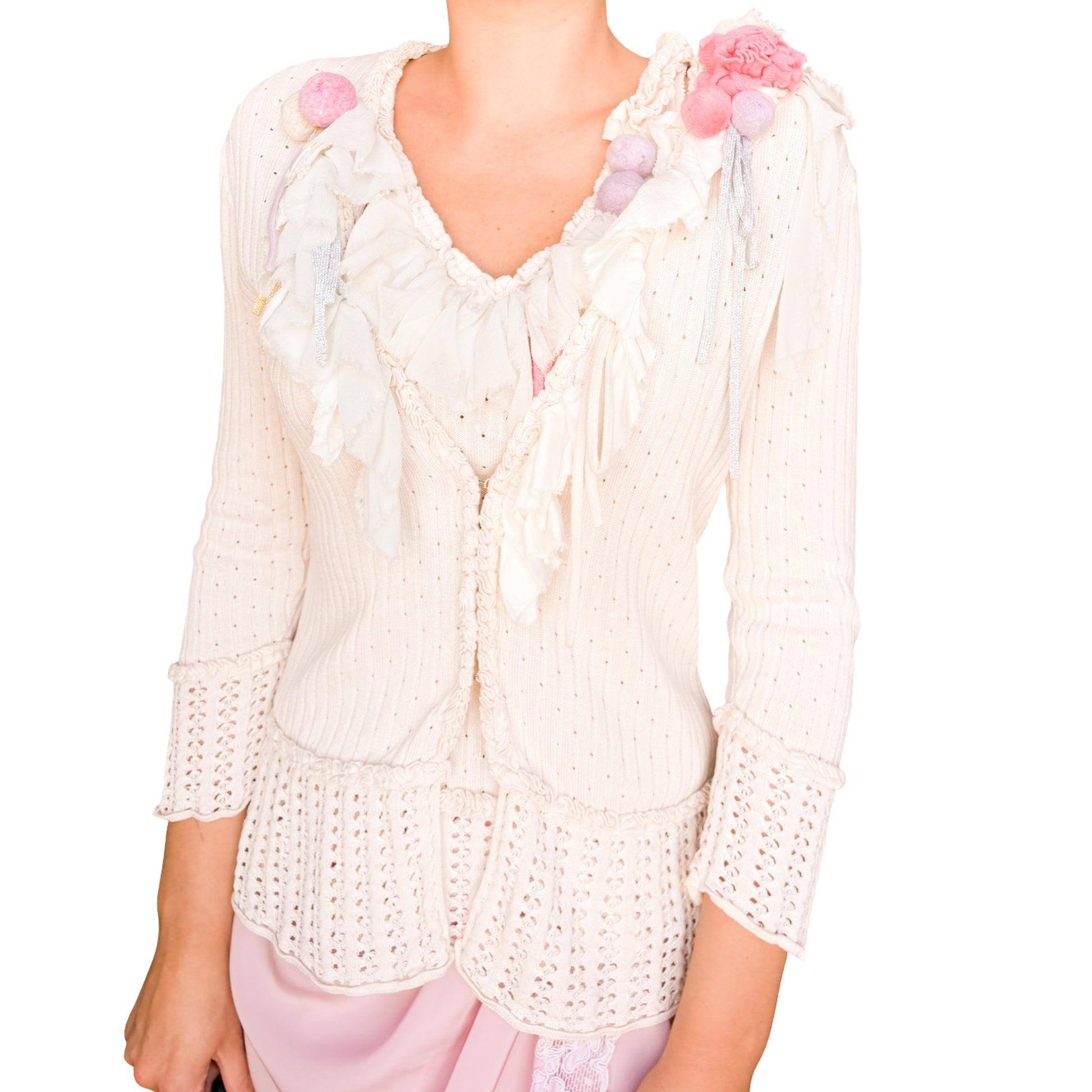 Rare silk-blend twin set by Christian Lacroix Bazar from the 2000s, showcasing the designer’s signature theatrical embellishment. The cardigan and matching knit tank feature pointelle ribbed construction with ruffled chiffon appliqués, silk ribbons, pompons and floral details in pastel and jewel tones. It's slightly stretchy & the cardigan closes with hooks. Very hard to come by.