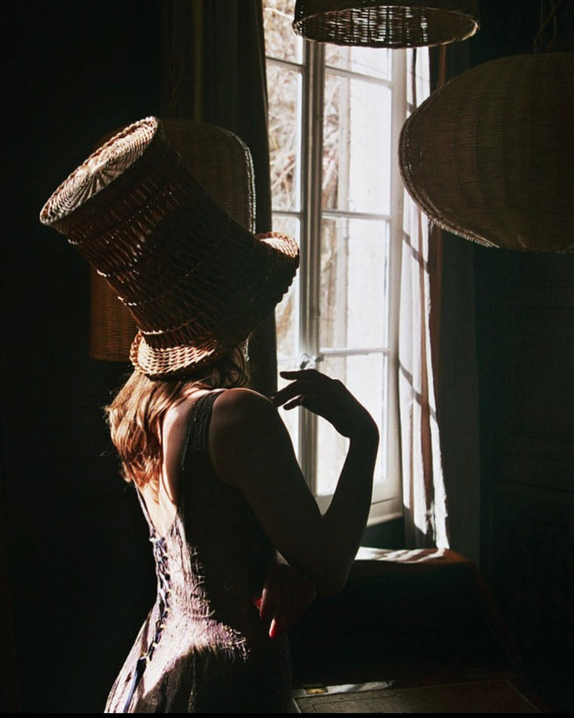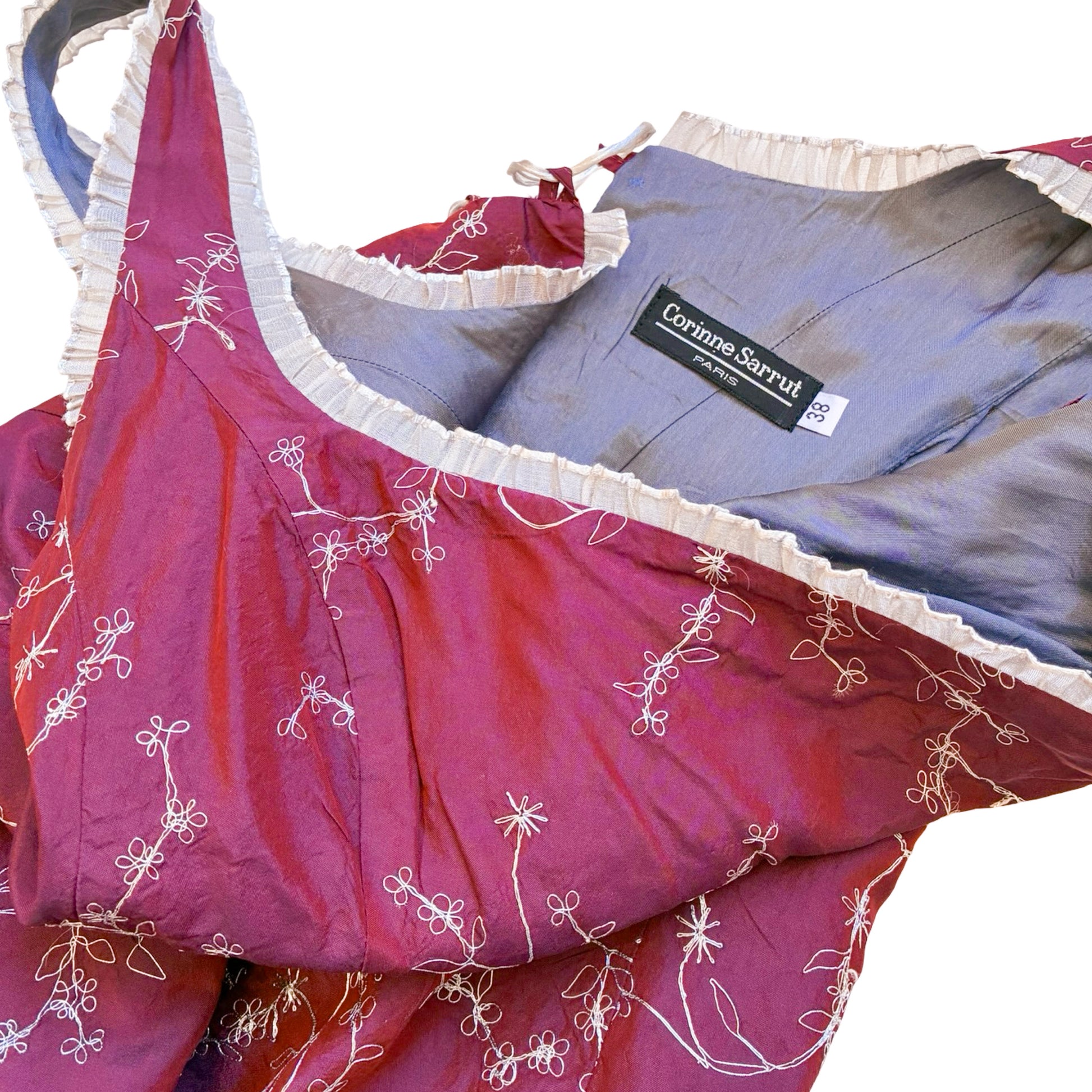 From the 1990s, this Corinne Sarrut (one of the designers of Cacharel) gown captures a romantic neo-Victorian sensibility. Crafted from luminous cherry-red silk (with blue reflects ) embroidered with silver floral vines, it features a structured bodice that can be worn on or off the shoulders, framed by pleated silver ribbon trim. The corset-style lace-up back sculpts the waist before flaring into a full skirt that moves with poetic grace. A piece that blends historical romanticism with the effortless elegance of 90s French couture. Extremely rare. The dresses were shot for official campaign by Sarah Moon.