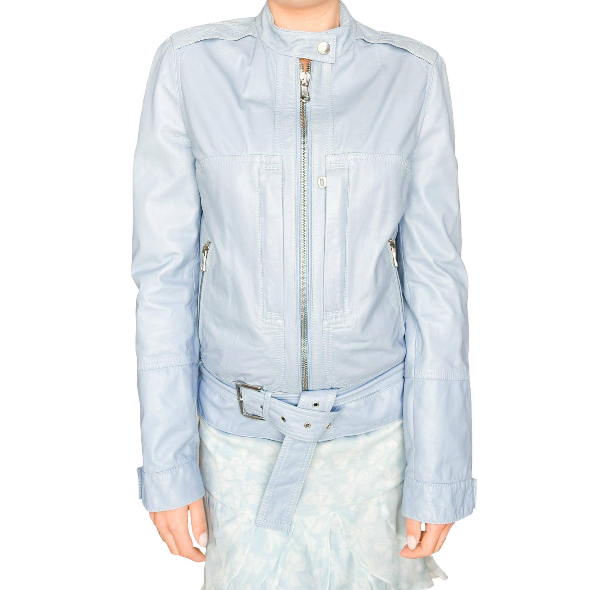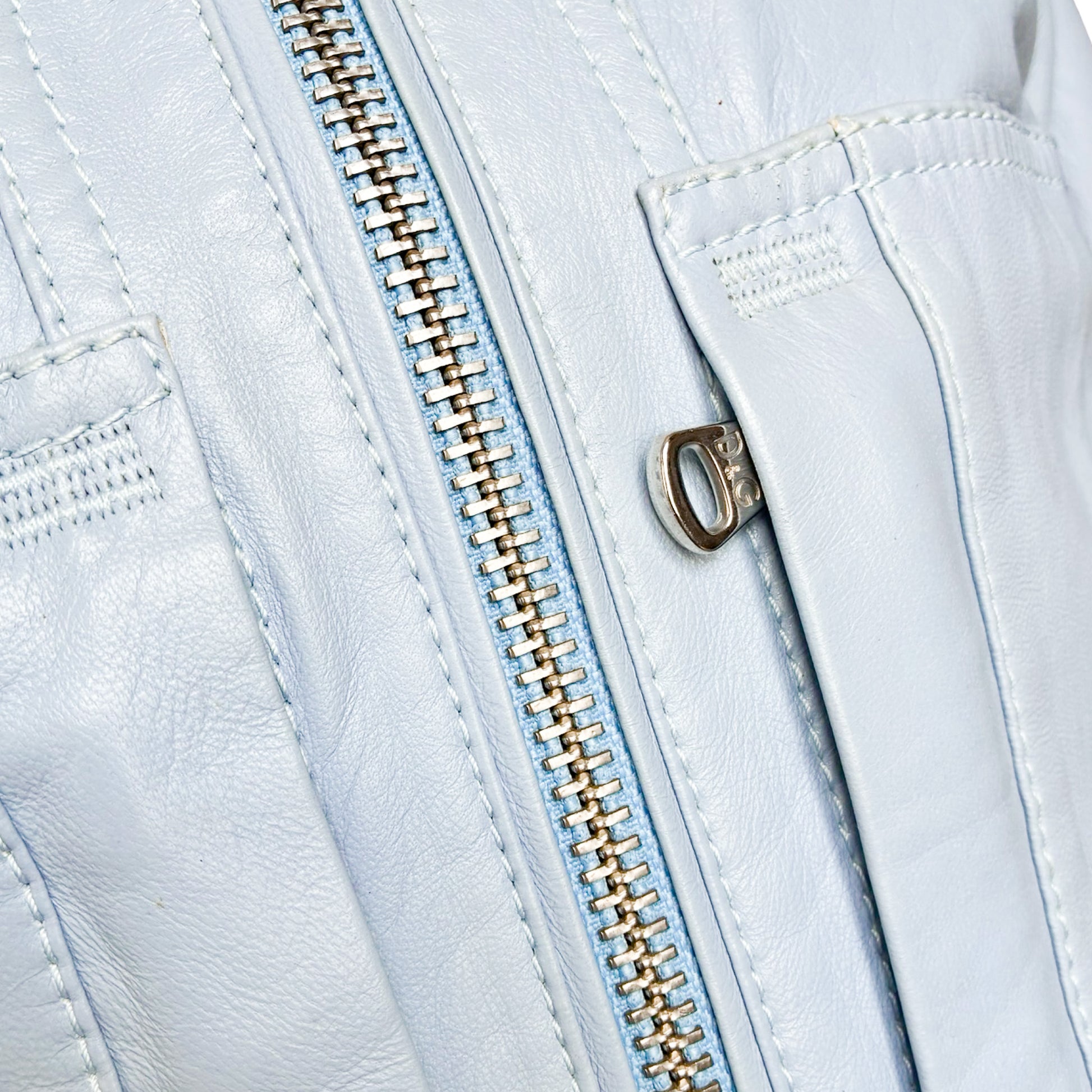 Exquisitely crafted from buttery soft lambskin in a rare baby blue hue, this D&G Dolce & Gabbana biker jacket features a refined slim-cut silhouette with distinctive shoulder paneling and a waist-defining integrated belt. The interior reveals a charming pinstripe silk-blend lining, while the exterior is elevated by high-shine silver hardware, branded zipper pulls, and functional zippered cuffs for an adjustable fit. A nostalgic yet perennial masterpiece, it perfectly balances Italian rebellion with a soft, romantic palette for the modern collector.