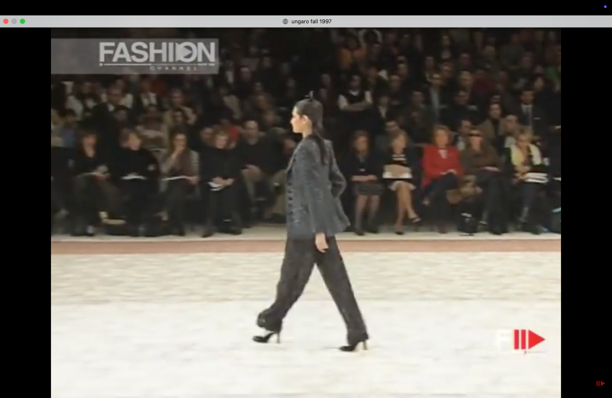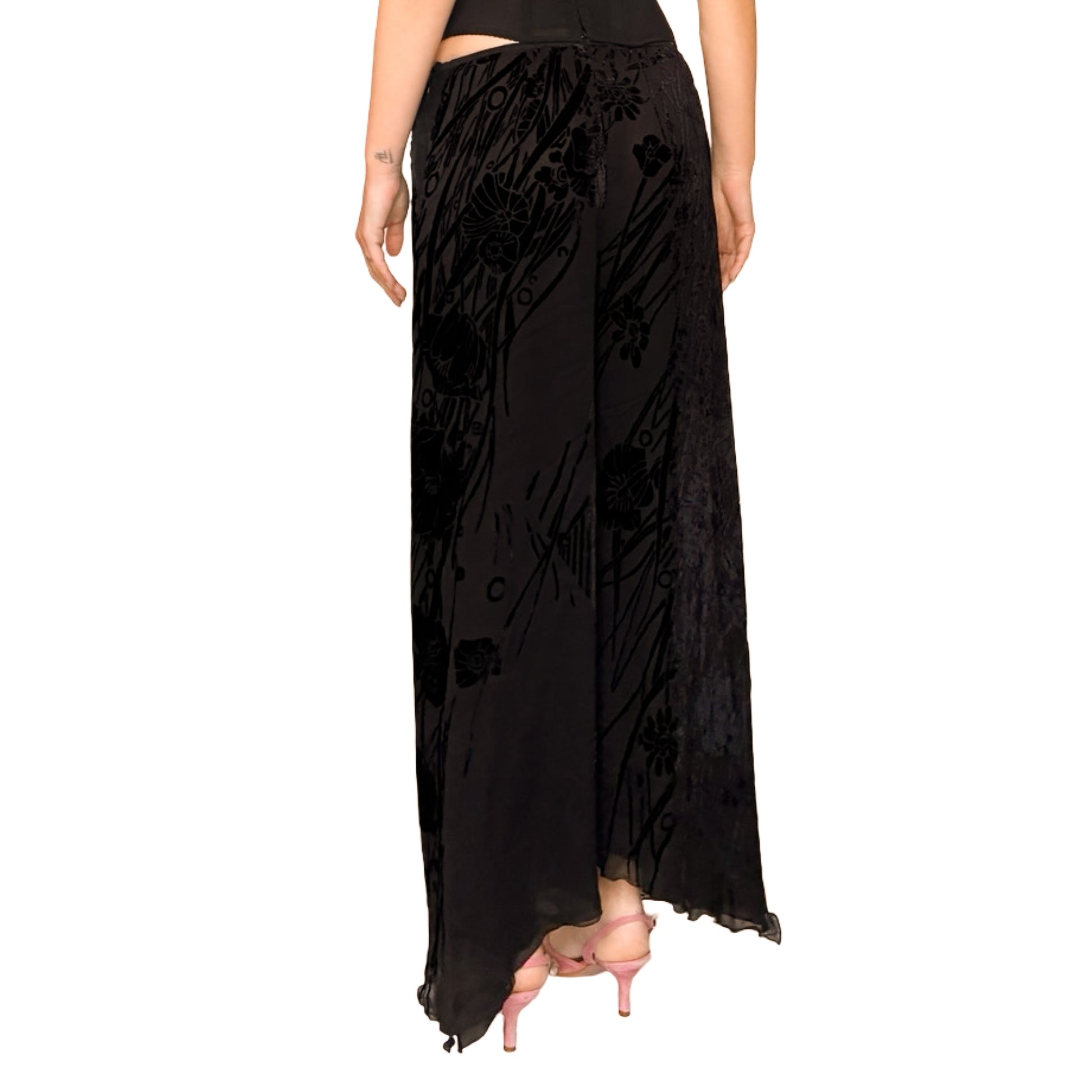 These rare Emanuel Ungaro archival trousers from the Fall 1997 runway are crafted from luxurious black silk devoré with an floral "burned velvet" texture. The versatile elasticated waistband allows for a high or low-waisted fit, flowing into a flared silhouette with distinctive beveled, asymmetrical hems. Depending on the styling height, the length transforms into a sophisticated capri-inspired cut, blending a raw-edge dark romanticism with effortless Parisian chic.