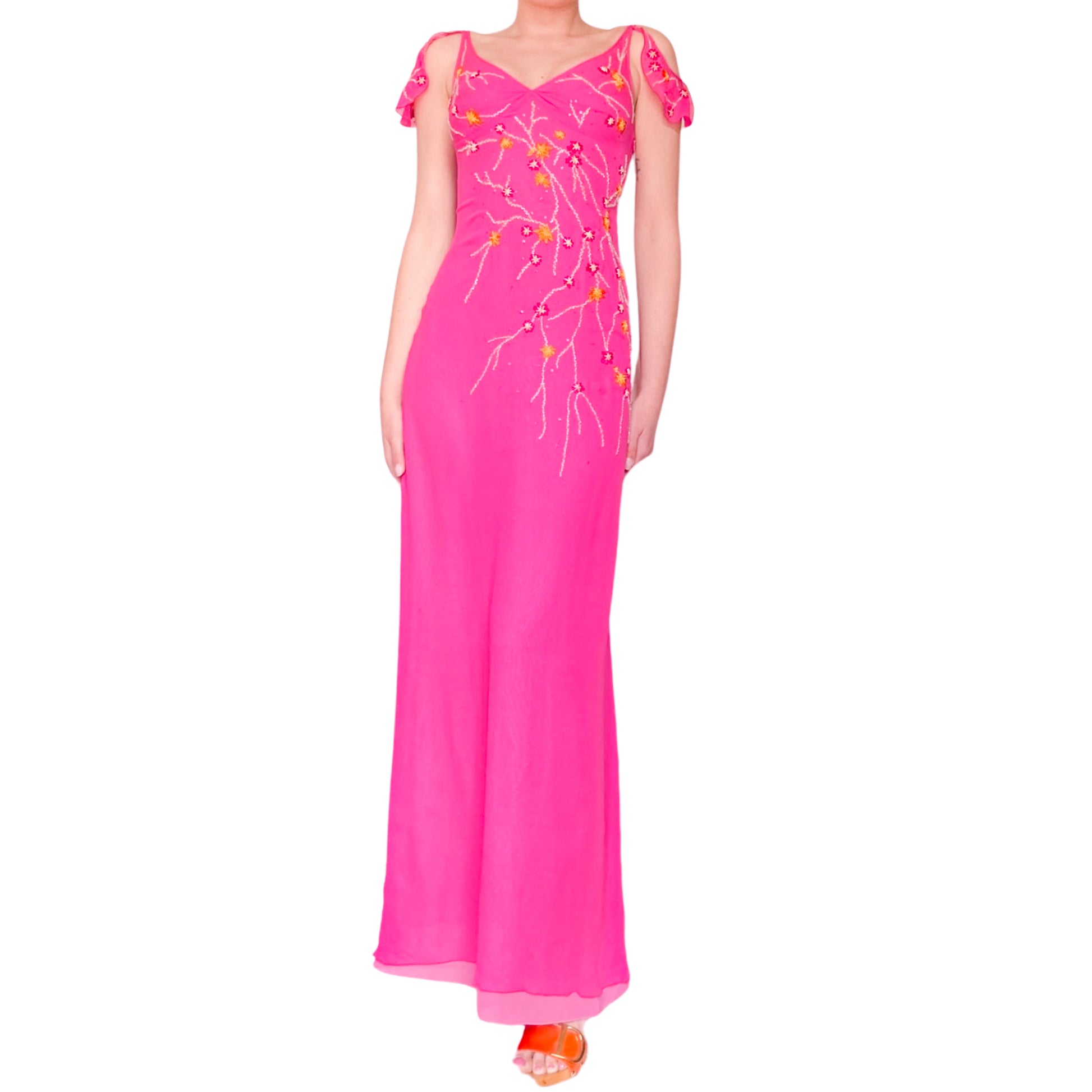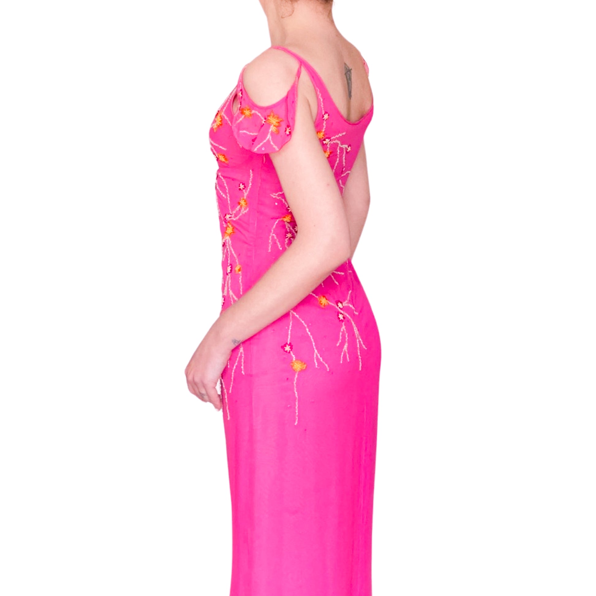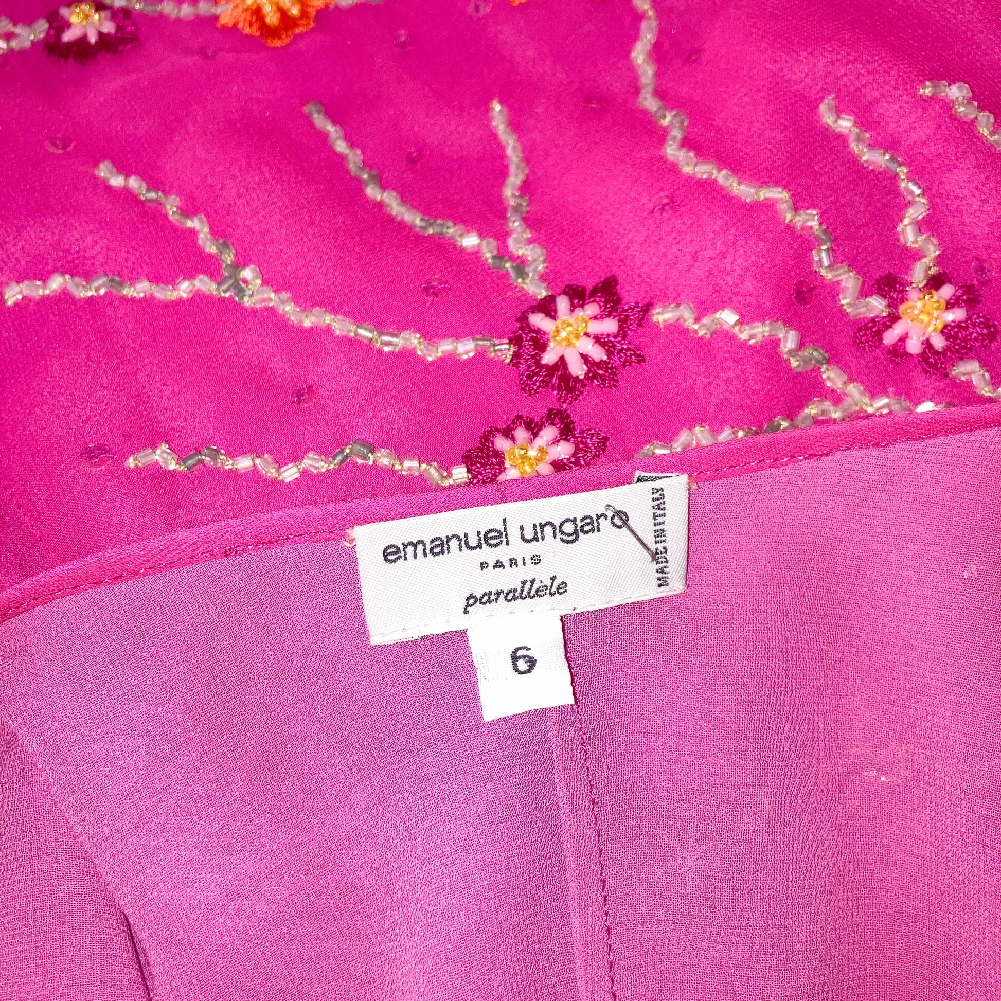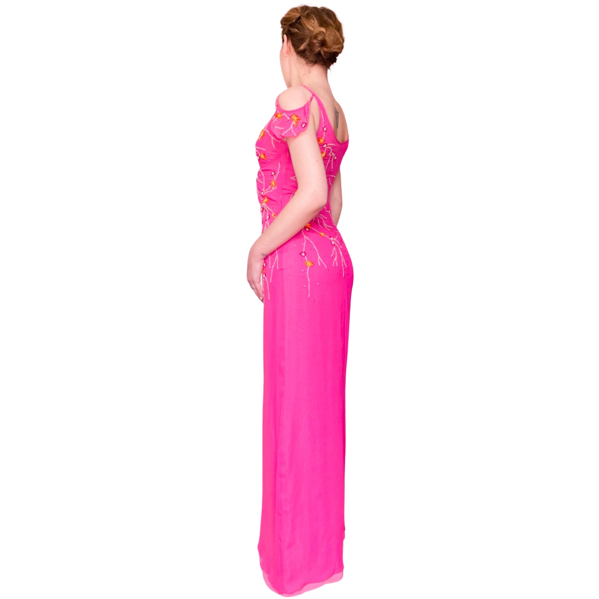 Goddess dress in fuchsia pink all hand embroidered with orange and gold floral designs. Stunning open work & embellishments on the sleeves. Floor length, V neck lined, enhanced with draped cut. Similar dresses seen on the campaign & runway of the spring summer 1999 collection. She has to be worn for an amazing even. From the pret à porter line of Emanuel Ungaro : Parallele.
