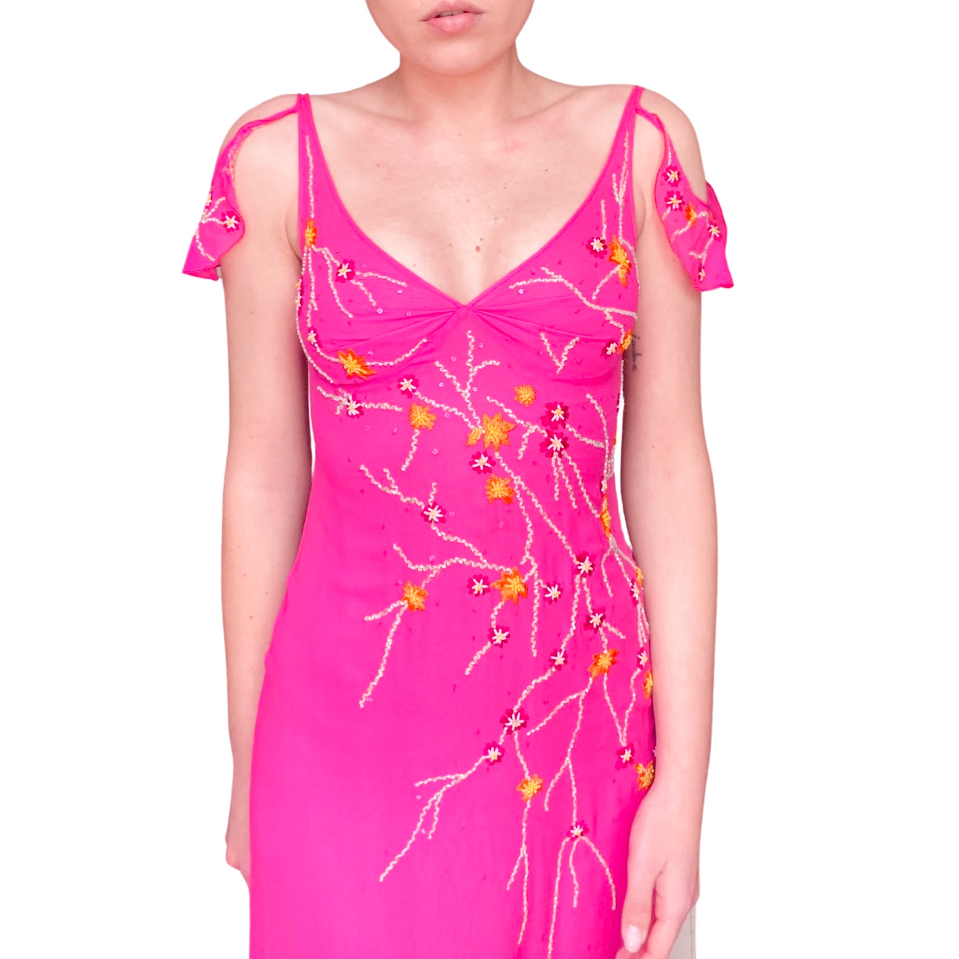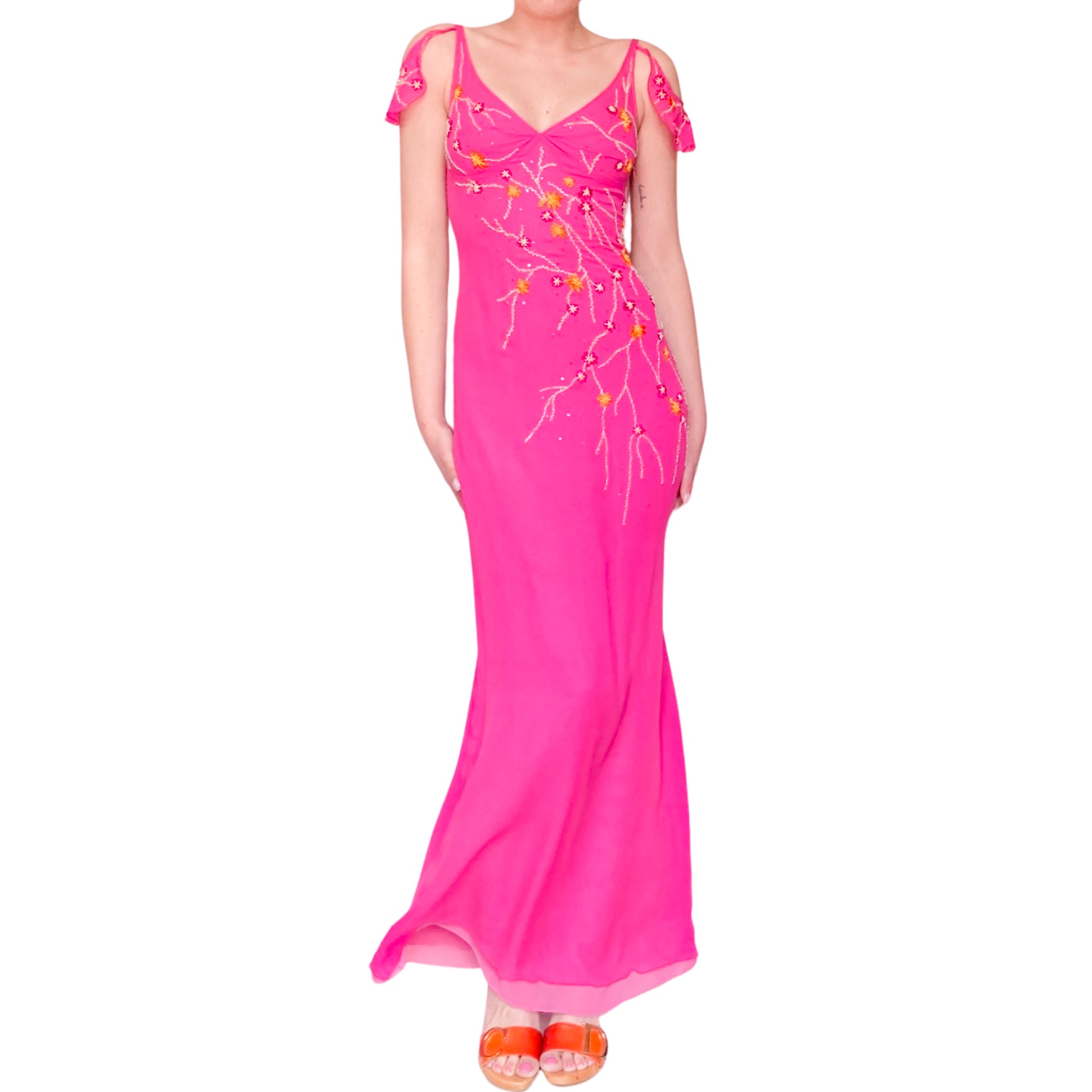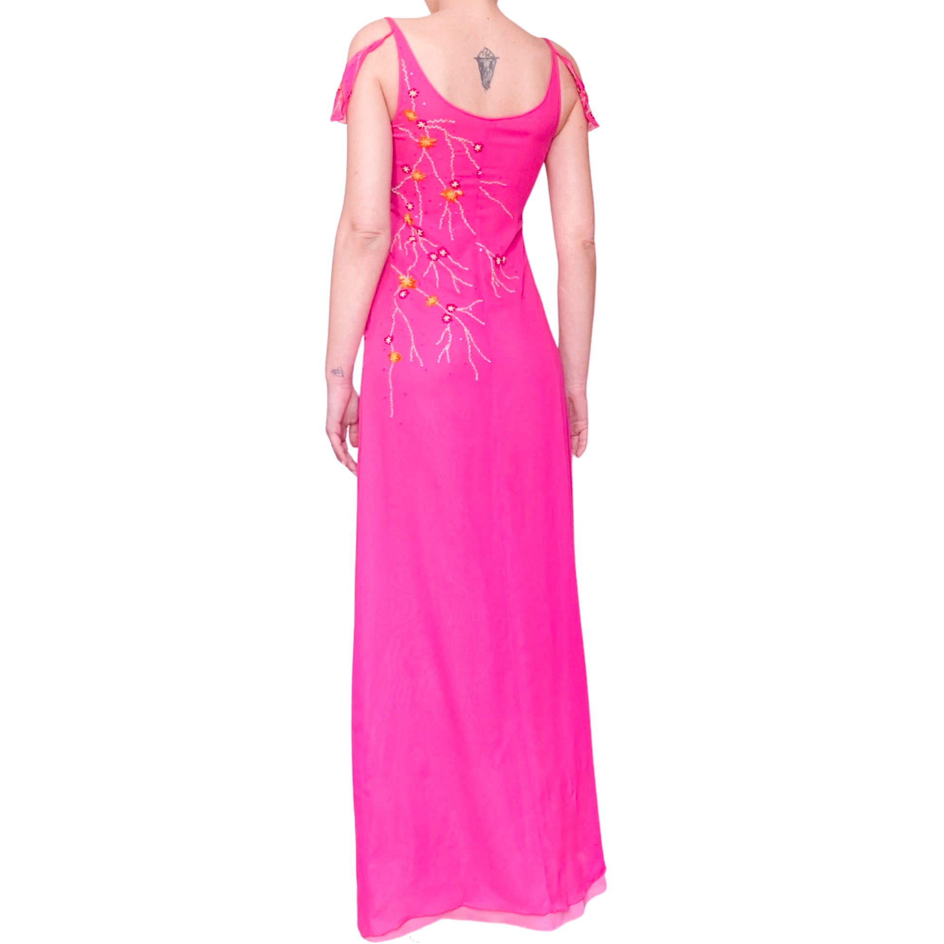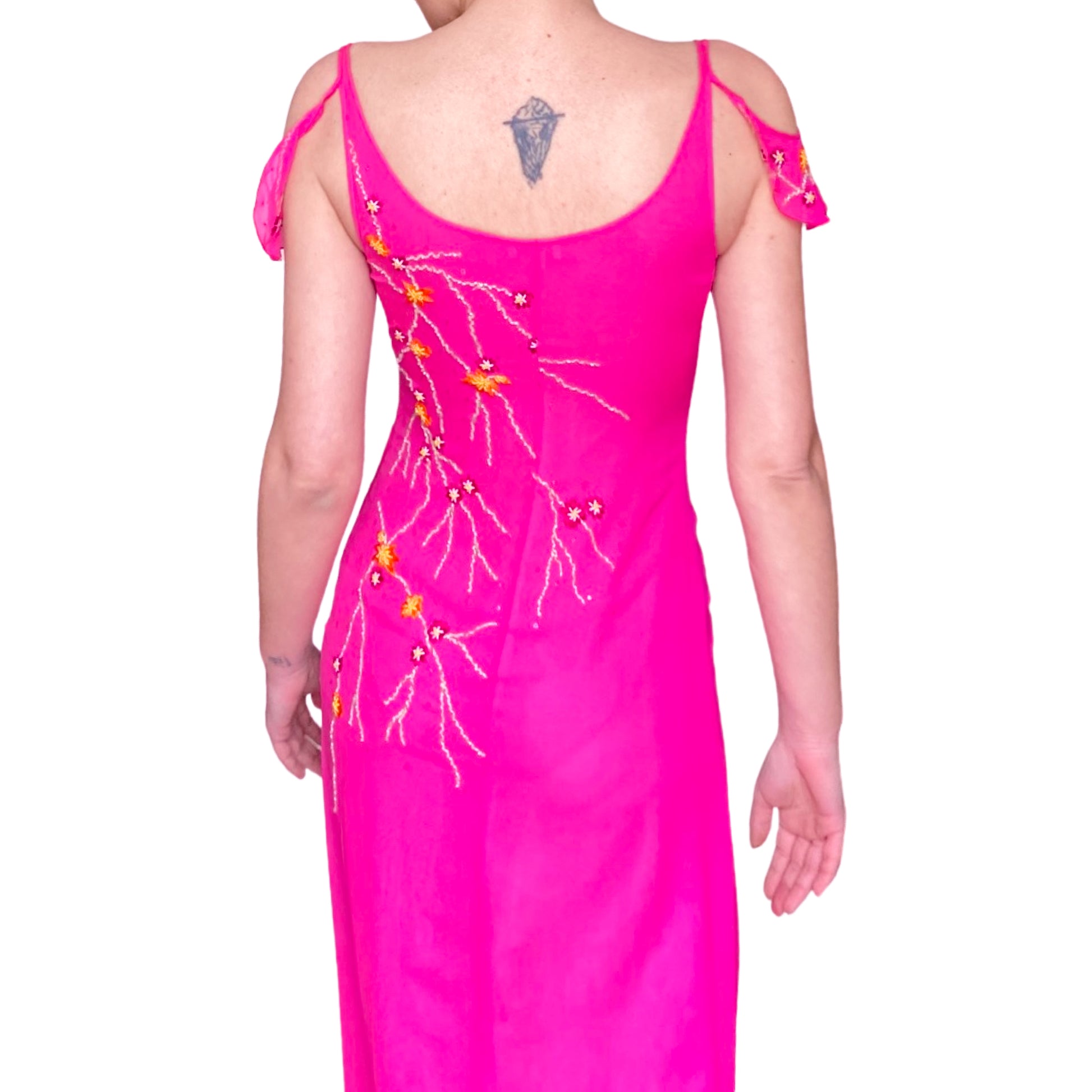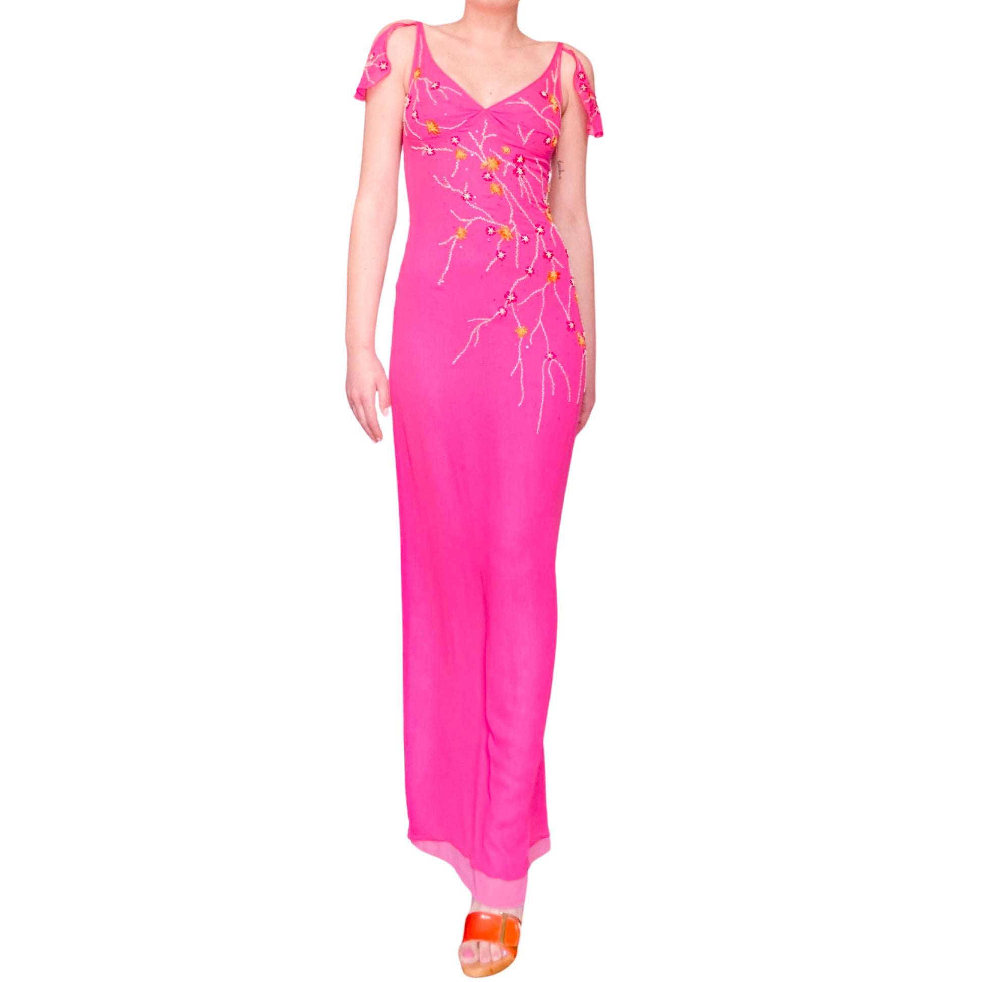 Goddess dress in fuchsia pink all hand embroidered with orange and gold floral designs. Stunning open work & embellishments on the sleeves. Floor length, V neck lined, enhanced with draped cut. Similar dresses seen on the campaign & runway of the spring summer 1999 collection. She has to be worn for an amazing even. From the pret à porter line of Emanuel Ungaro : Parallele.