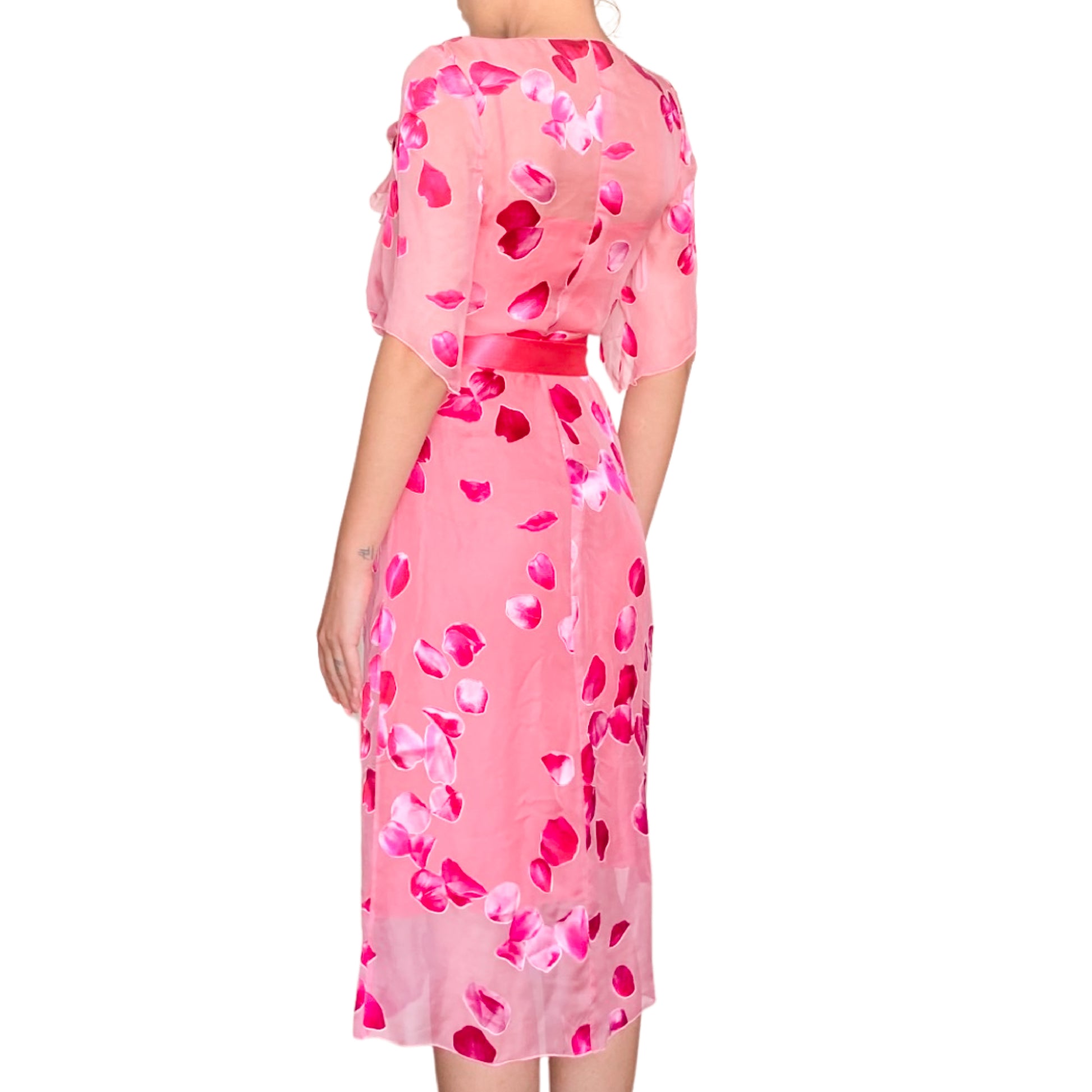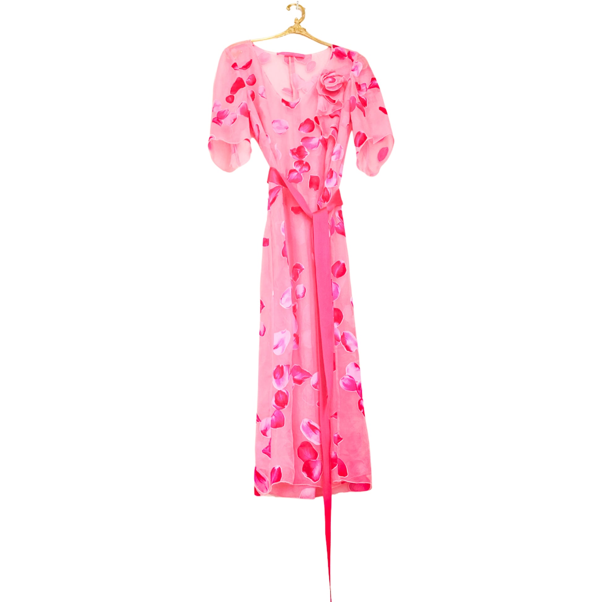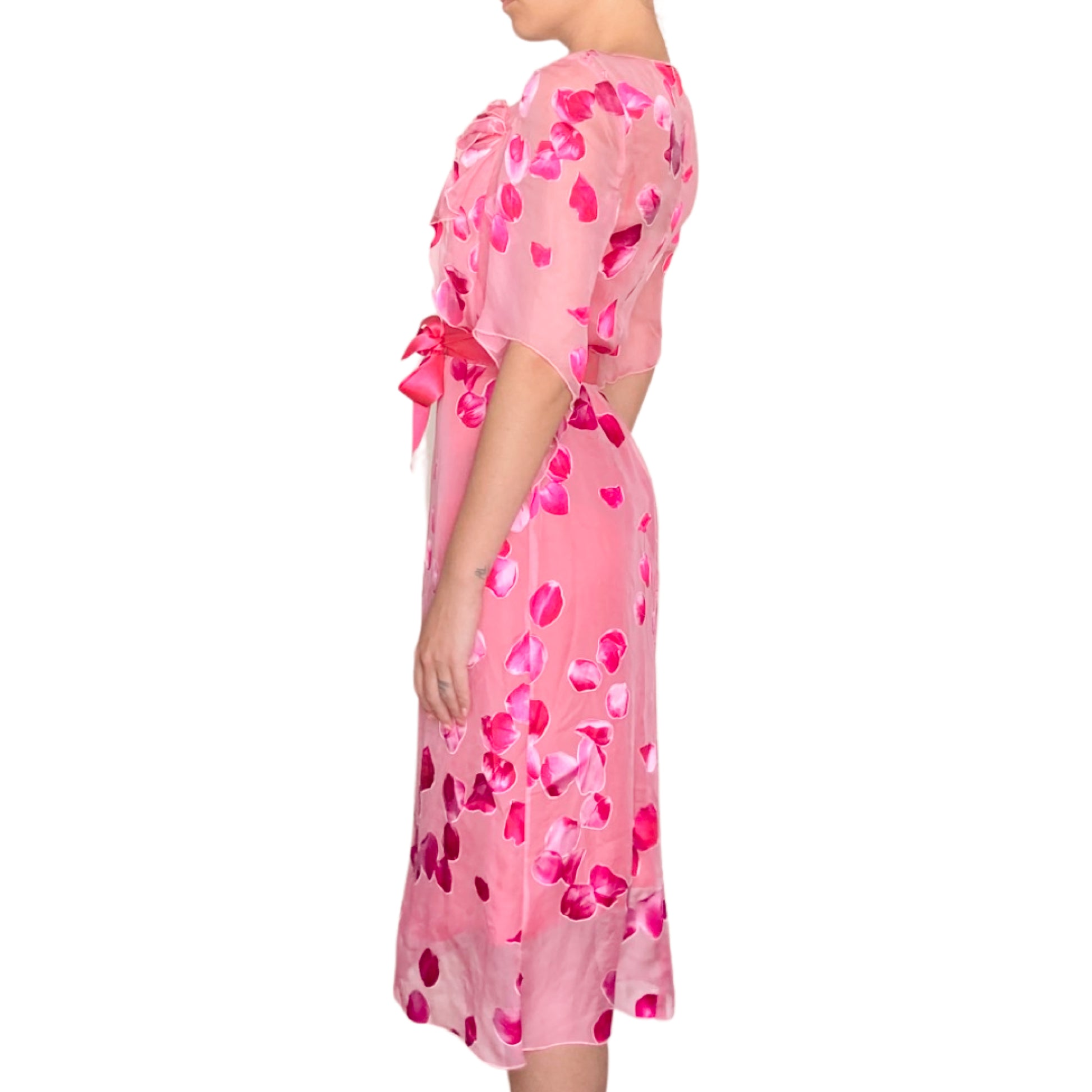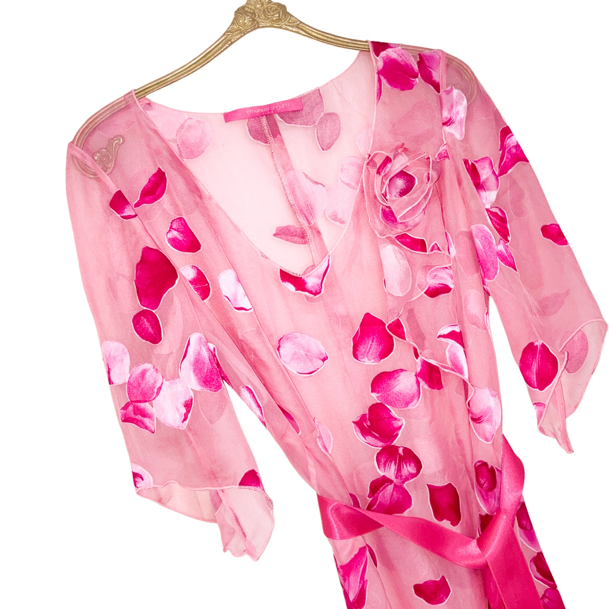 One of the most iconic print of the French Designer Emanuel Ungaro. It was worn by Britney Spears in 2001 when she was co hosting the American Music awards, also seen on the runway worn by Devon Aoki. This vintage sheer dress made with 100% silk, she has got some ruffles & realistic roses petals print. Zipper on the side. Lining dress non included. Transparent.