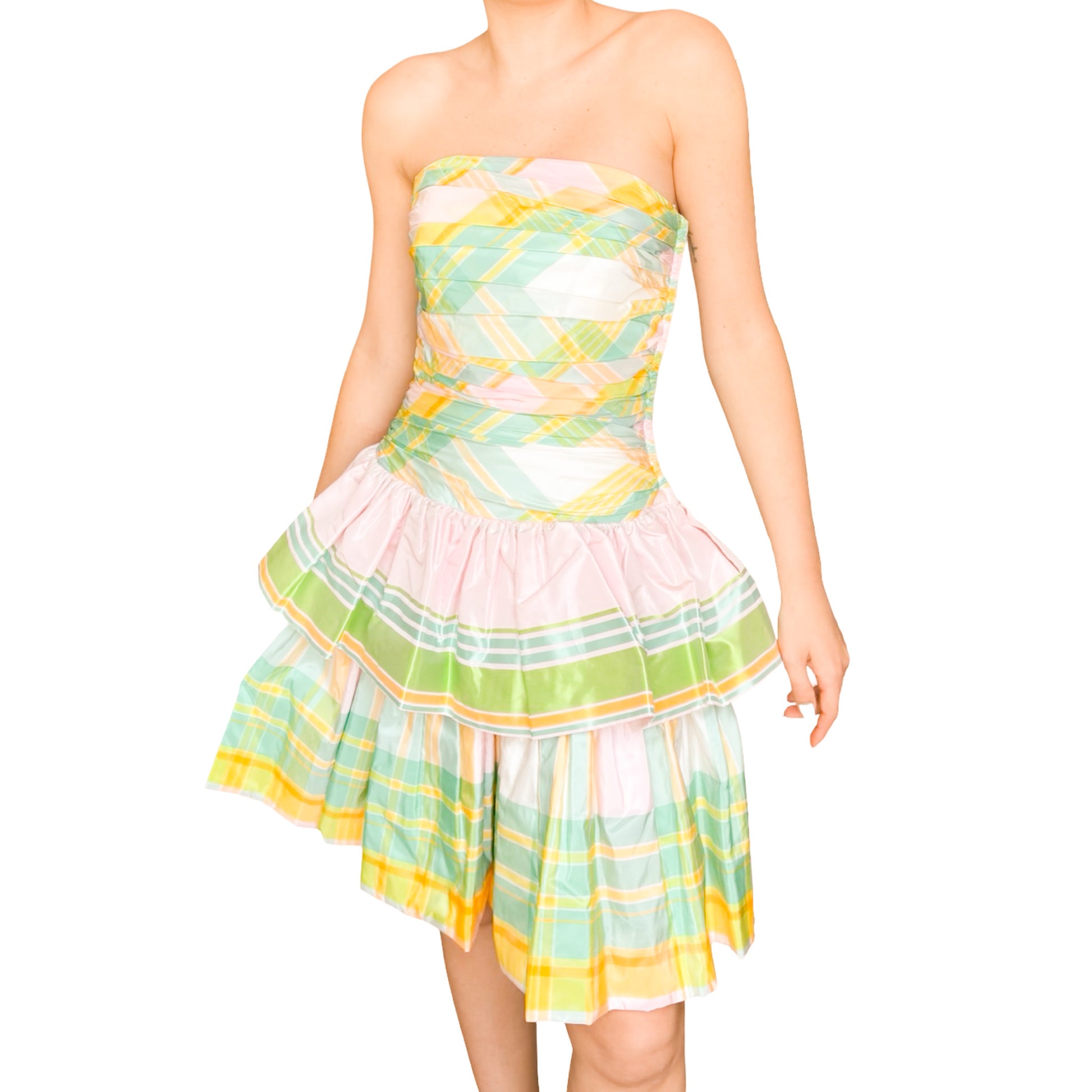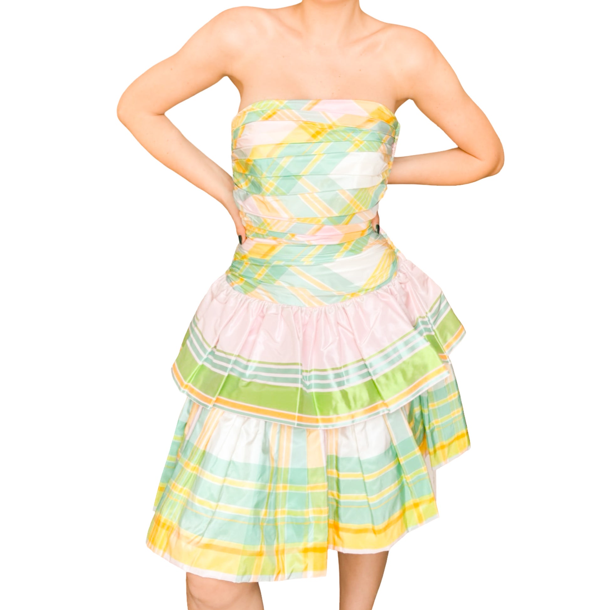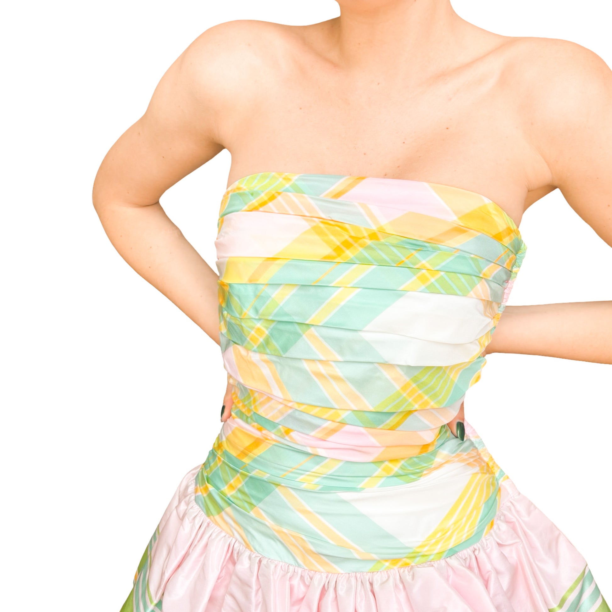 A spectacular archival piece from Escada Couture, featured in the 1993 campaign on supermodel Yasmeen Ghauri. Crafted in a subtly shimmering candy-colored madras (plaid, checked, tartan) fabric, this strapless dress is structured with inner boning for support and a cinched silhouette. The bodice is artfully draped and pleated, while the double-tiered skirt features adjustable puffed ruffles for a playful, tutu-inspired volume. Fully lined with couture finishing. Flattering, feminine, and extremely rare. Two sizes available.