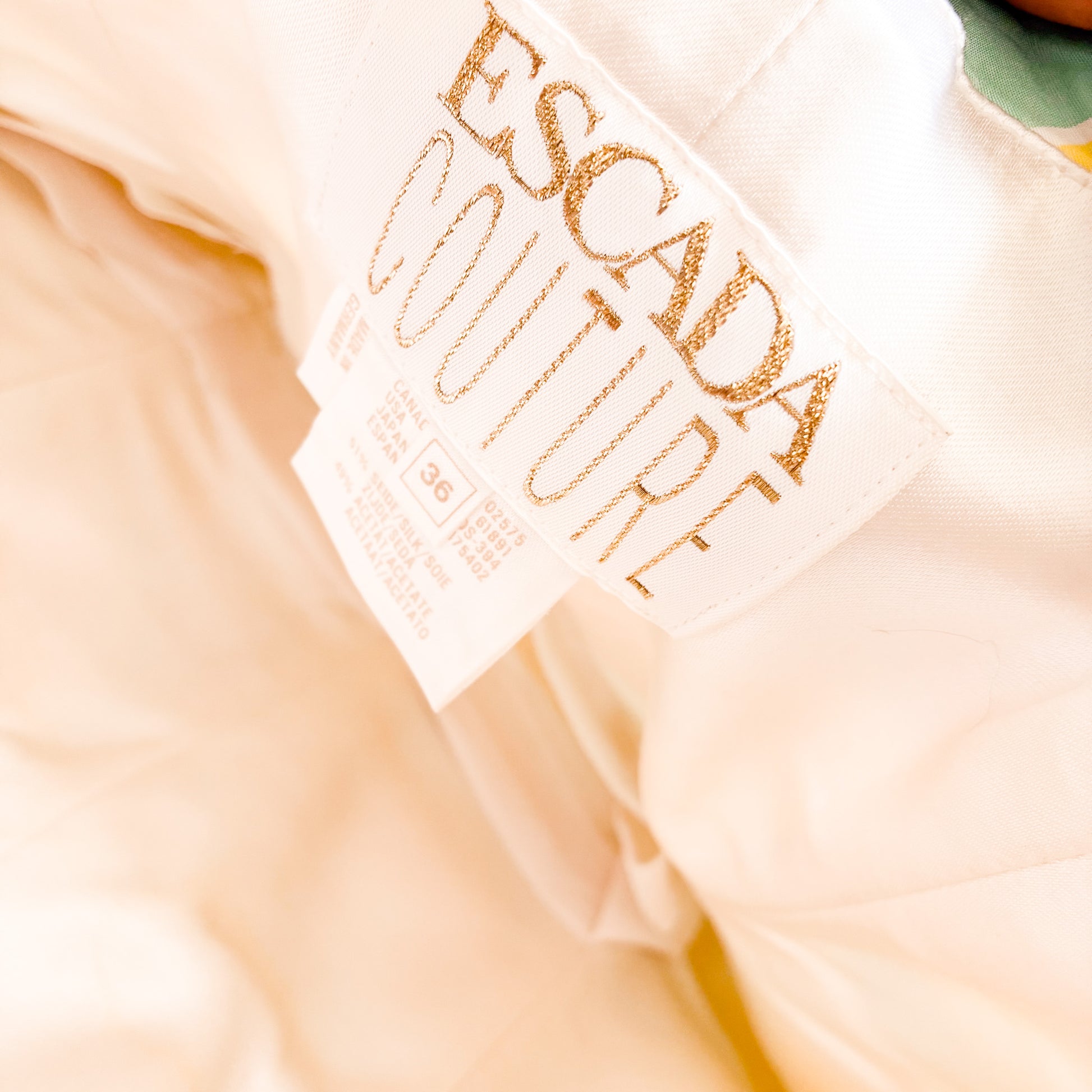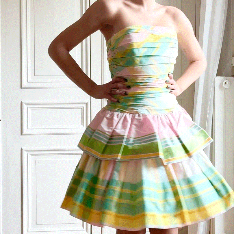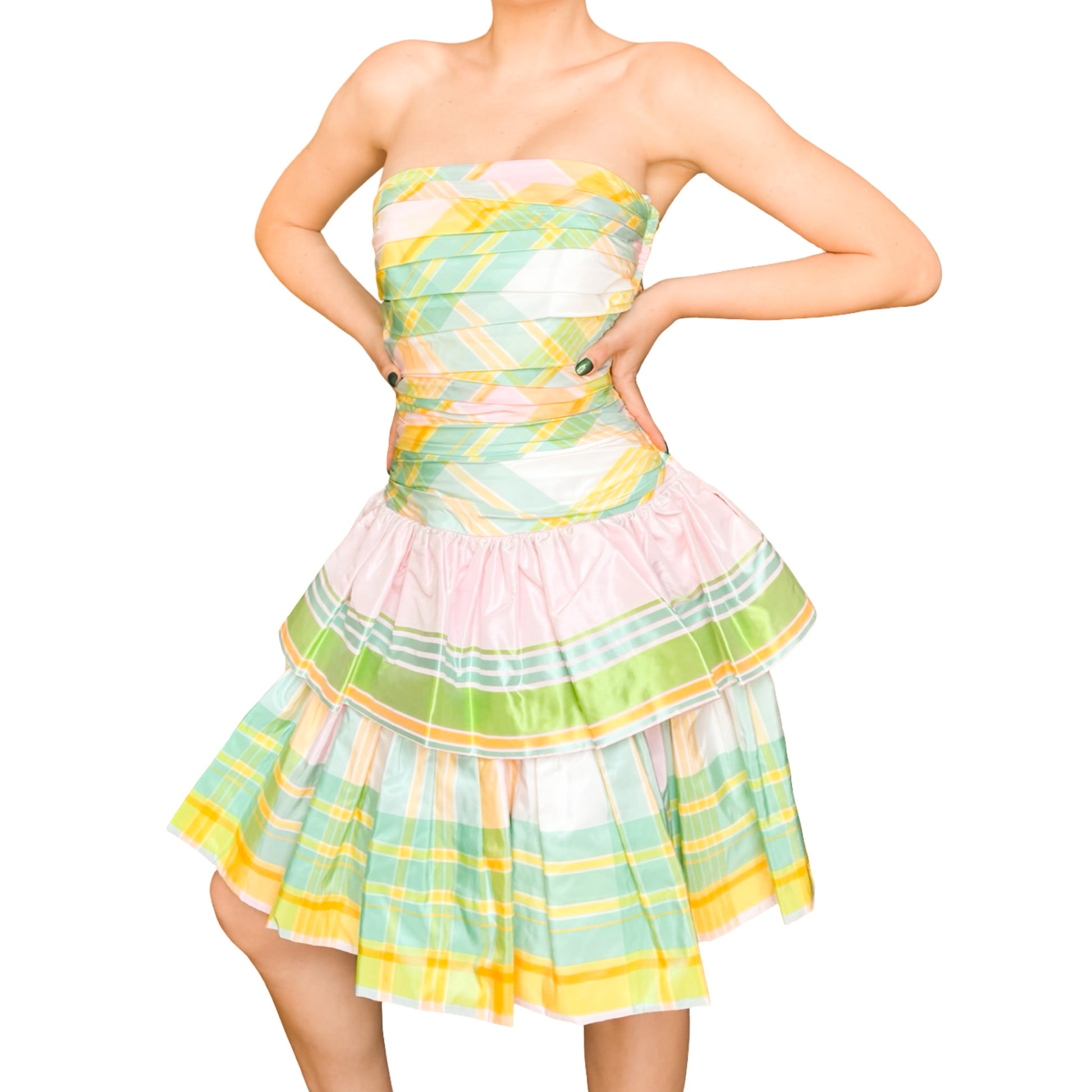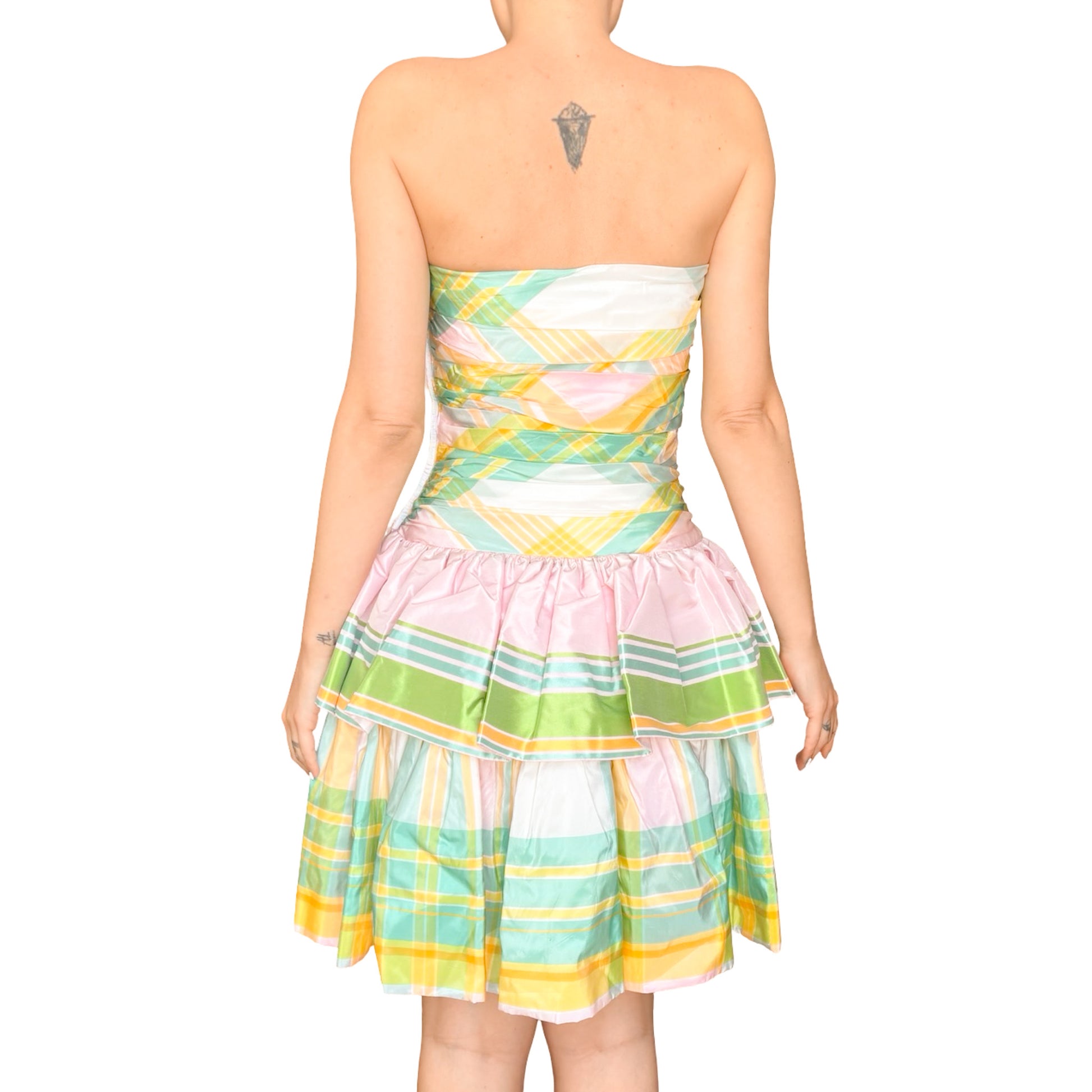 A spectacular archival piece from Escada Couture, featured in the 1993 campaign on supermodel Yasmeen Ghauri. Crafted in a subtly shimmering candy-colored madras (plaid, checked, tartan) fabric, this strapless dress is structured with inner boning for support and a cinched silhouette. The bodice is artfully draped and pleated, while the double-tiered skirt features adjustable puffed ruffles for a playful, tutu-inspired volume. Fully lined with couture finishing. Flattering, feminine, and extremely rare. Two sizes available.