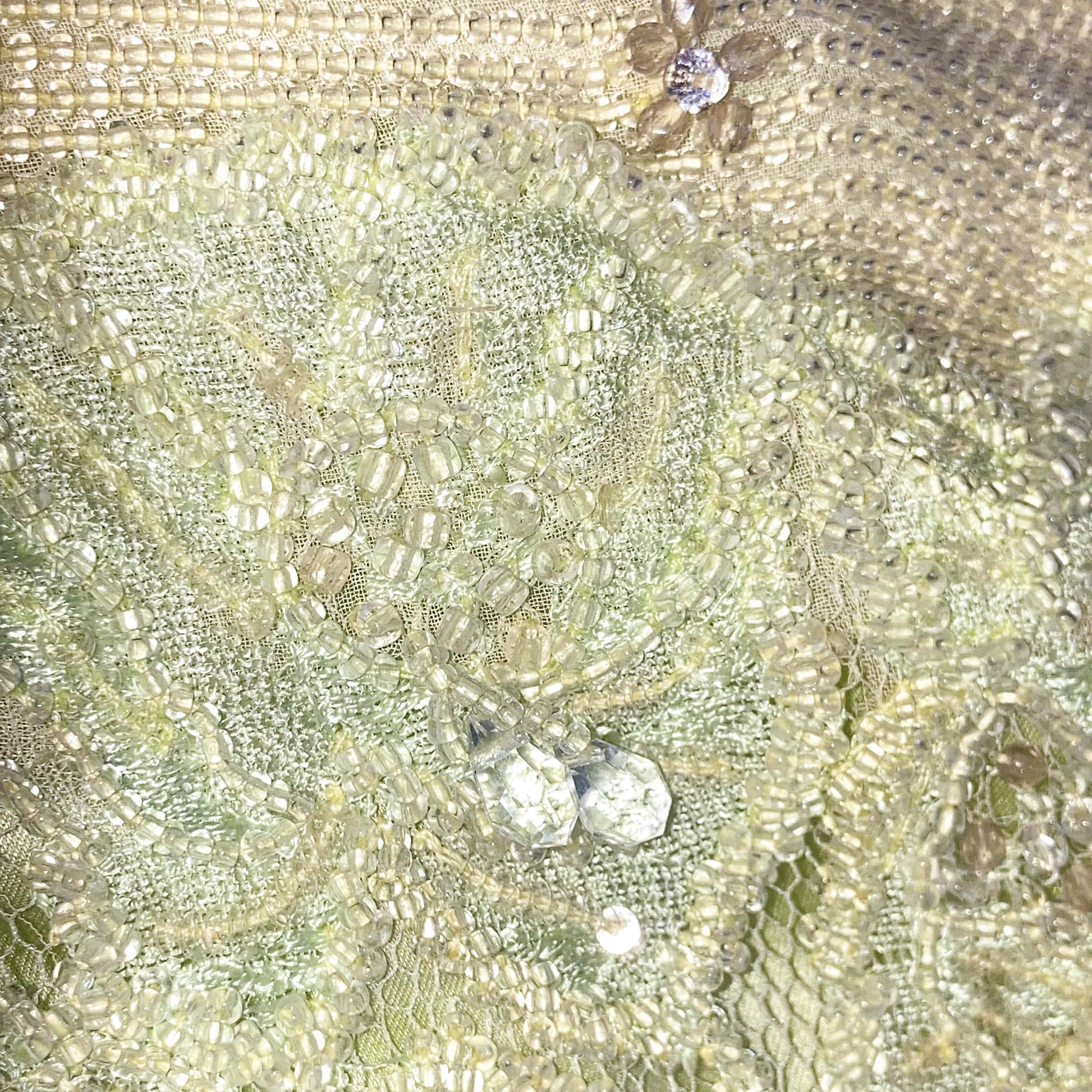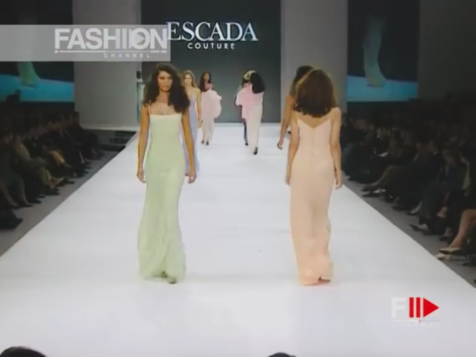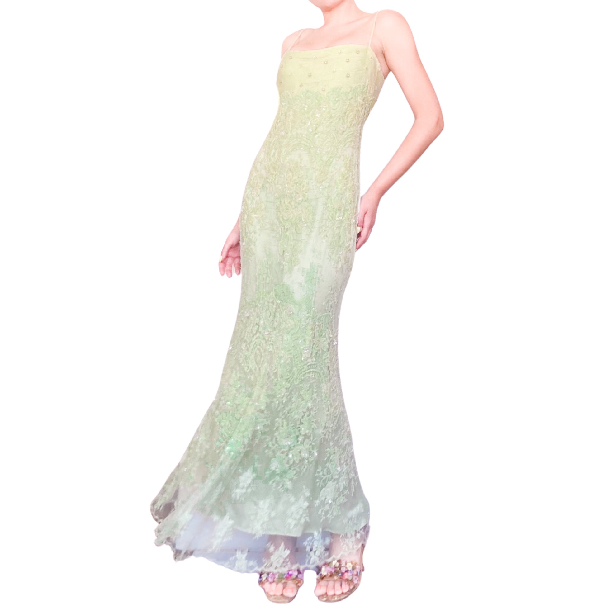 A dazzling show-stopper, the Escada Couture gown seen on the Spring Summer 2000 show features exquisite, high-quality silk adorned with crystal and glass beadwork for a truly luxurious statement. It's clearly all hand-made. Its mermaid cut is highlighted by a squared neckline and ornate lace detailing, making it perfect for any formal or celebratory occasion. One of the rarest gown ever.