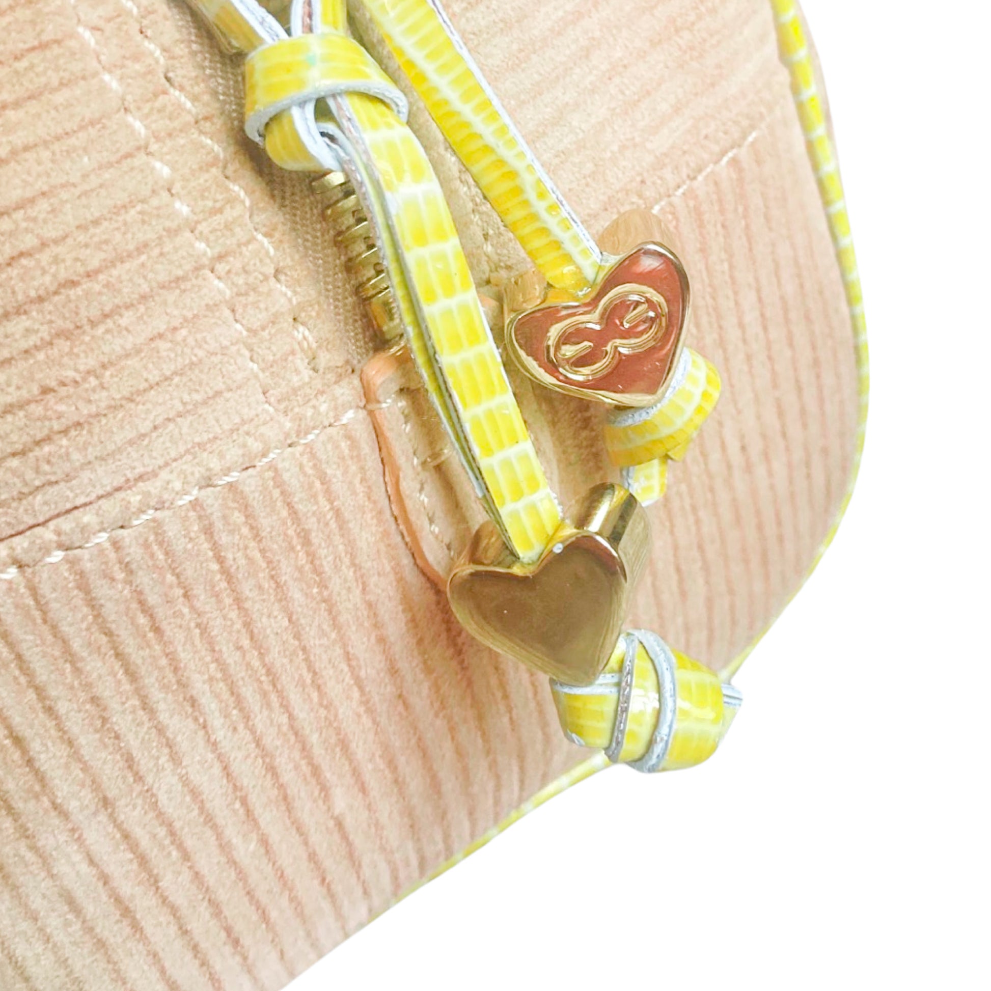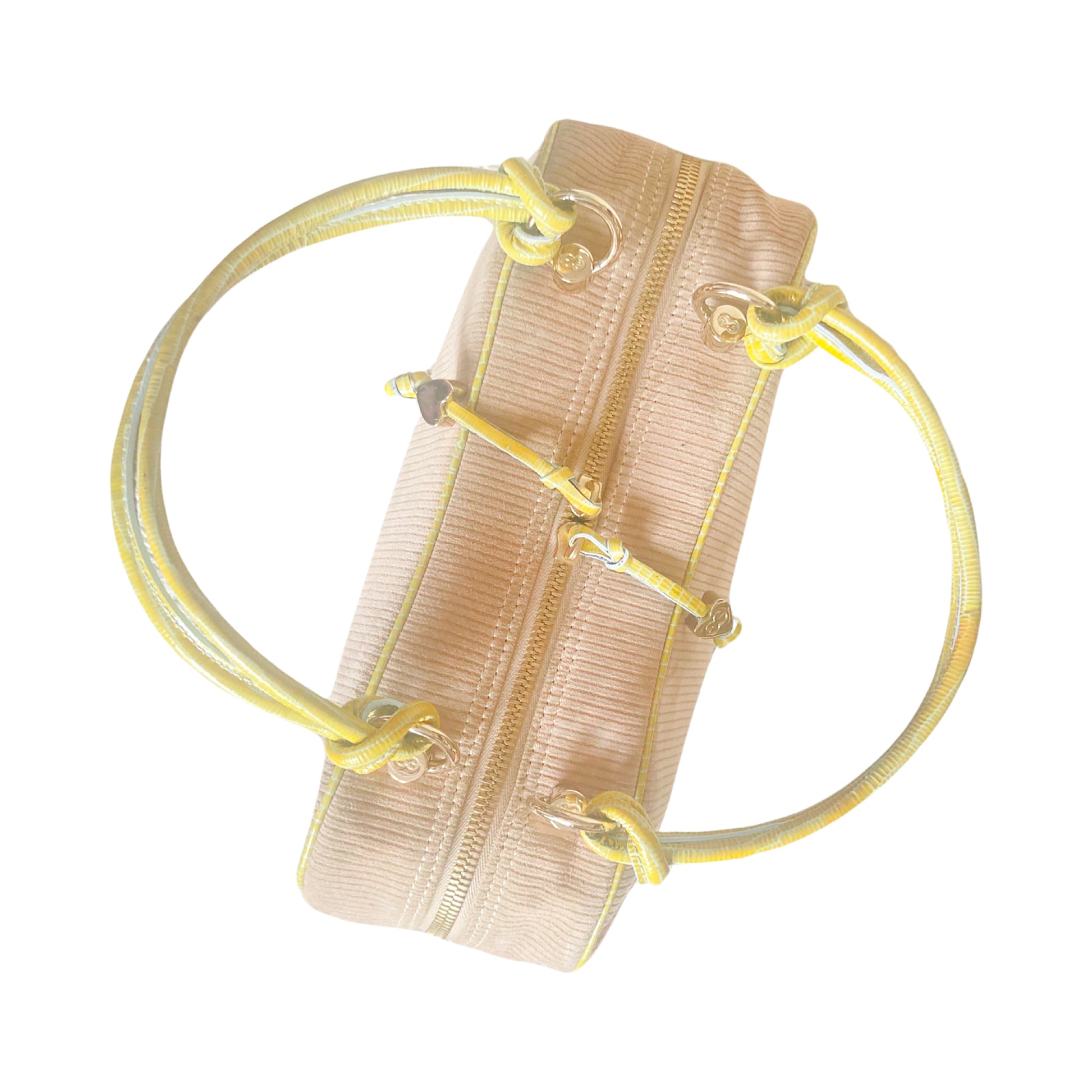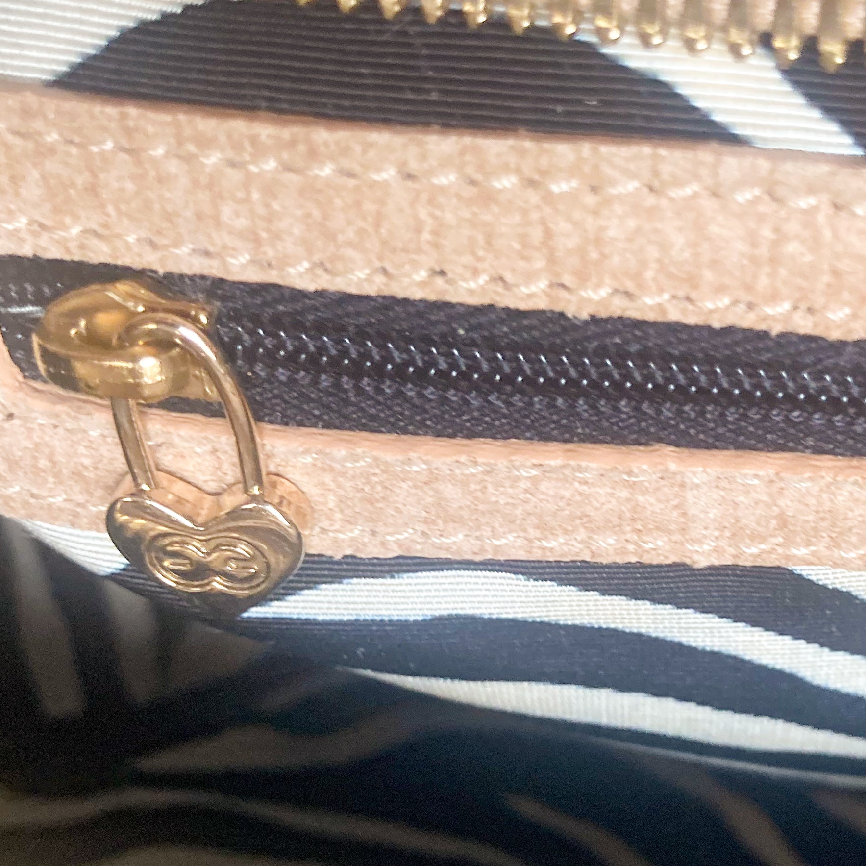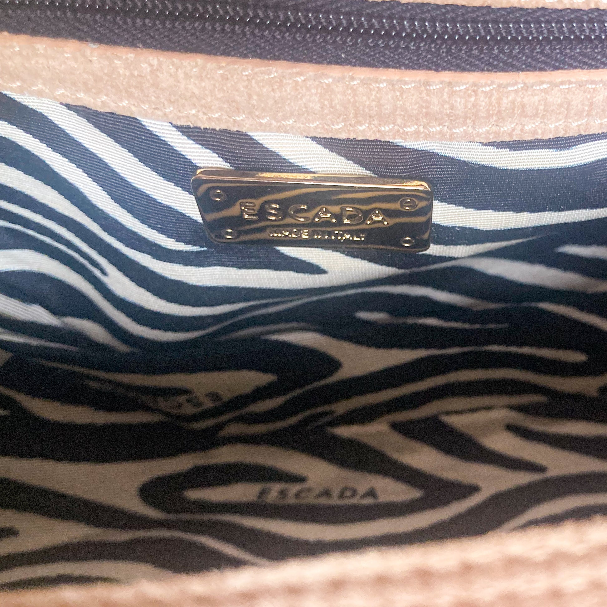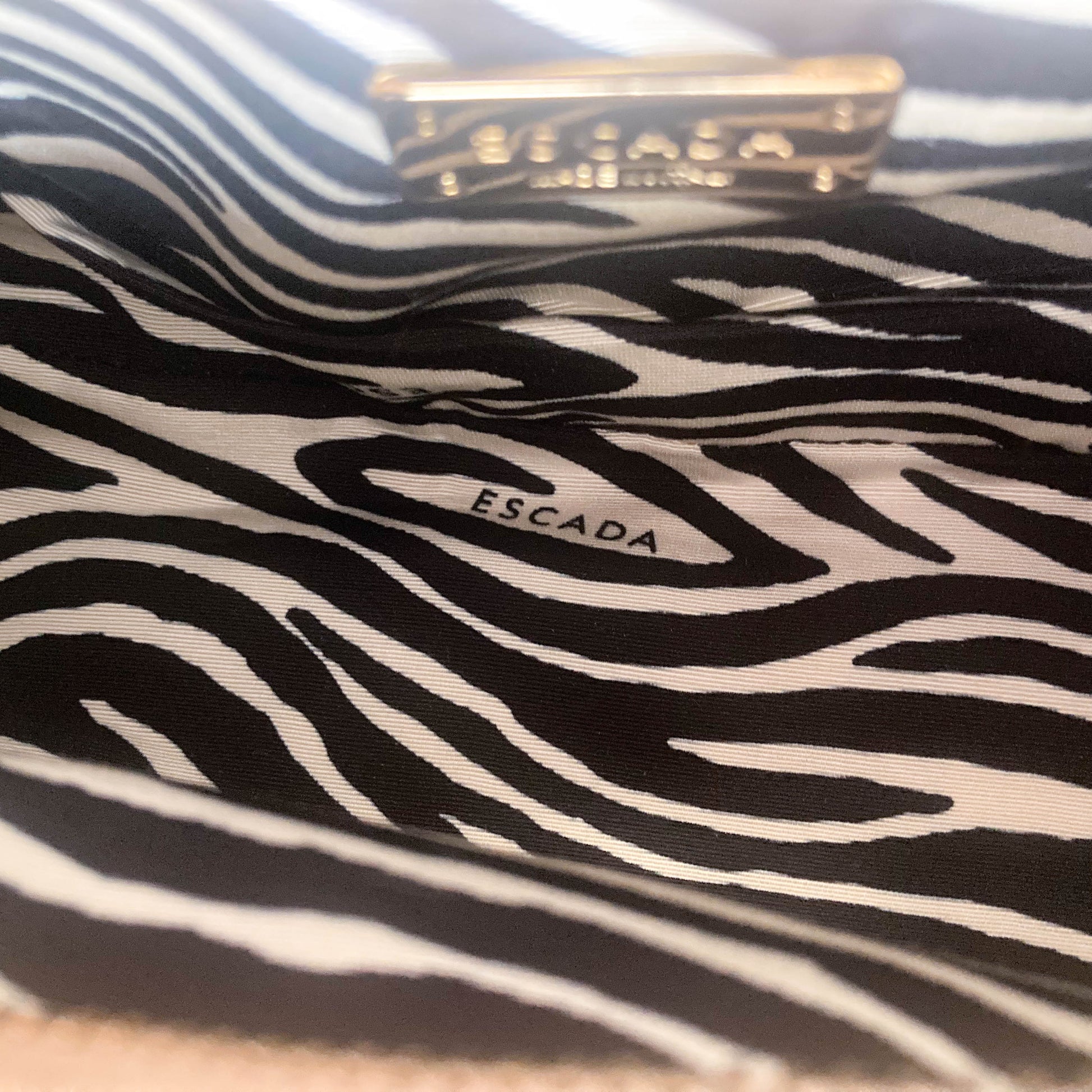 Stay stylish while carrying the Escada Spring Summer (seen on the official ad campaign) 2003 Bag. This corduroy baguette handbag features double leather handles, heart-shaped metal hardware and signature brand logo engravings. Lined with a zebra print, the interior includes a zip pocket for extra storage. Escada Dust bag included.
