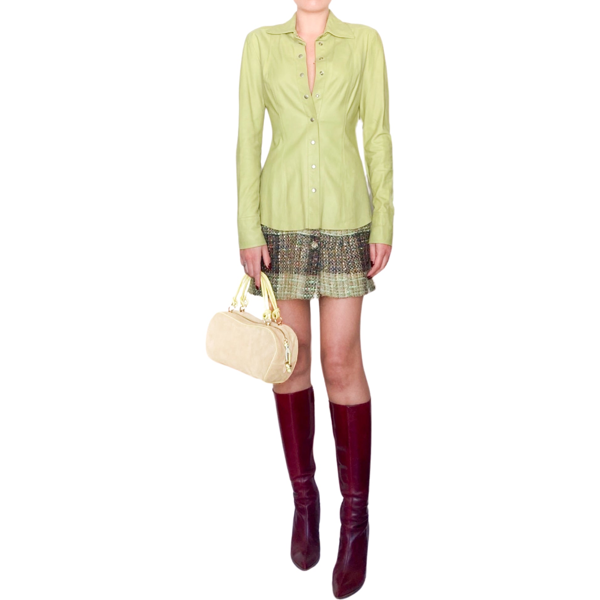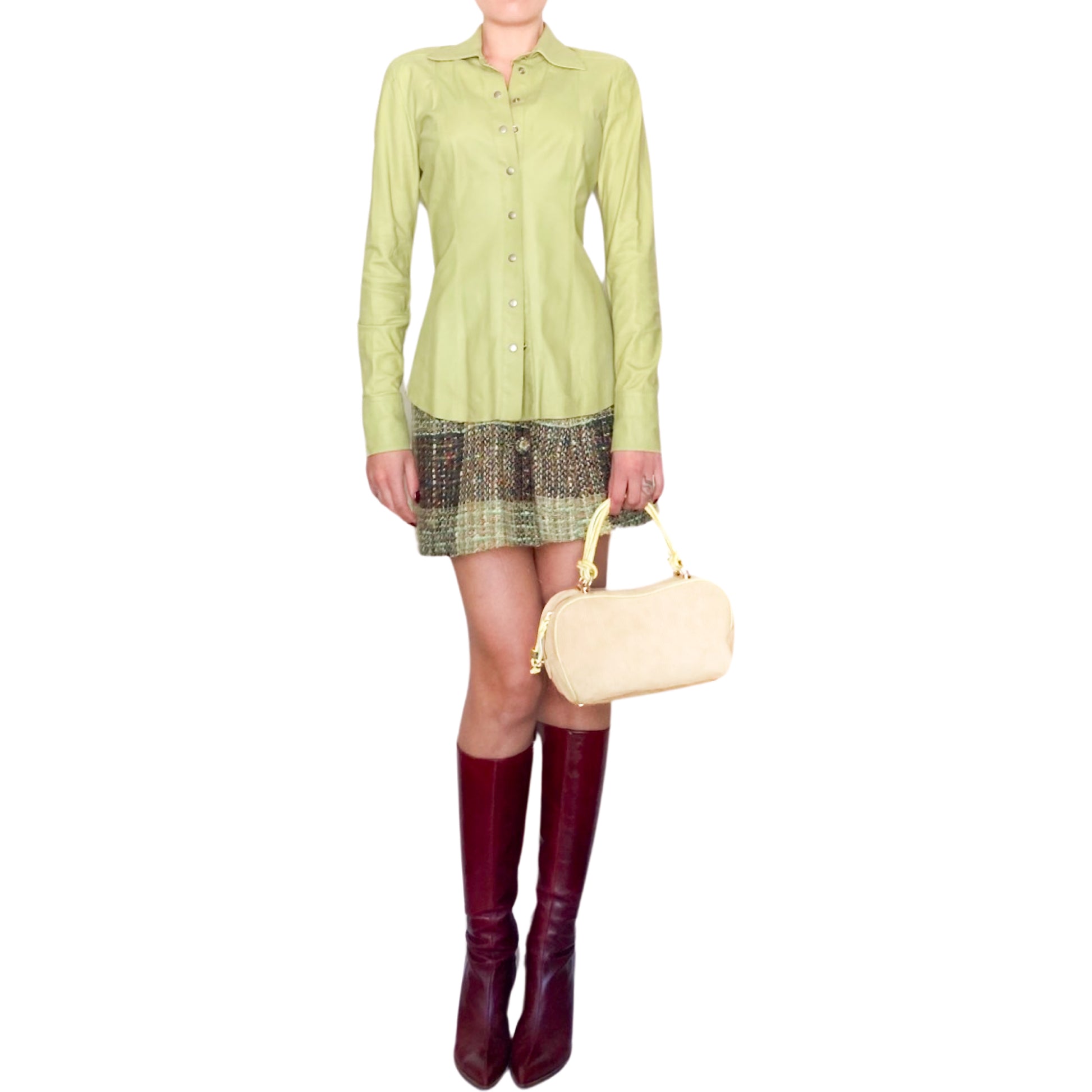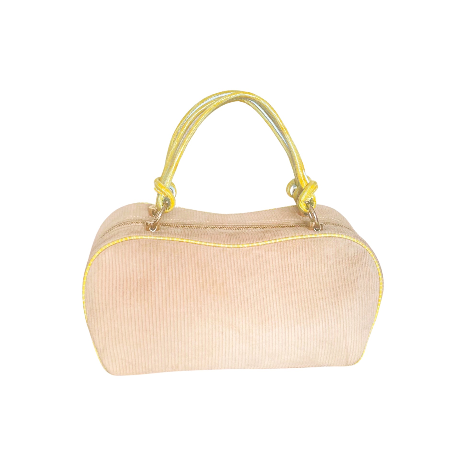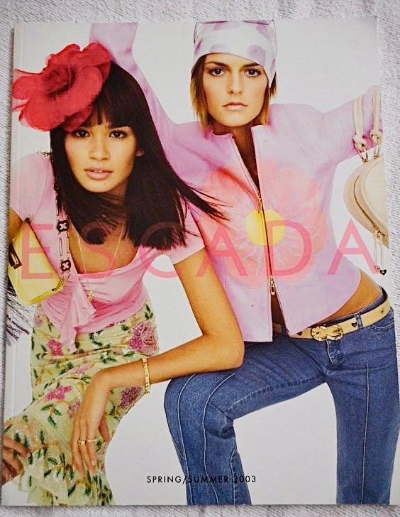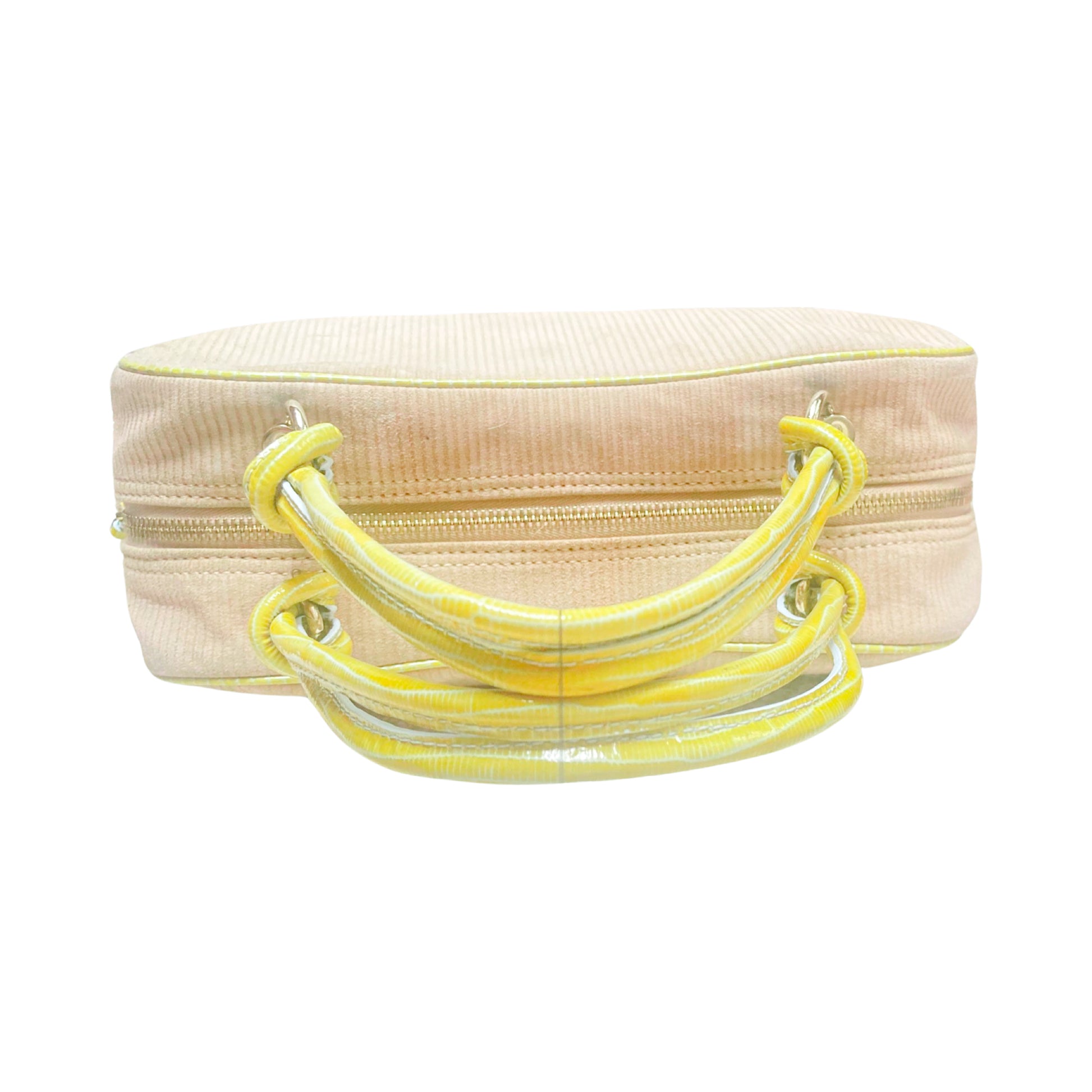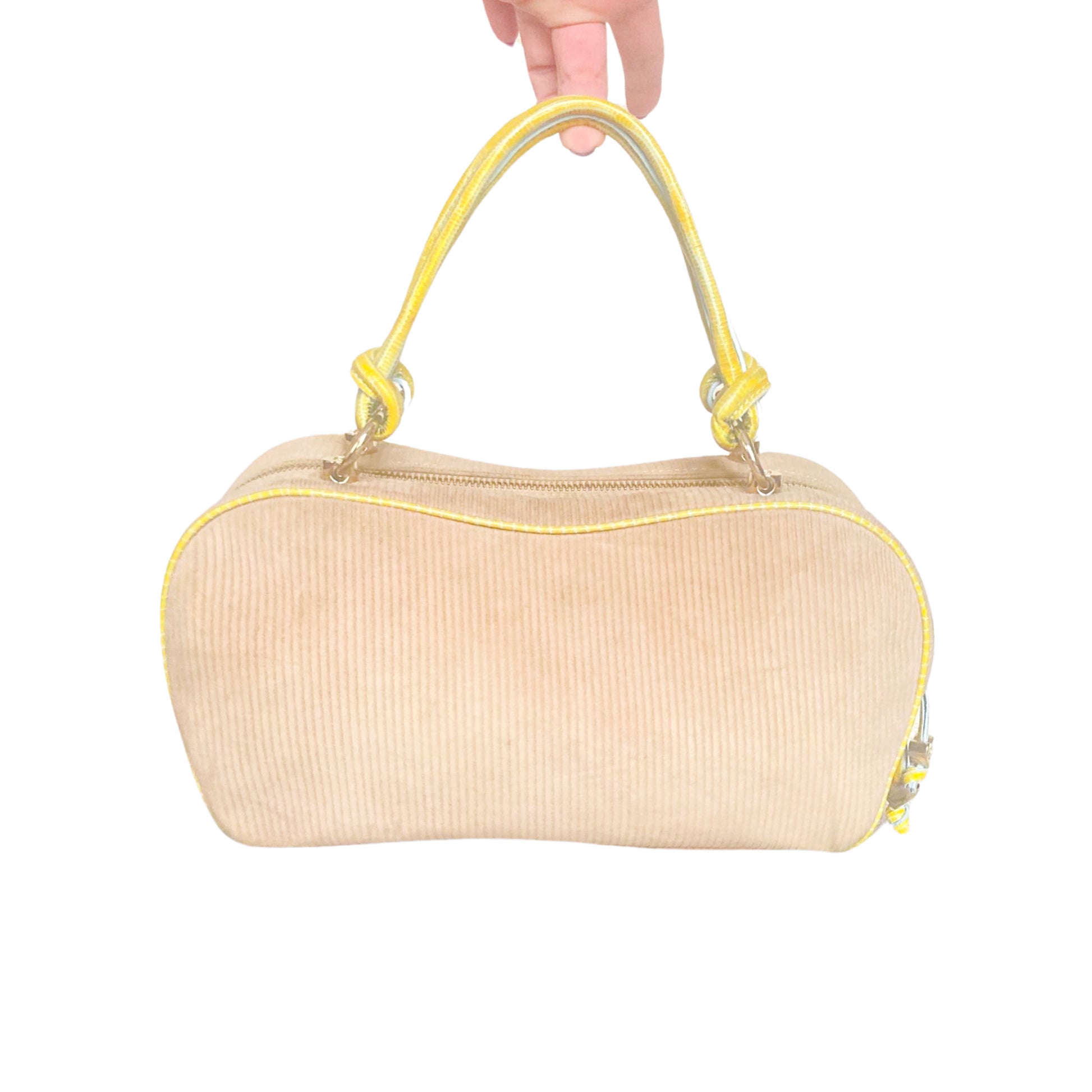 Stay stylish while carrying the Escada Spring Summer (seen on the official ad campaign) 2003 Bag. This corduroy baguette handbag features double leather handles, heart-shaped metal hardware and signature brand logo engravings. Lined with a zebra print, the interior includes a zip pocket for extra storage. Escada Dust bag included.