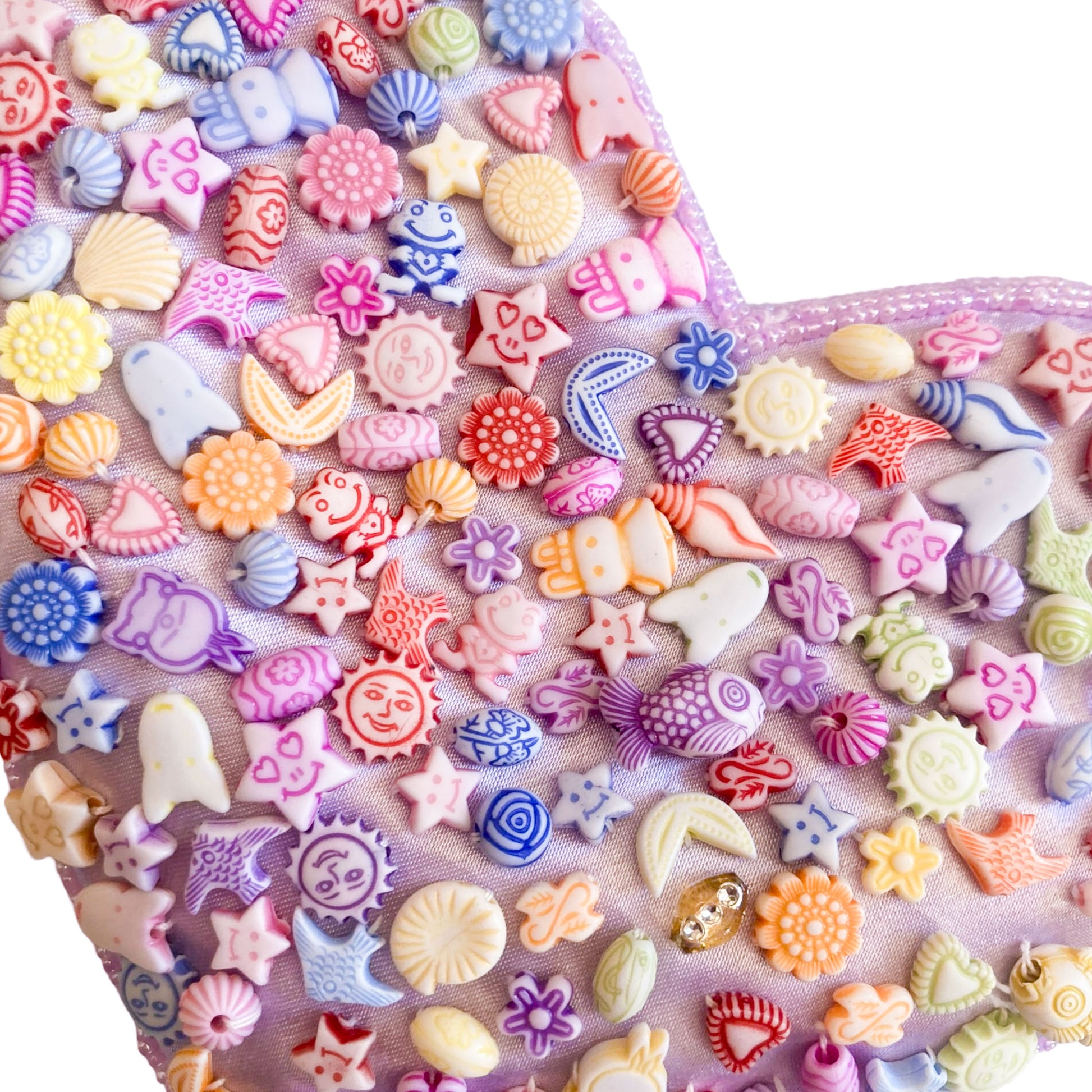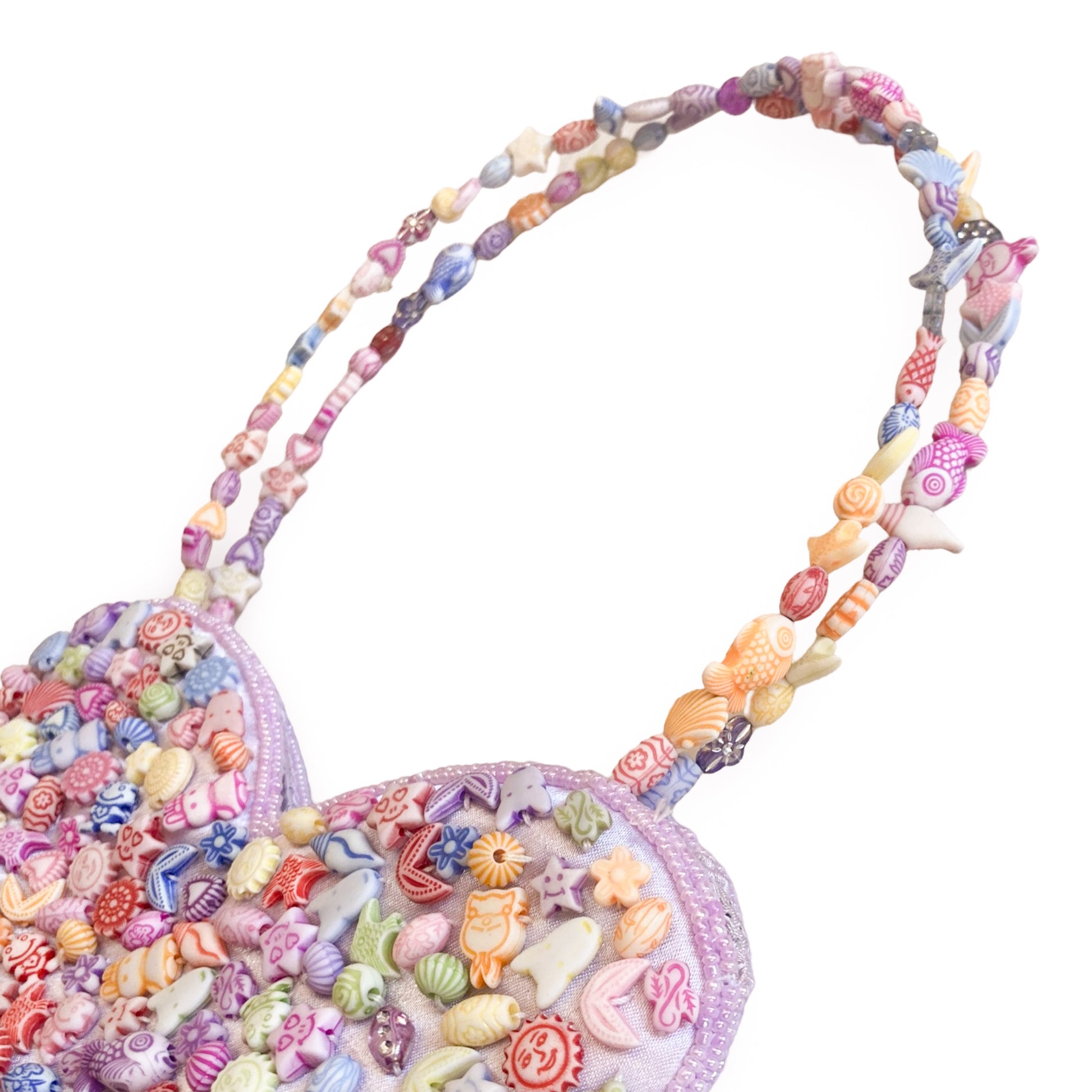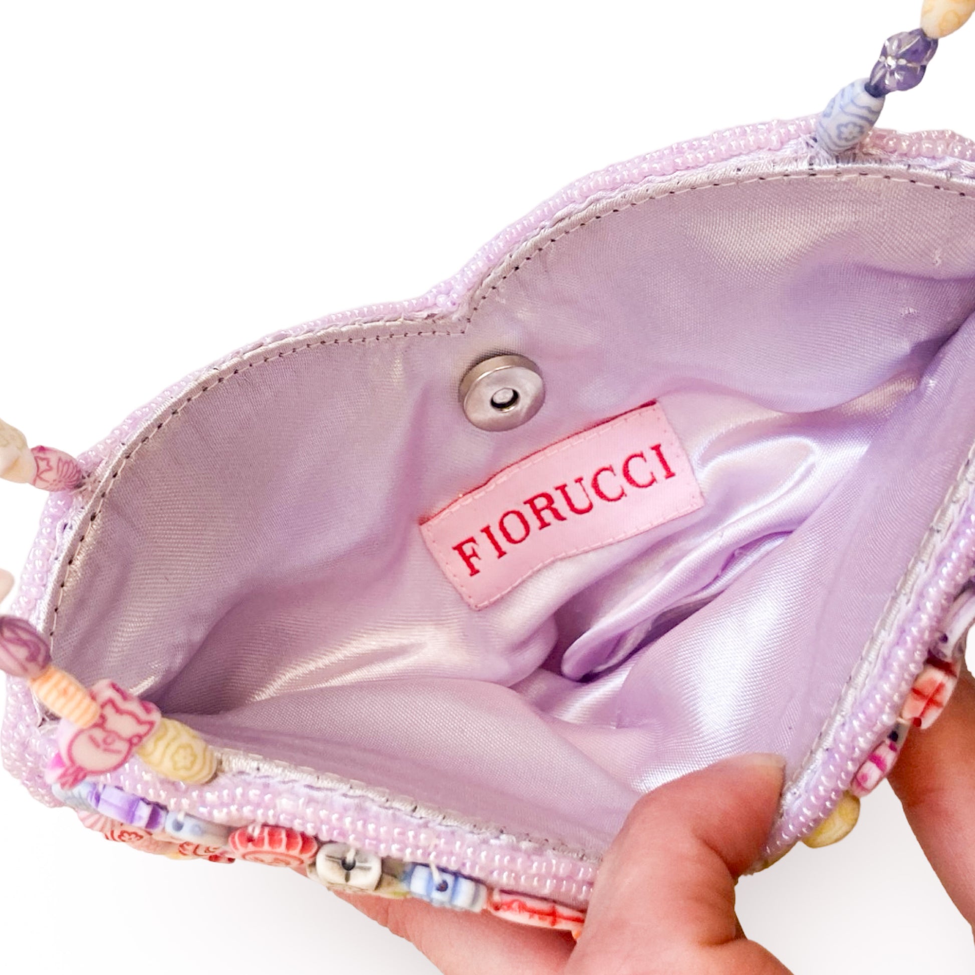 Vintage & ultra rare 90s/2000s Fiorucci mini heart bag, ultimate kidcore dream. Featuring a pastel explosion of whimsical beads, from tiny stars to playful shells or animals, this bag is a statement piece that screams fun. The back is beads_embroidered with the brand's signature. Lightweight and the perfect size for your essentials (my iPhone SE is fitting) , it’s giving early 2000s pop star vibes. Impossible to resist.