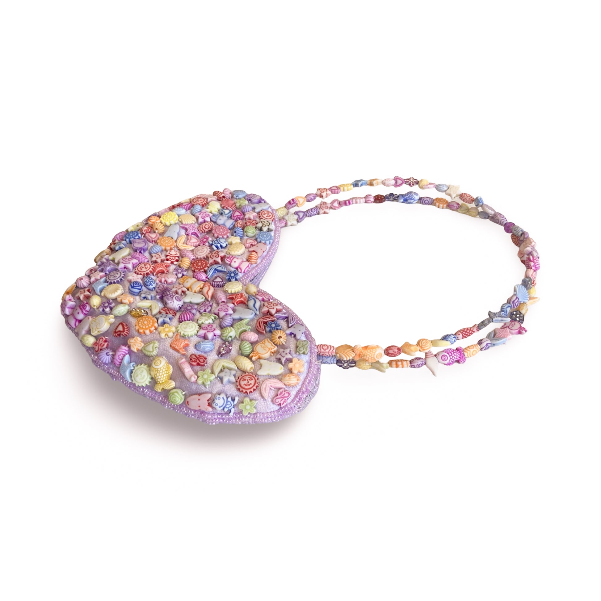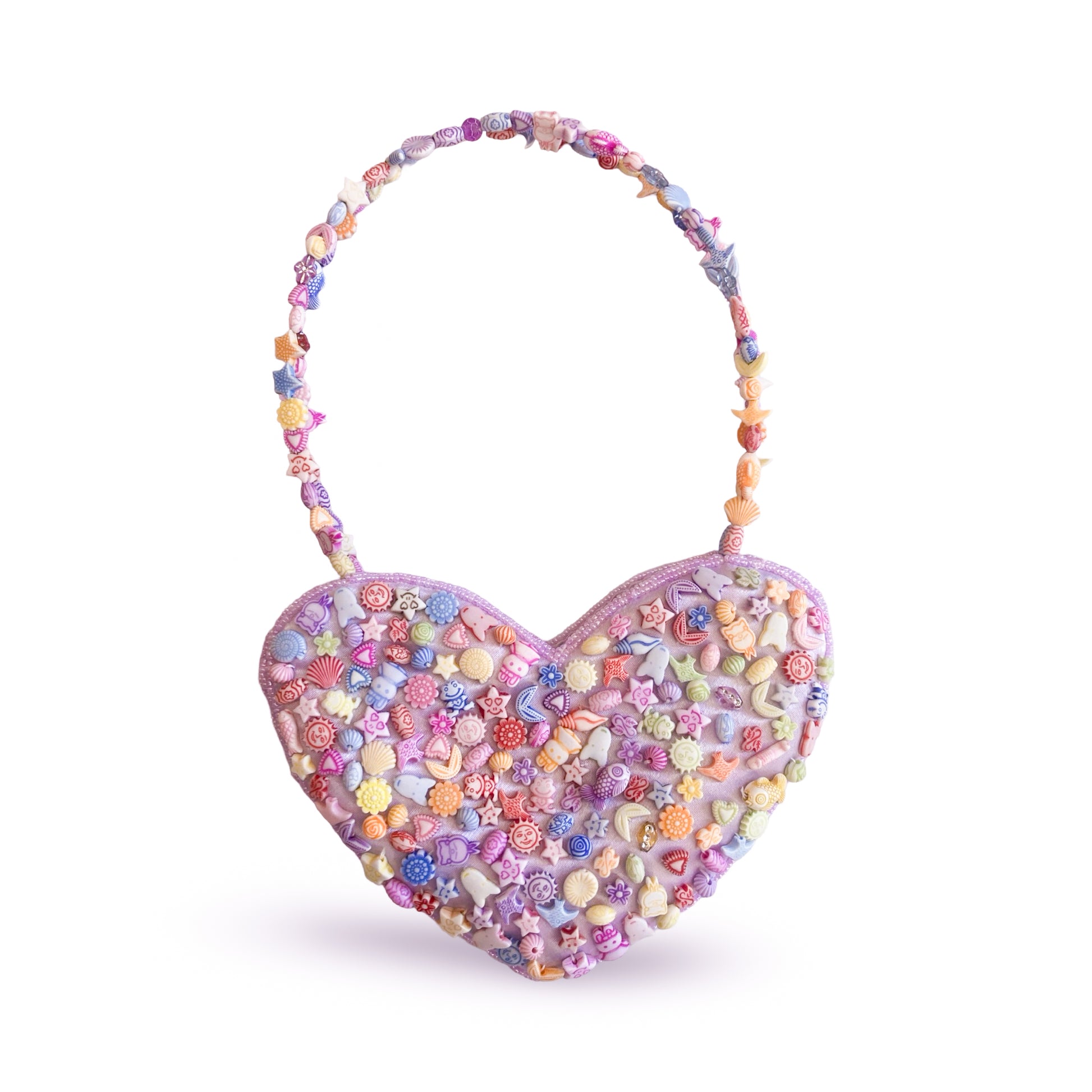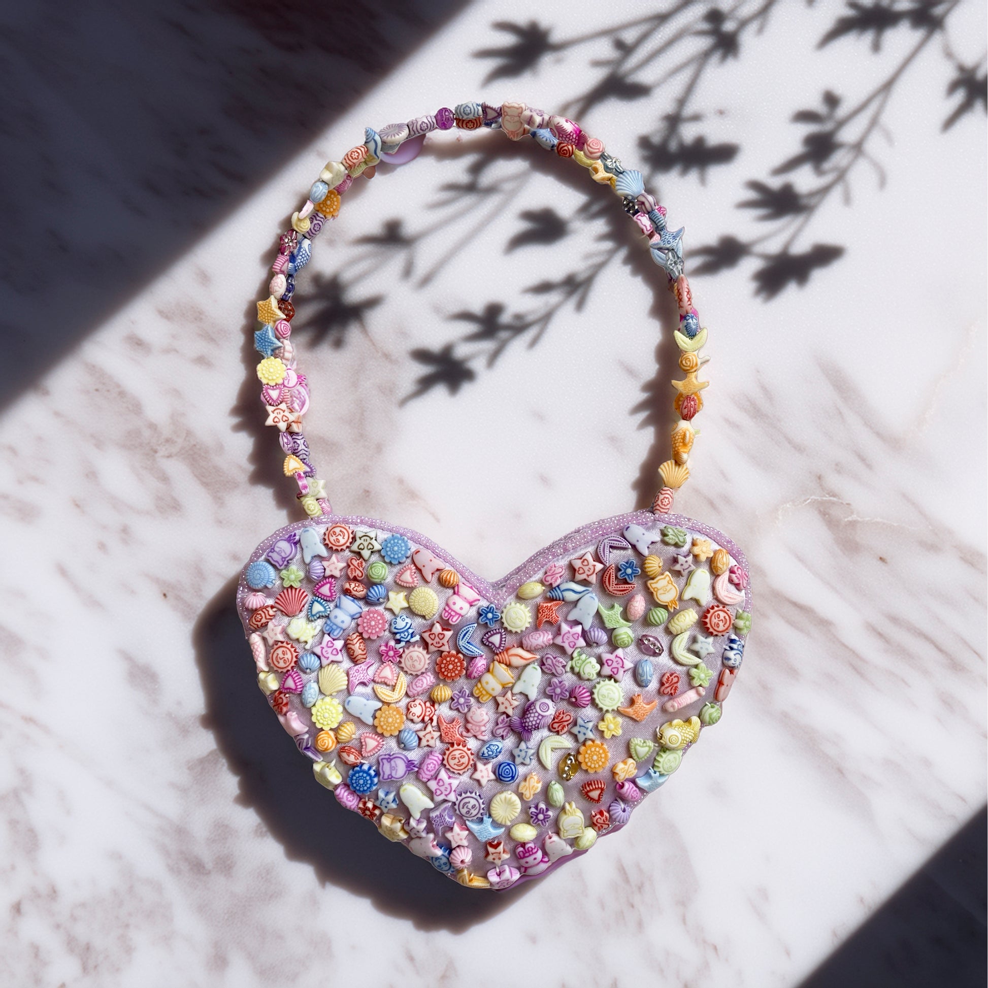 Vintage & ultra rare 90s/2000s Fiorucci mini heart bag, ultimate kidcore dream. Featuring a pastel explosion of whimsical beads, from tiny stars to playful shells or animals, this bag is a statement piece that screams fun. The back is beads_embroidered with the brand's signature. Lightweight and the perfect size for your essentials (my iPhone SE is fitting) , it’s giving early 2000s pop star vibes. Impossible to resist.