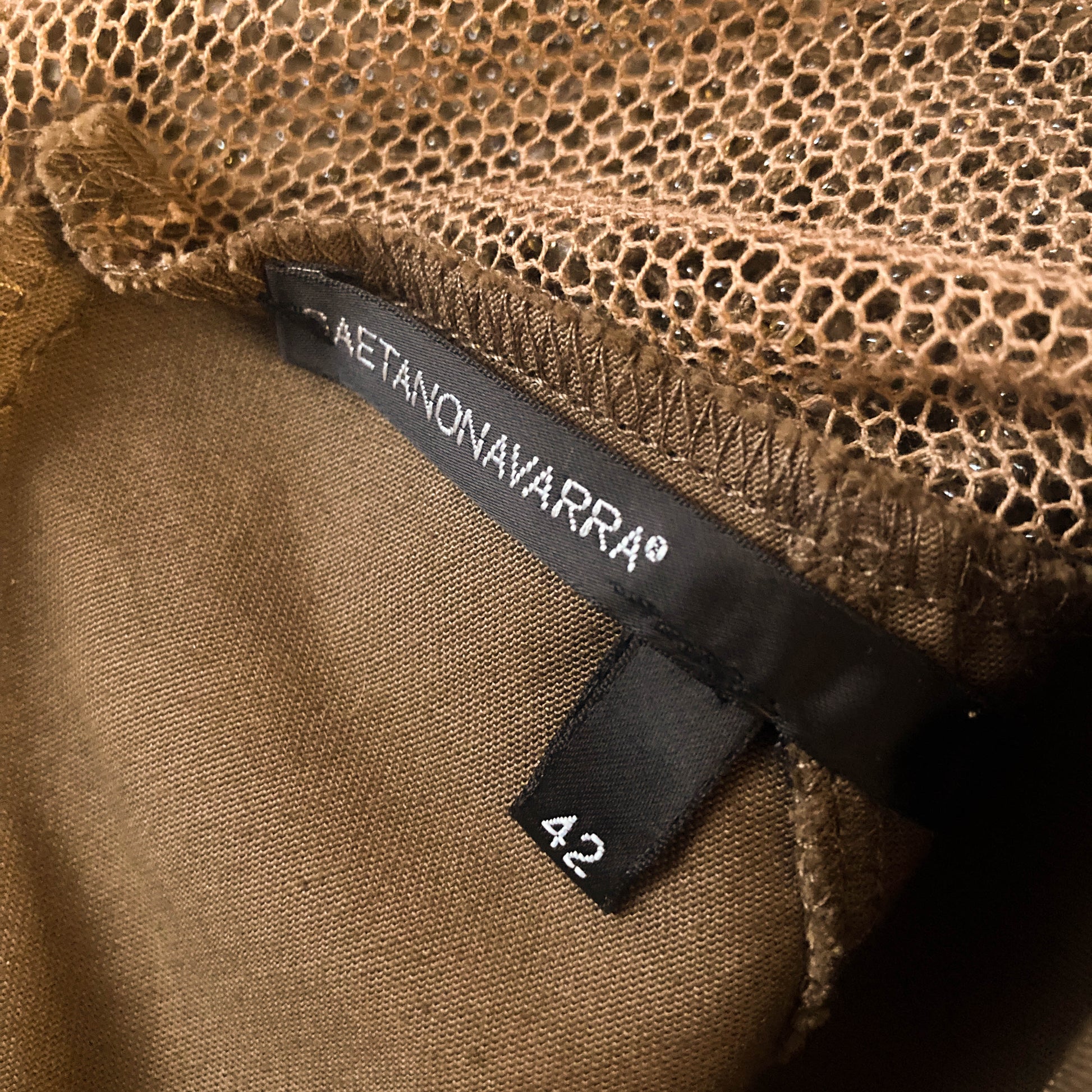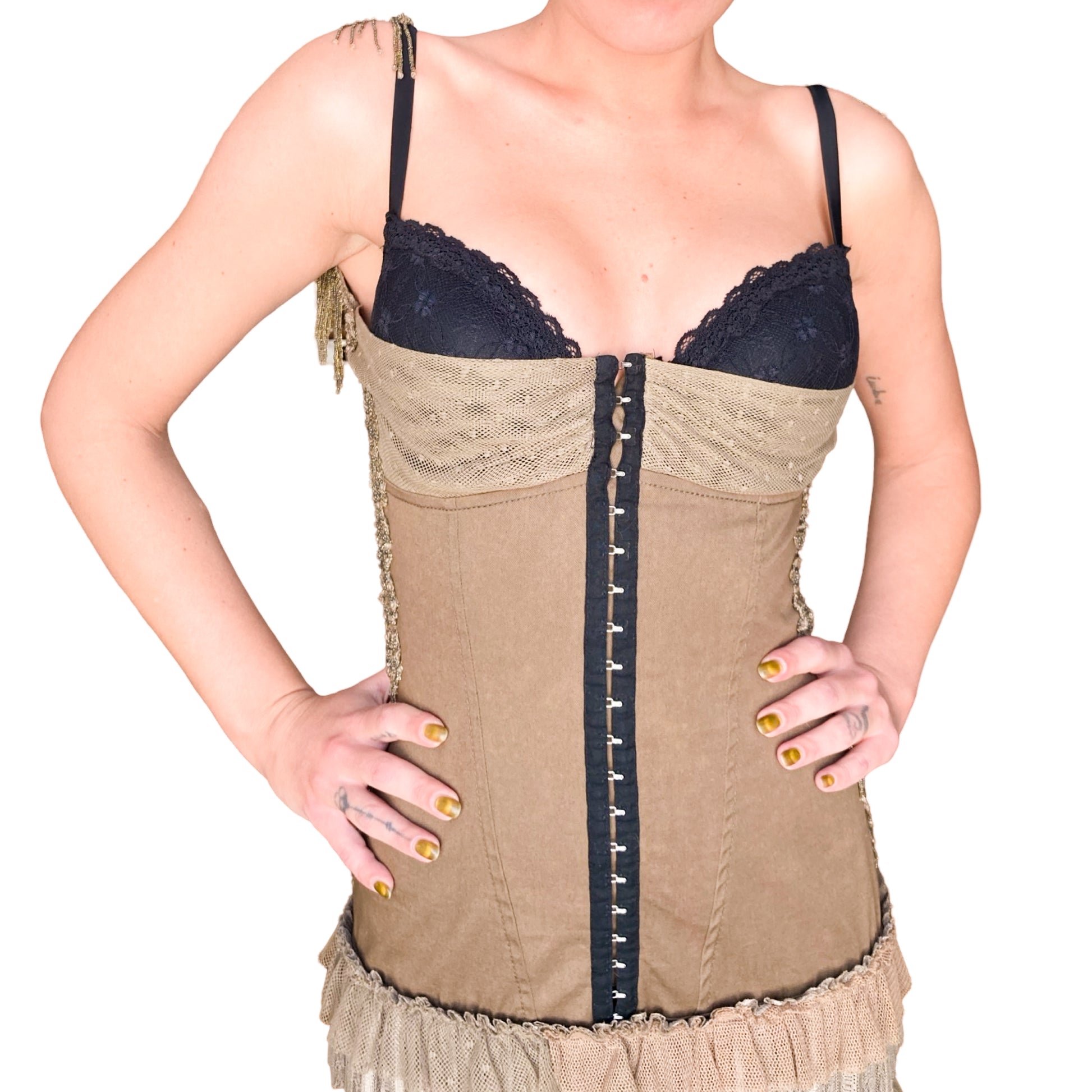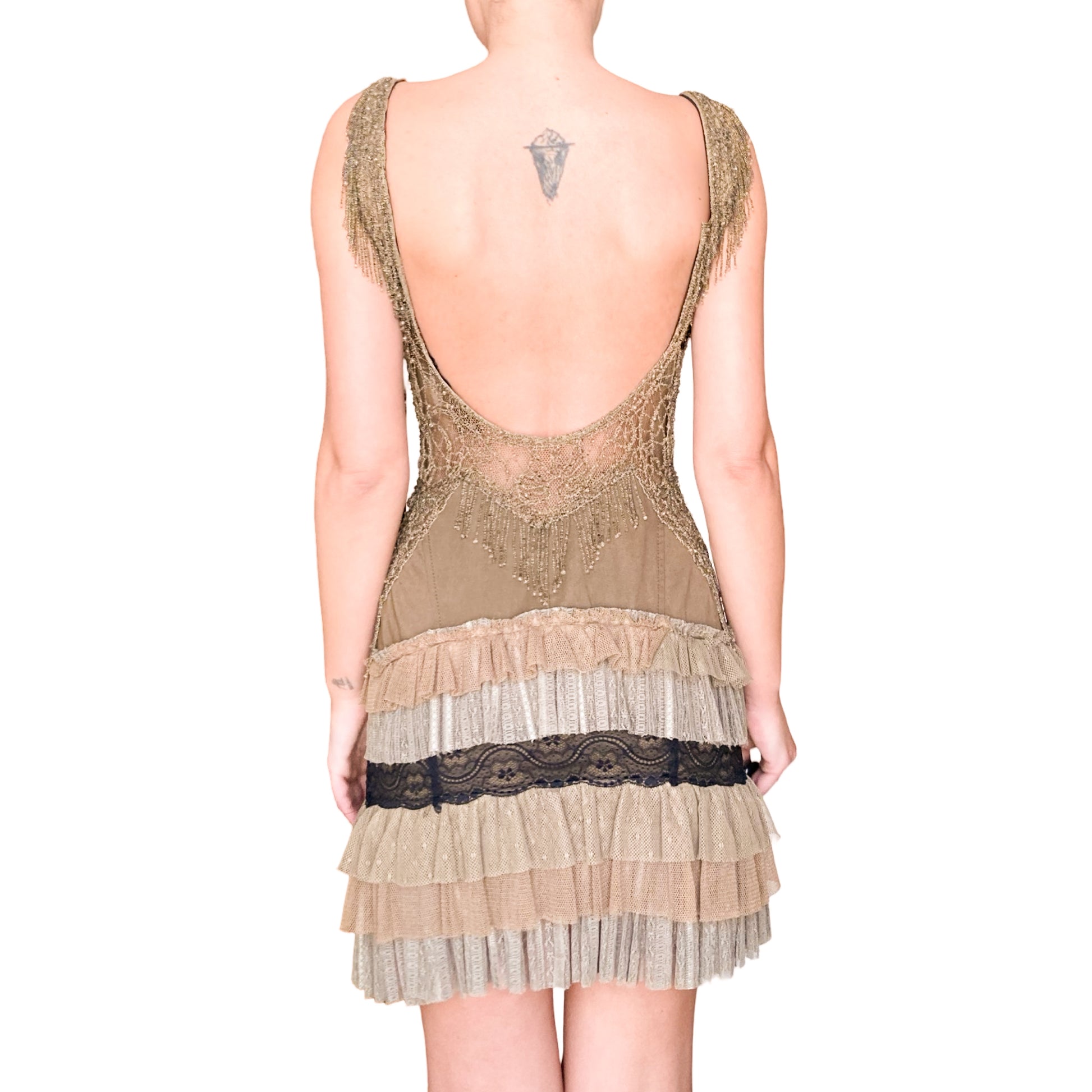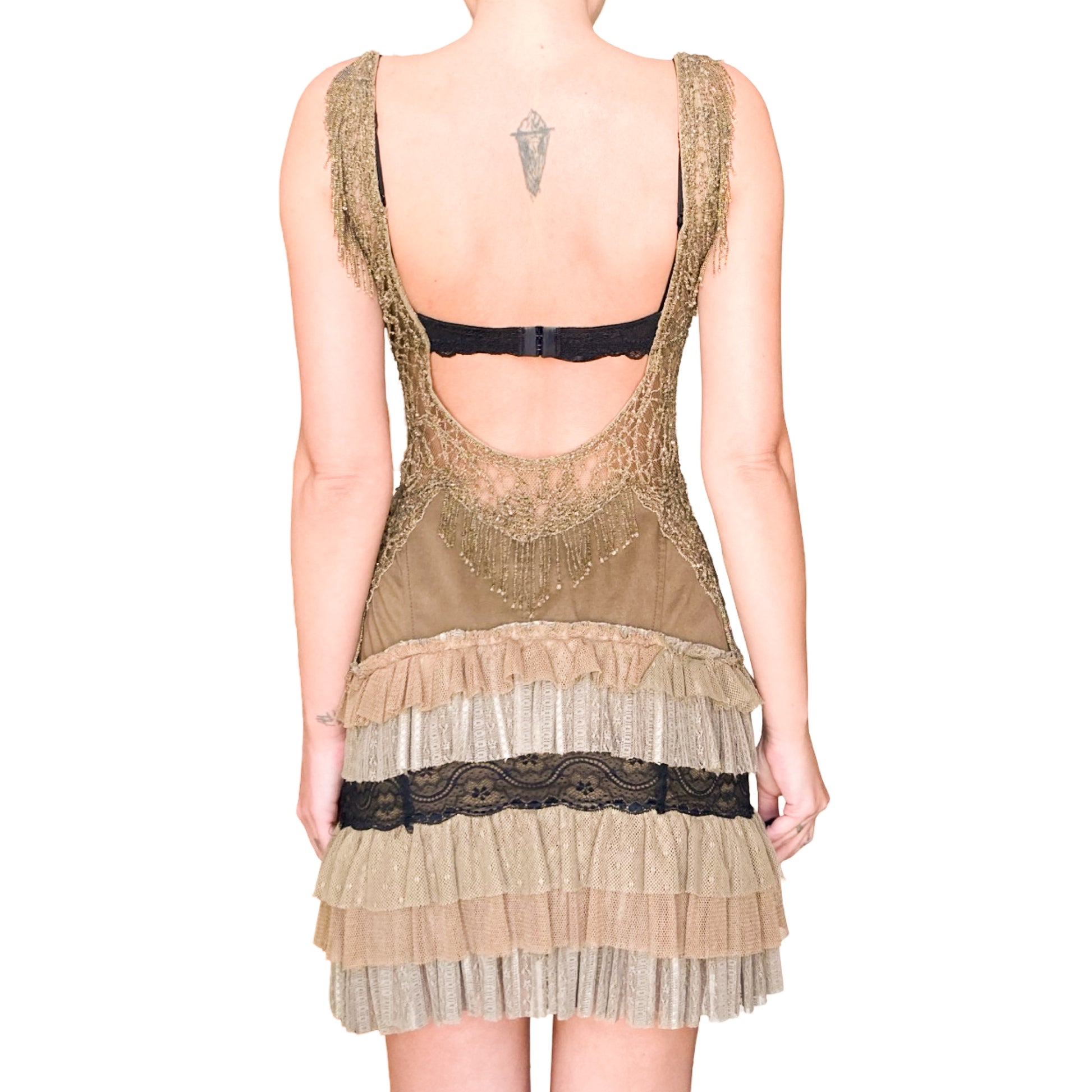 Gaetano Navarra dress from the 2006 Spring-Summer collection. Made of cotton stretch fabric, it features intricate golden beaded fringe detailing on the shoulders and open back adorned with lace & beads also. What a stunner !!!! The front includes corset-style hook-and-eye closures, while the skirt is crafted with layered ruffles in earthy tones, accented by a bold black lace trim. There is a contrasting built in bra, with adjustable straps for a push up effect ! The top version of this gorgeous dress was seen on the runway.