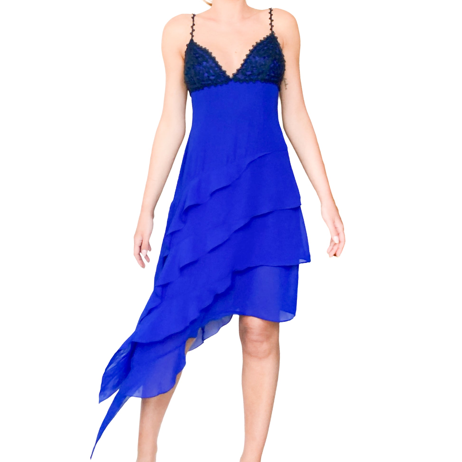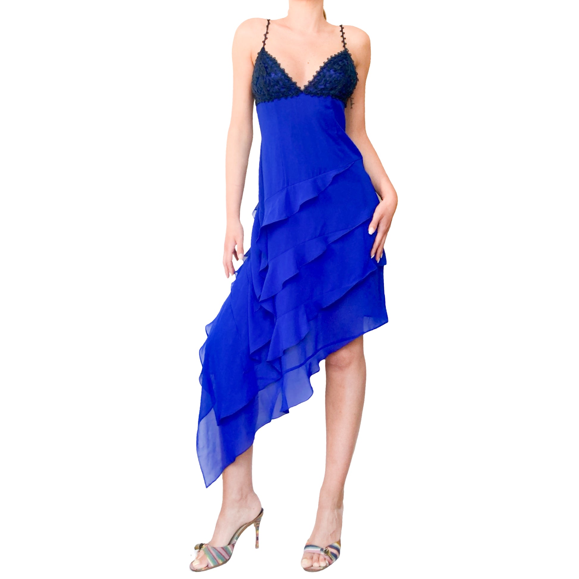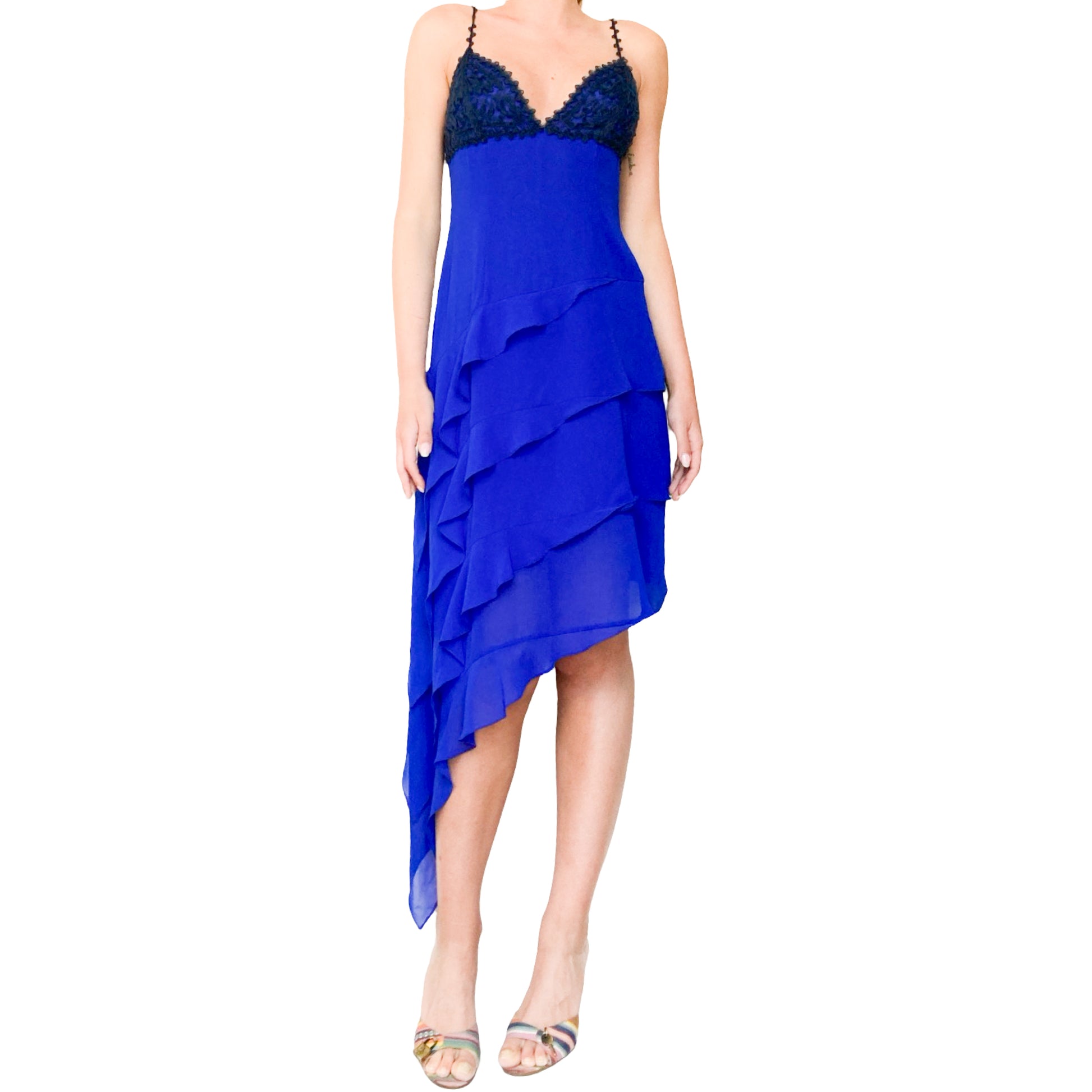 This electric blue asymmetrical dress features multiple ruffled layers at the hem and intricate dark blue embroidery on the bodice and straps. It includes a side zipper and is made from a (it seems to be a ) synthetic material, fully lined for comfort. This babe is from the Couture Line of the designer.