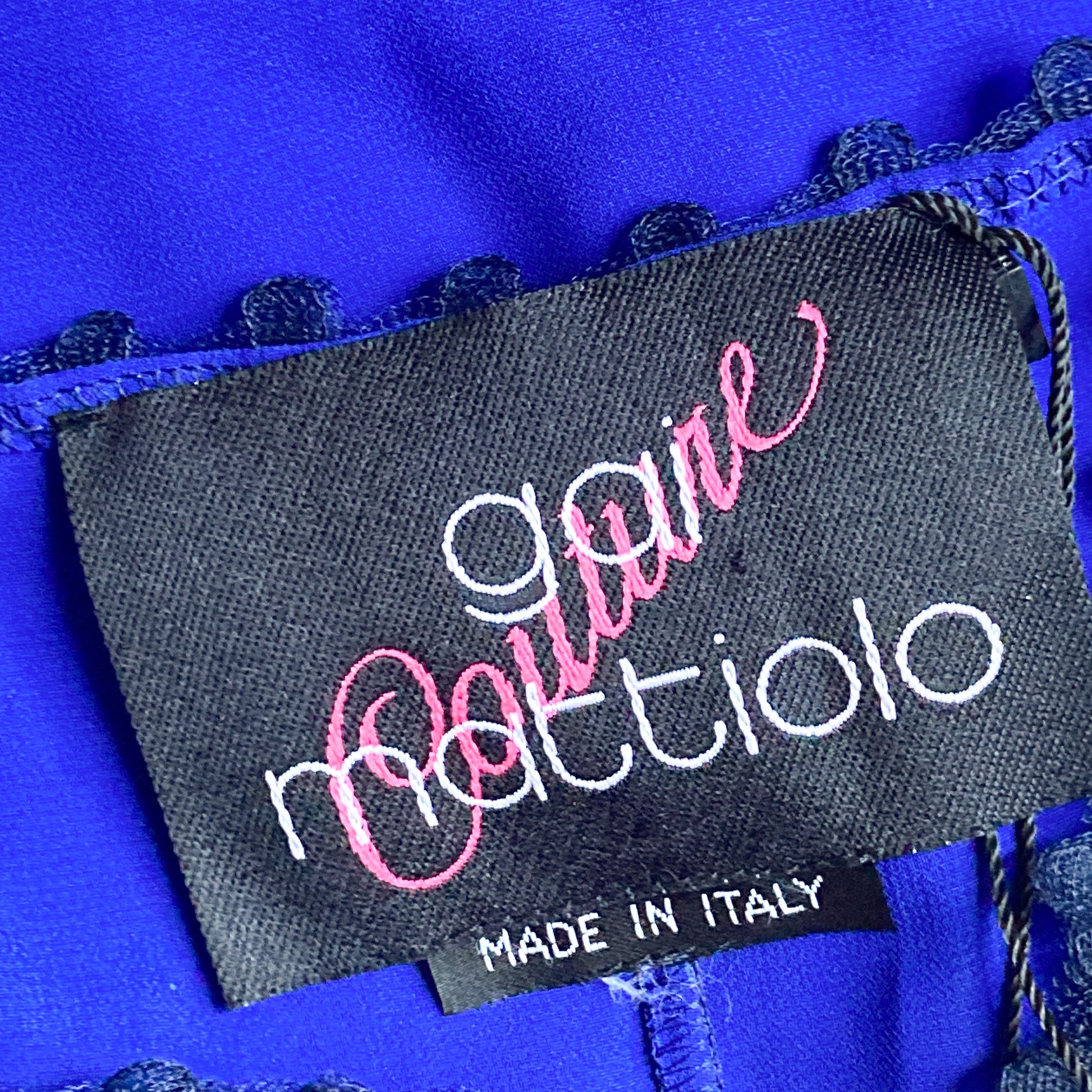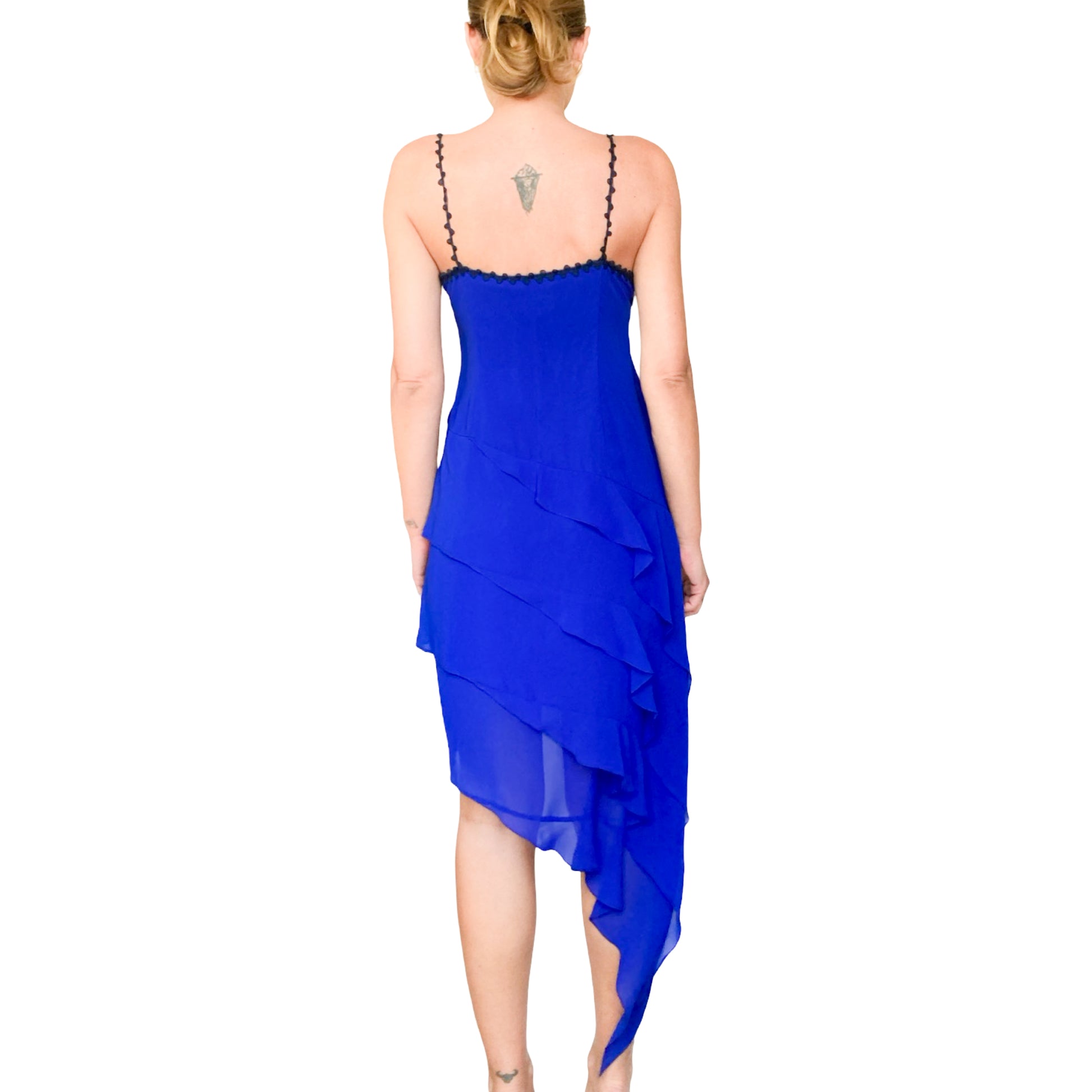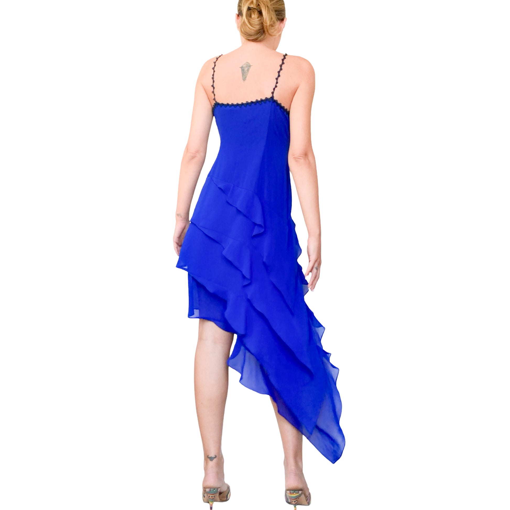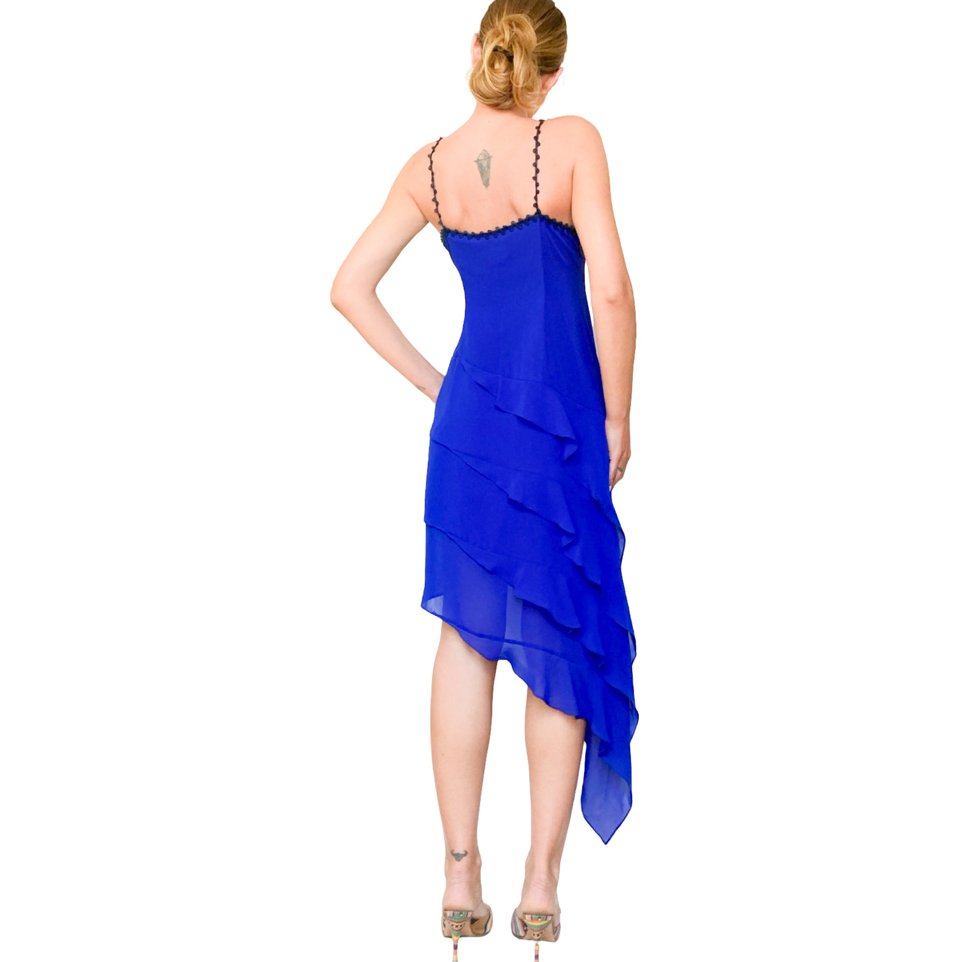 This electric blue asymmetrical dress features multiple ruffled layers at the hem and intricate dark blue embroidery on the bodice and straps. It includes a side zipper and is made from a (it seems to be a ) synthetic material, fully lined for comfort. This babe is from the Couture Line of the designer.