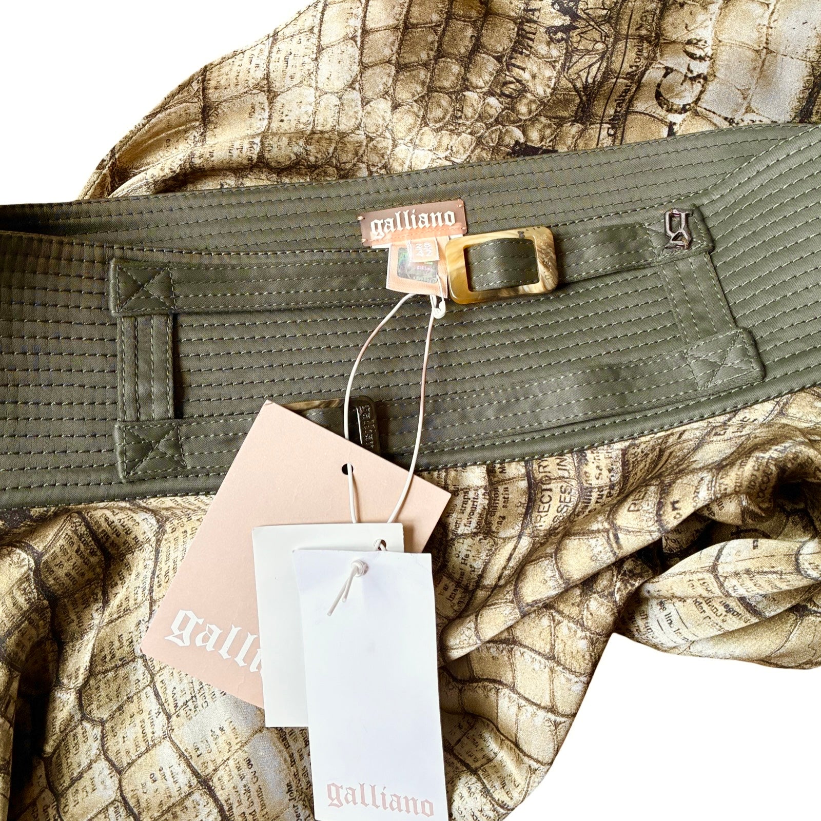Silk skirt in bronze–kaki Gazette print with a superimposed reptile skin pattern. Wide structured waistband designed like a ceinturon, with two non-adjustable signed straps and metal buckles. Invisible side zip. Fluid cut with generous movement.