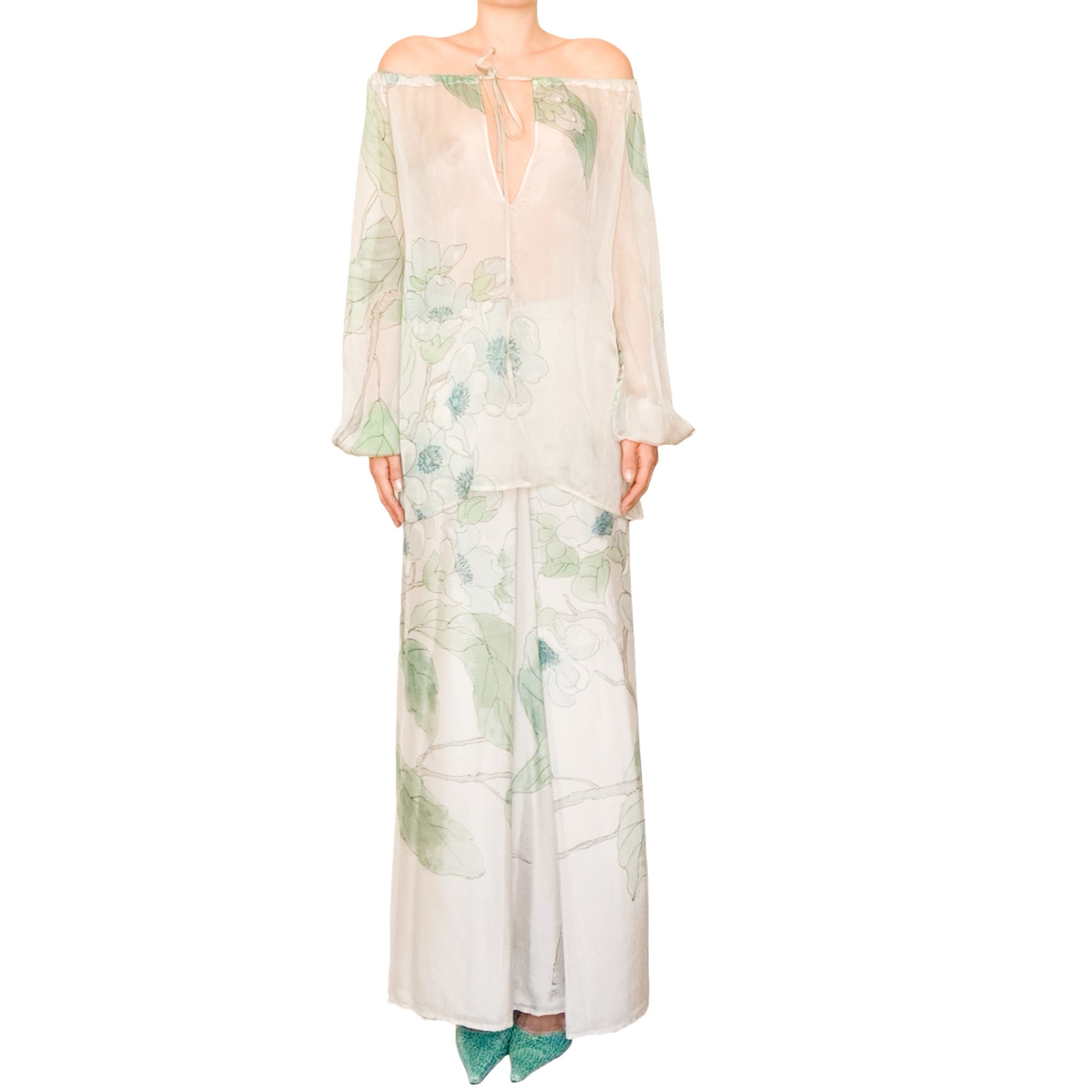 Silk set featuring a long fluid skirt and a versatile blouse in sheer silk with a delicate watercolor floral print. The skirt is fully lined with soft front pleats and a side zipper, creating an elongated silhouette. The blouse can be styled off-shoulder or with covered shoulders thanks to its drawstring neckline, and the ties allow it to be worn loose, cropped, or cinched for different effects. Billowy sleeves finish with elastic cuffs, adding a subtle volume. The blouse is slightly sheer, while the skirt remains completely opaque. For XS sizes and smaller busts, the skirt can also be worn alone as a straight strapless dress.