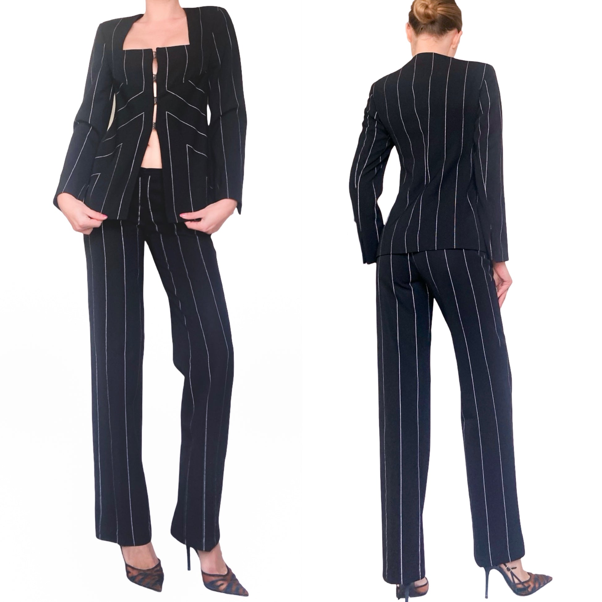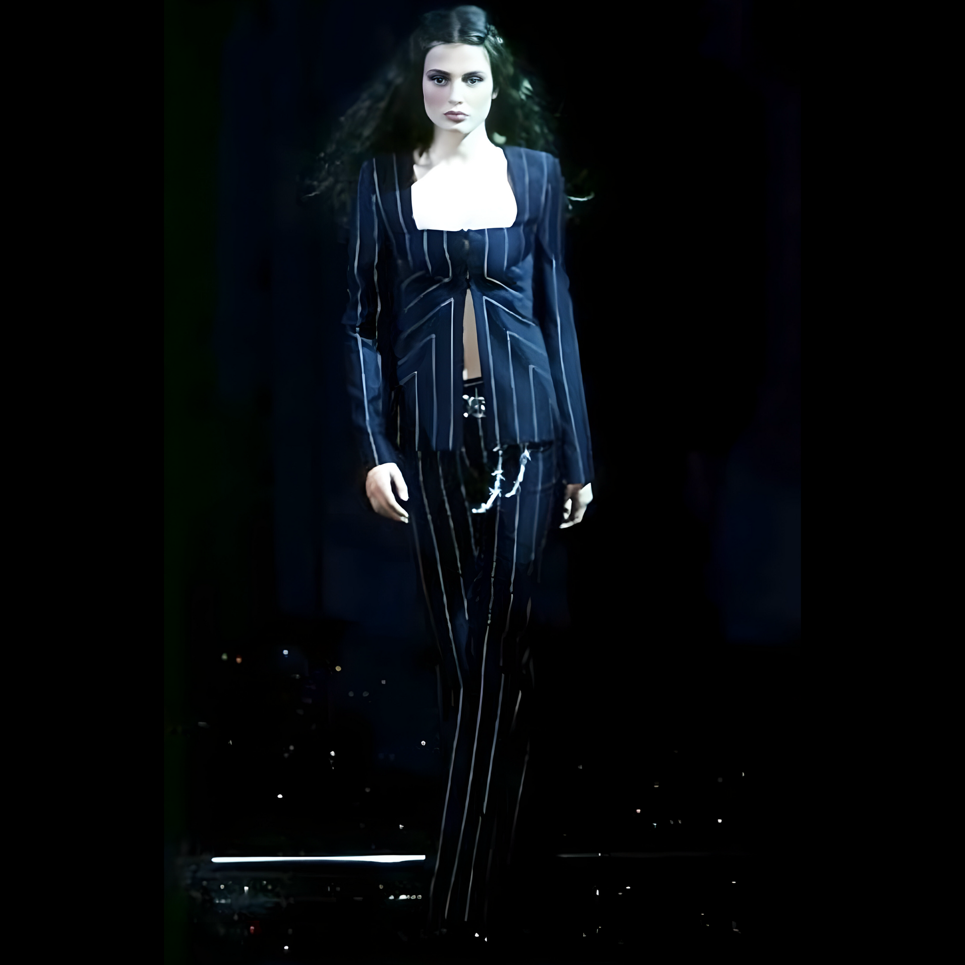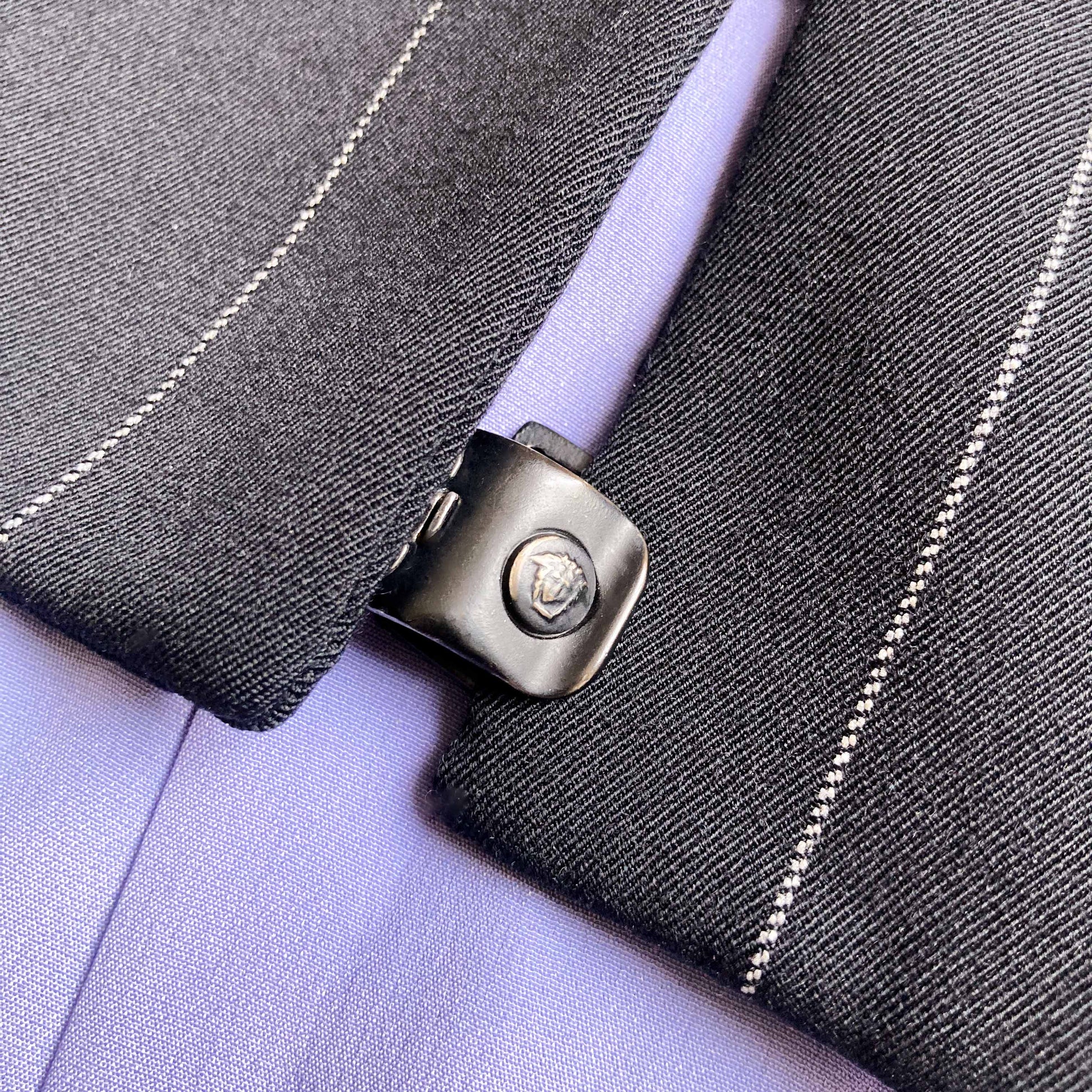 The chicest suit is from Gianni Versace’s Fall/Winter 1998 collection, featuring a structured, square neckline jacket with angular cuts, fastened by signature Medusa clasp closures. The jacket has sharp lines with white pinstripes that create an optical illusion effect, enhancing the figure's silhouette. The pants follow the same pinstripe pattern, tailored for a sleek, elongated leg fit. The attention to detail includes the iconic Versace Medusa buttons and interior lilac silk lining, a luxurious touch that contrasts with the black suit. A true collector treasure ! Seen on the runway & shot for the official campaign.