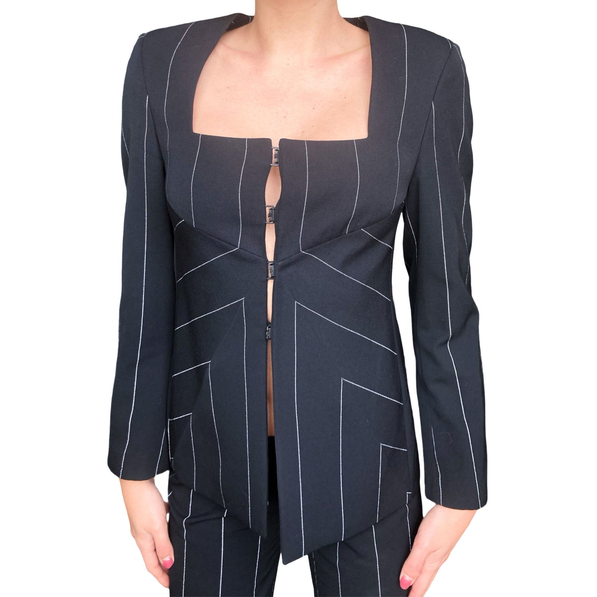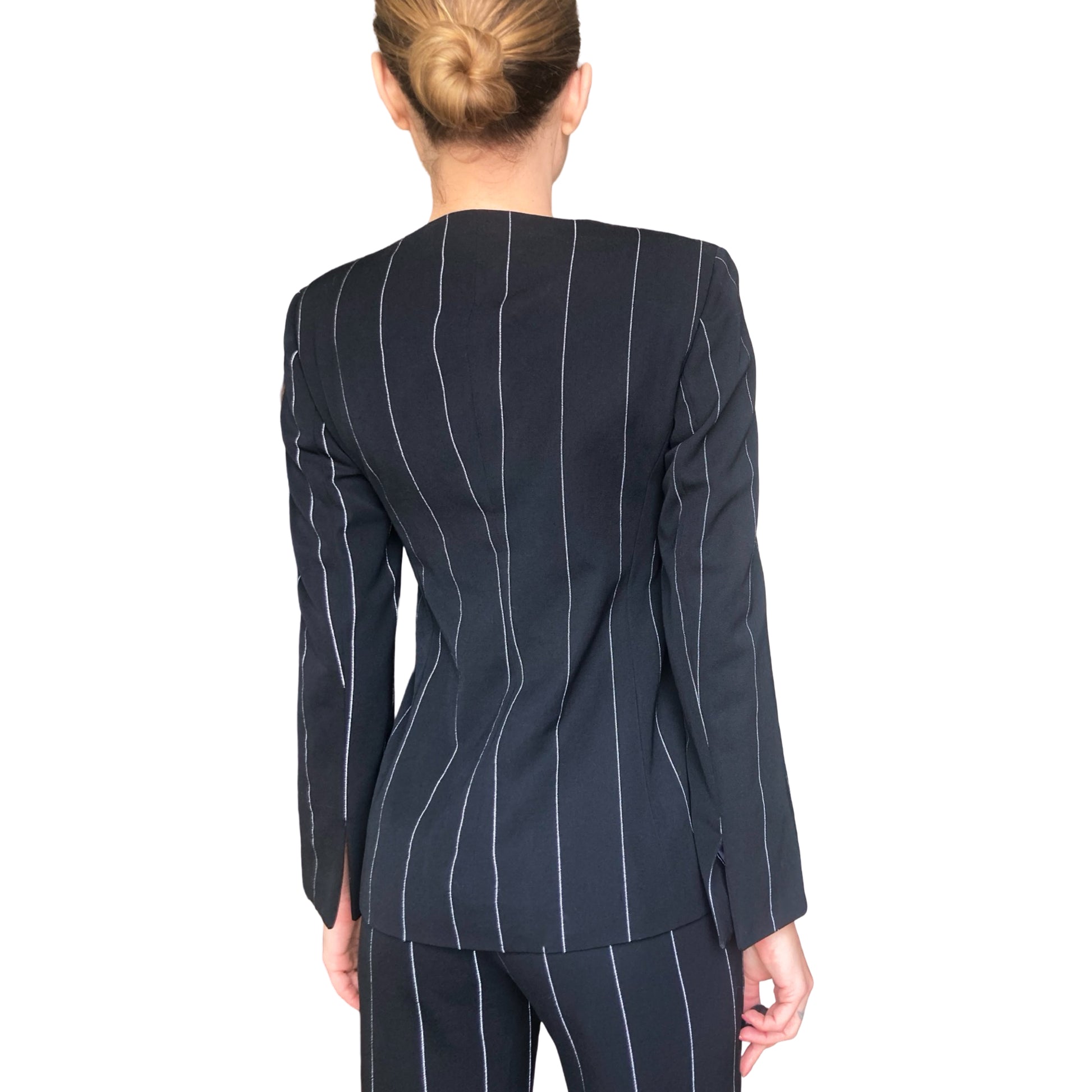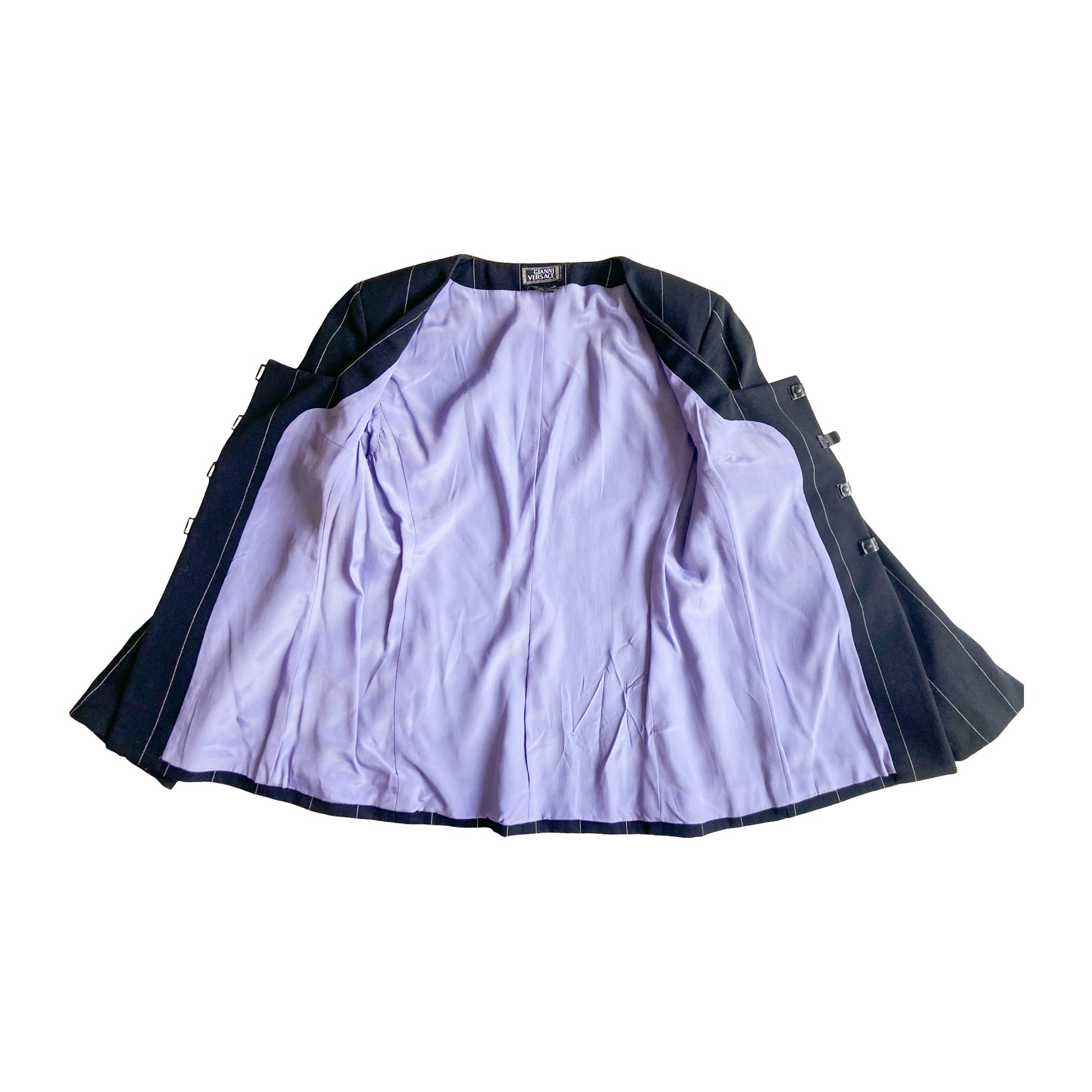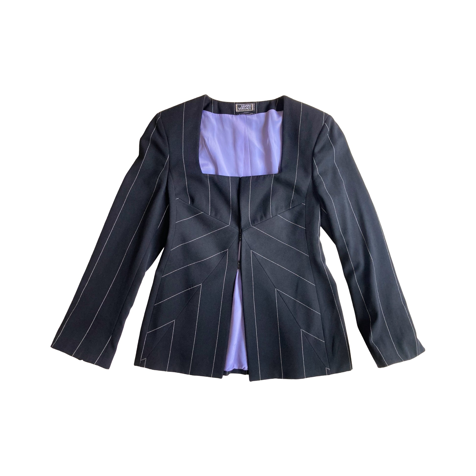 The chicest suit is from Gianni Versace’s Fall/Winter 1998 collection, featuring a structured, square neckline jacket with angular cuts, fastened by signature Medusa clasp closures. The jacket has sharp lines with white pinstripes that create an optical illusion effect, enhancing the figure's silhouette. The pants follow the same pinstripe pattern, tailored for a sleek, elongated leg fit. The attention to detail includes the iconic Versace Medusa buttons and interior lilac silk lining, a luxurious touch that contrasts with the black suit. A true collector treasure ! Seen on the runway & shot for the official campaign.